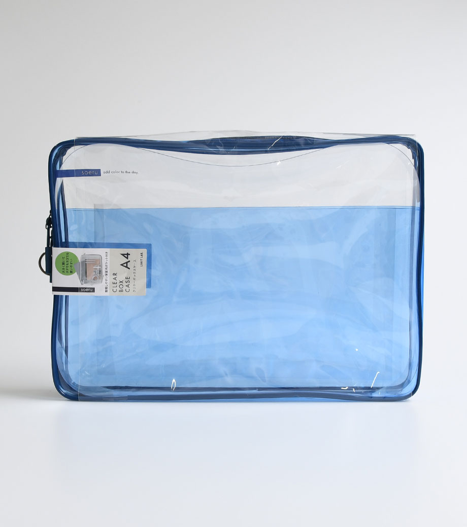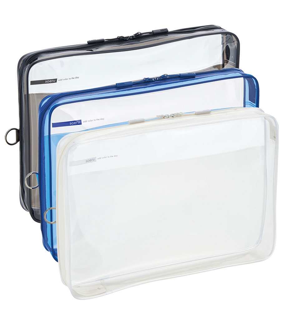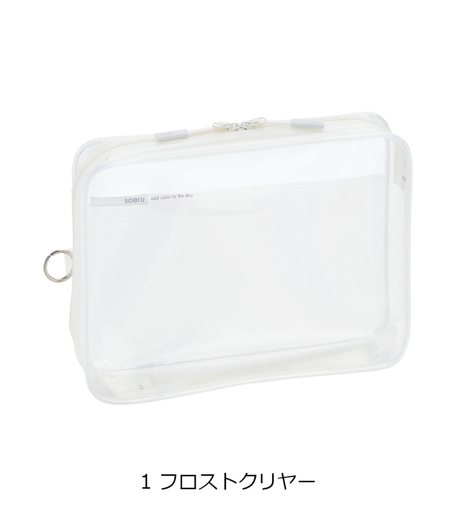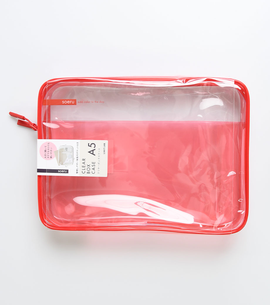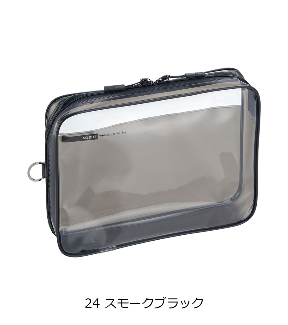 リヒトラブ soeru クリヤーボックスケース A5は、L字に大きく開いて出し入れしやすいケースです。開閉に便利なダブルファスナーで縦にも横にも使えます。ファスナーと同色の内ポケットがおしゃれなカラーリング。暮らしに彩りを“そえる”文具メーカーLIHIT LAB.(リヒトラブ)の商品です。側面のリングは、吊り下げたりキーホルダーを付けることができます。耐久性があり軽量なPVC素材を使用。A5ノートや手帳、小型タブレットの収納はもちろん、水着ポーチや旅行時のアメニティ入れとしても使えます。