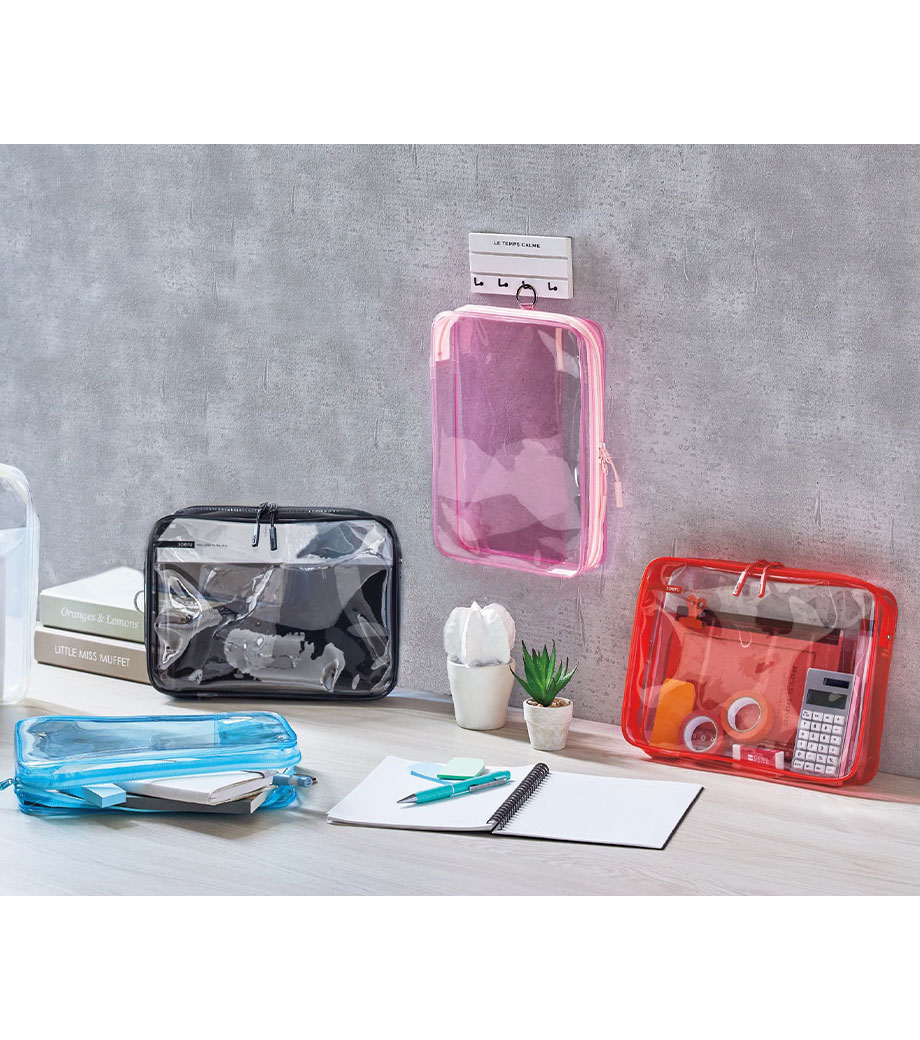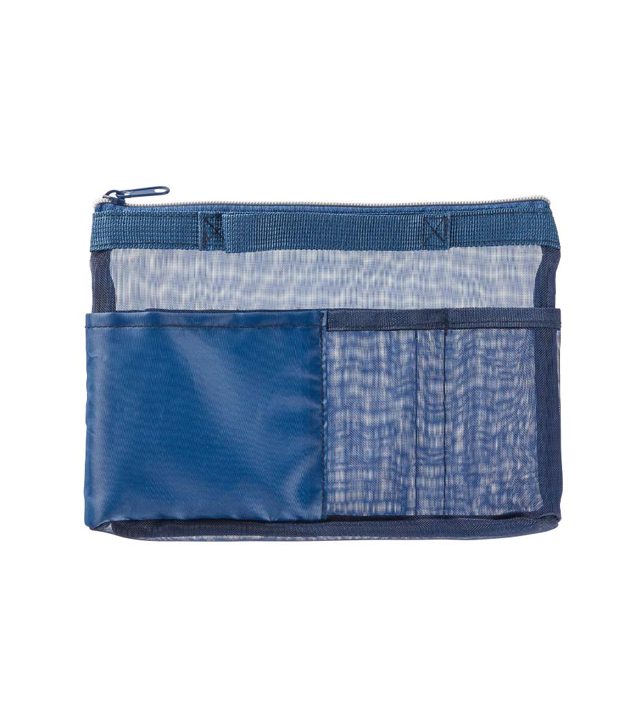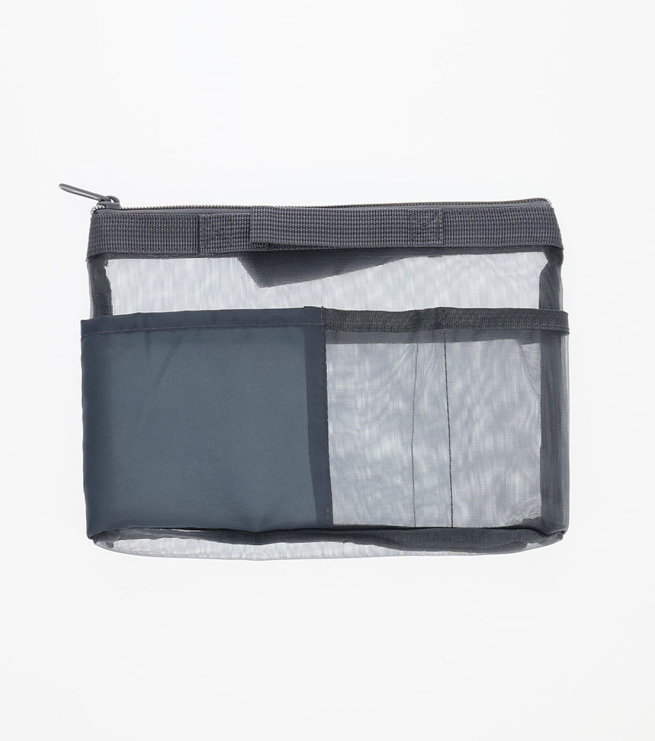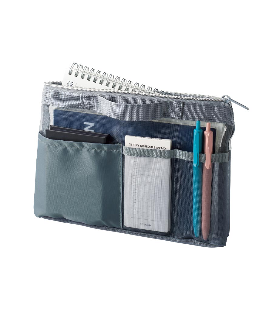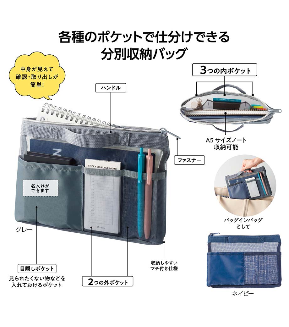 中に何が入っているか一目でわかる人気のメッシュポーチ! 内側・外側に3つずつ小分けポケットがあり、文具やガジェットなどの整理に最適です。A5サイズのノートや手帳がすっきり収まるサイズ感で通勤・通学のバッグインバッグとしても大活躍。フラットなハンドルで持ち運びや出し入れもスムーズです。ファスナー付きでしっかり閉じられるため、中身がこぼれる心配もありません。