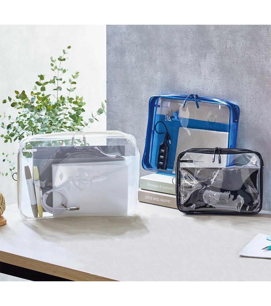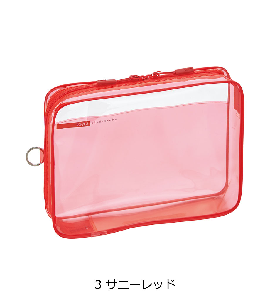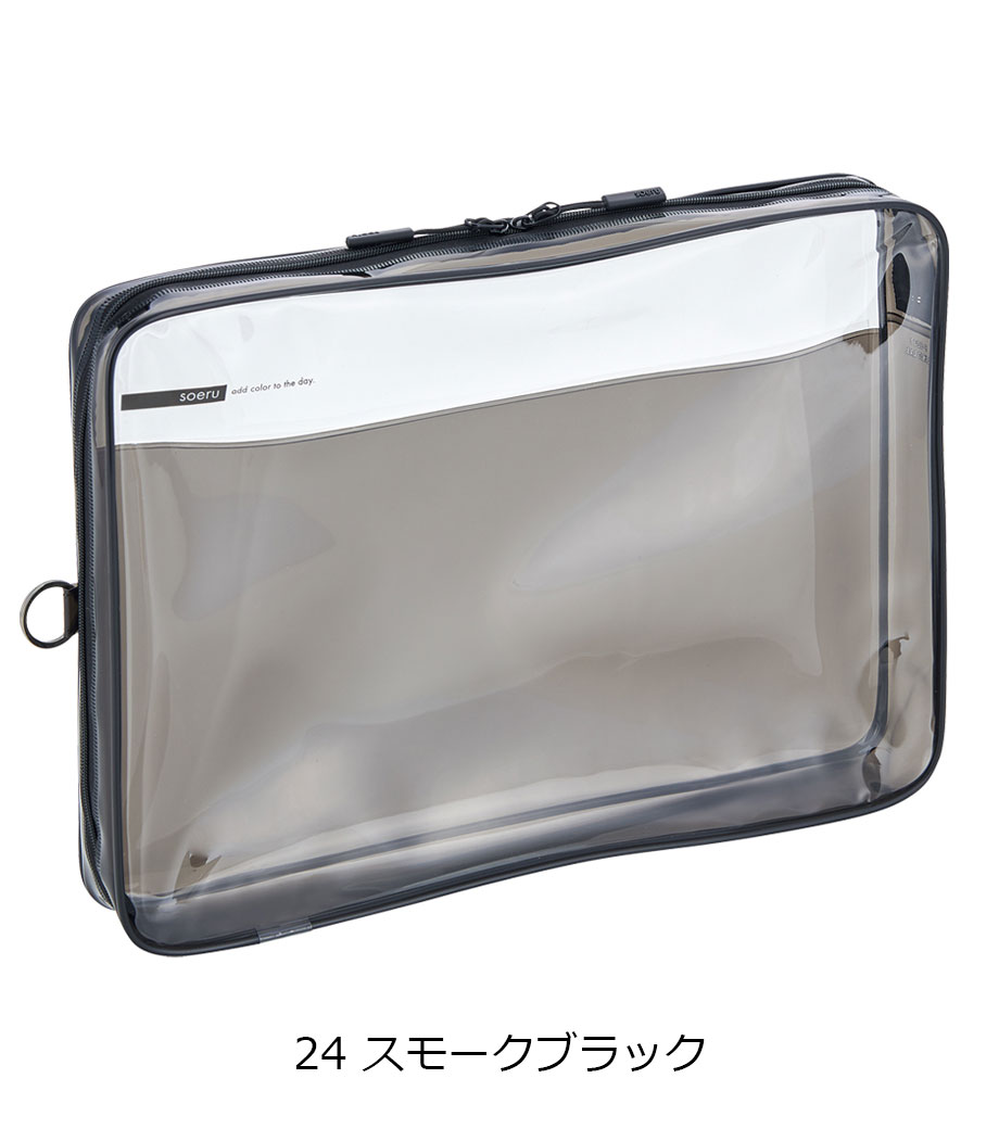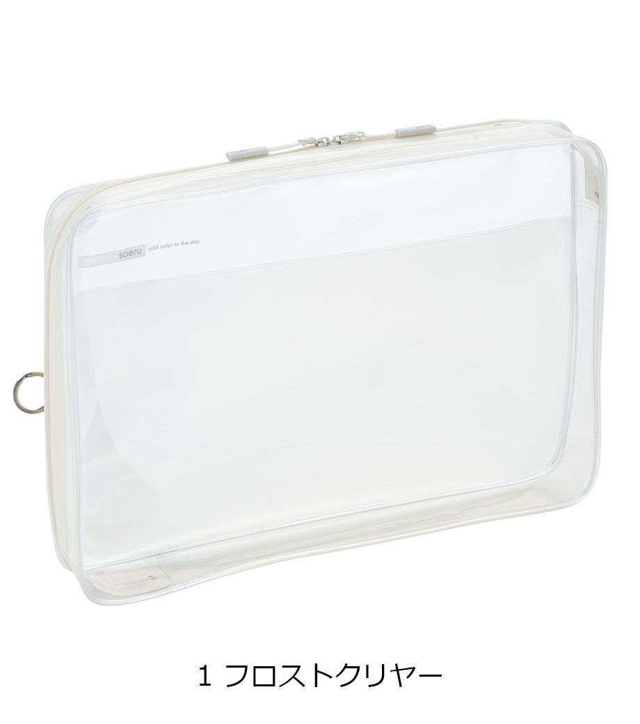 リヒトラブ soeru クリヤーボックスケース A4は、L字に大きく開いてA4ファイルも出し入れしやすい収納ケースです。開閉に便利なダブルファスナーで縦にも横にも使えます。おしゃれな色付き内ポケットには小物を分けて入れられます。暮らしに彩りを“そえる”文具メーカーLIHIT LAB.(リヒトラブ)の商品。側面のリングは、吊り下げたりキーホルダーを付けることができます。耐久性があり軽量なPVC素材を使用。中身が見える収納で書類整理に大活躍!バッグインバッグとしても使えます。