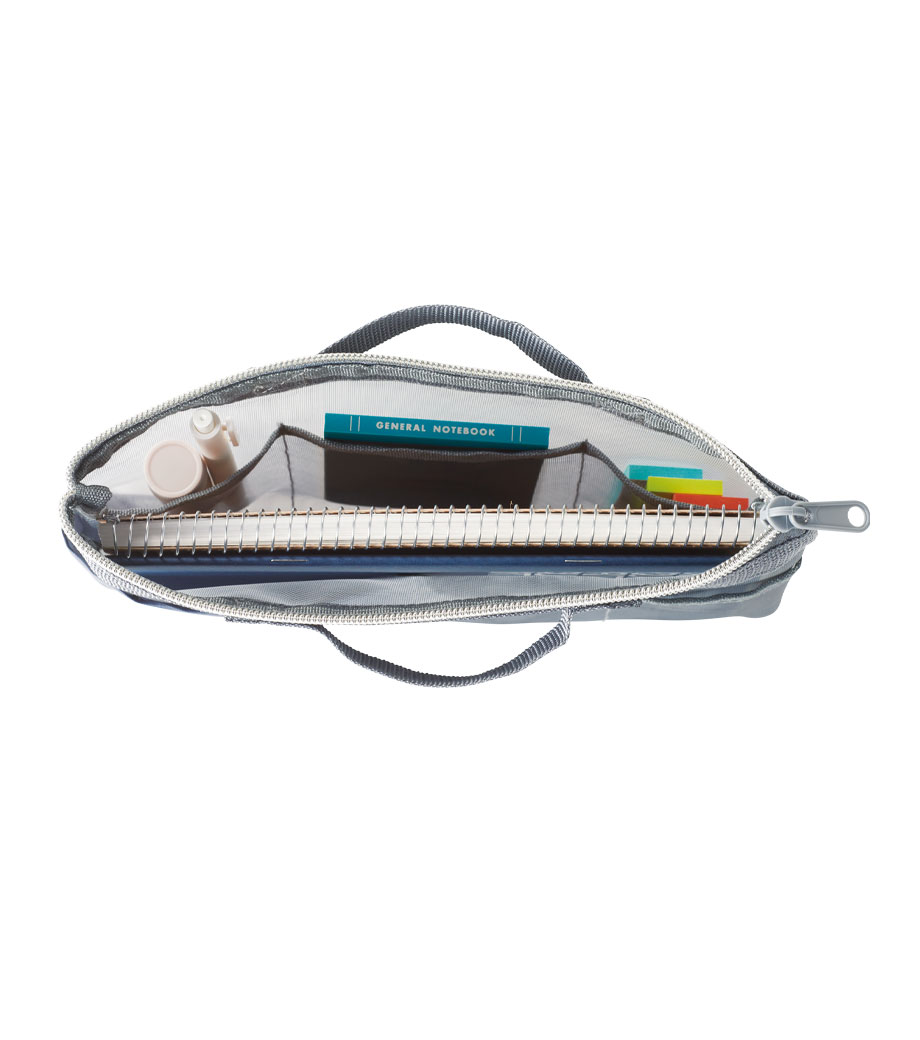 文房具やデジタルガジェットの仕分けに便利な収納バッグ。内側にはペンが入るサイズのファスナー付きメッシュポケットが1つと、スマホが入るくらいのミニポケットが2つ付いています。外側もポケット付きでメモ帳やスマホを入れておけます。片面を倒してゴムで留めることで中身を確認しやすい形態にチェンジ可能。自立するので作業アイテムをまとめて机に置いておけます。
