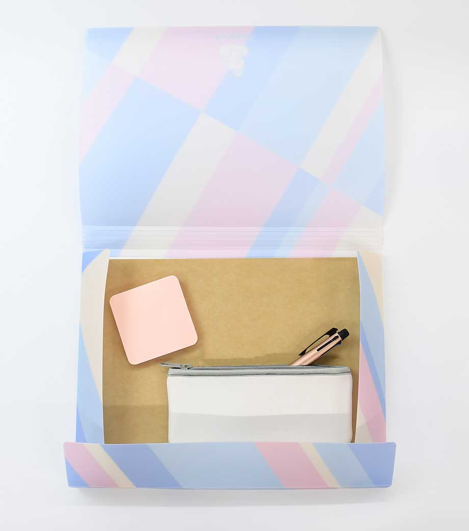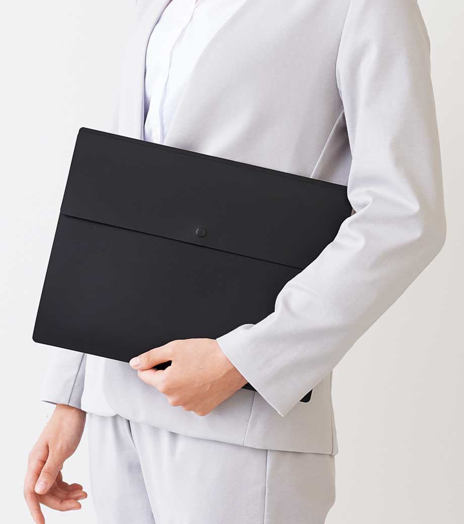 会議の書類をさっと挟み、ノートもすばやく書き込め、必要なメモをポケットに仕分けて入れておけるので、クリアファイルのようにごちゃごちゃになりません。通勤鞄に入れてもノートが折れることがなく、デスクに着いてすぐに仕事に取り掛かれるので作業効率UP間違いなし。