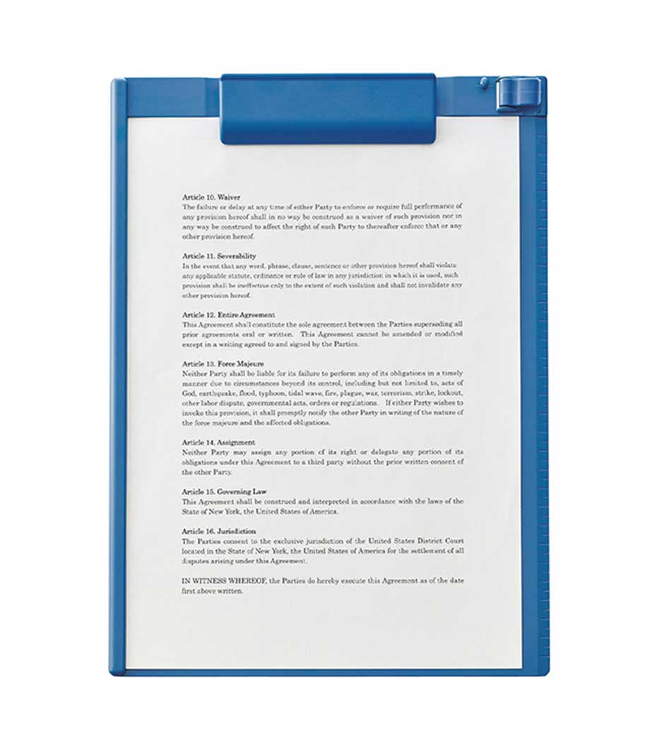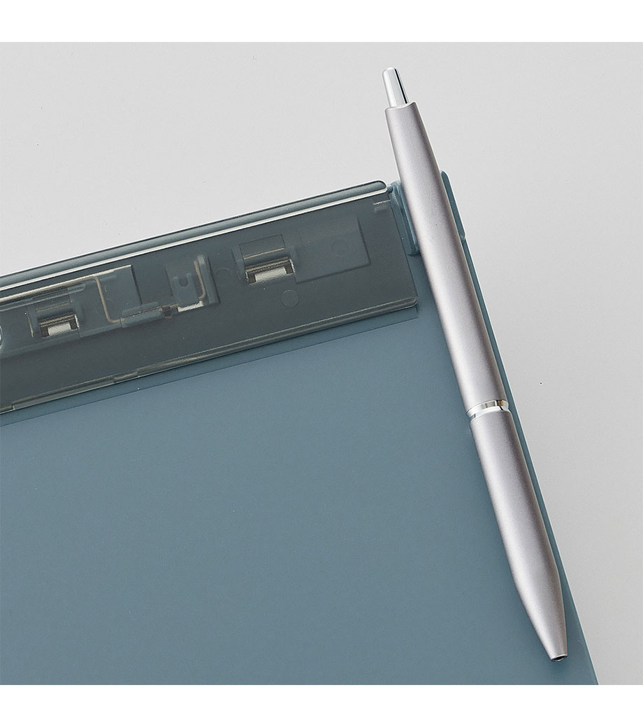 AQUA DROPs クリップファイル(A4)は、ボード面がしっかりしているので、机や書く場所がないときでも、立ったまま記入できるファイルです。一般的なクリップボードとは違い、スライド式のクリップを採用。バチンと音を出すこともなく、クリップの開閉と同時に紙押さえも開くので、用紙の抜き差しがスムーズに行えます。
