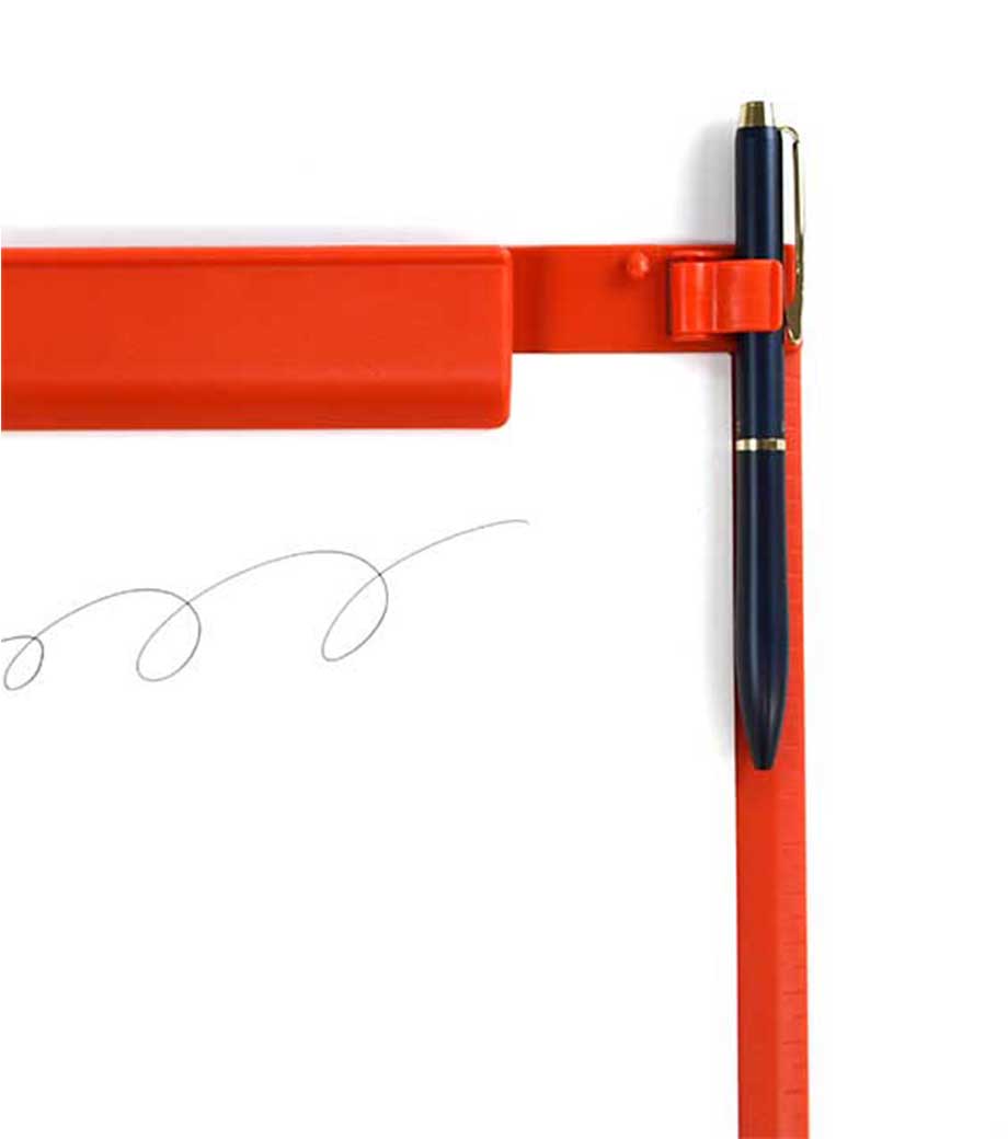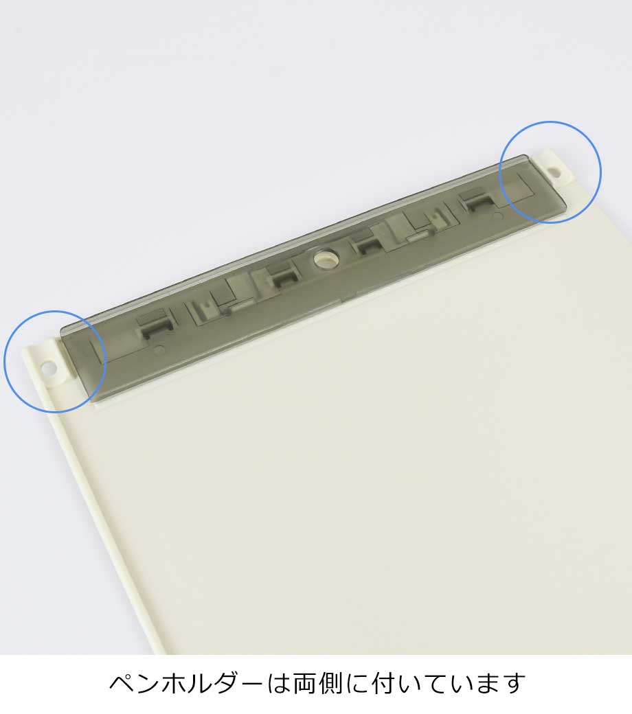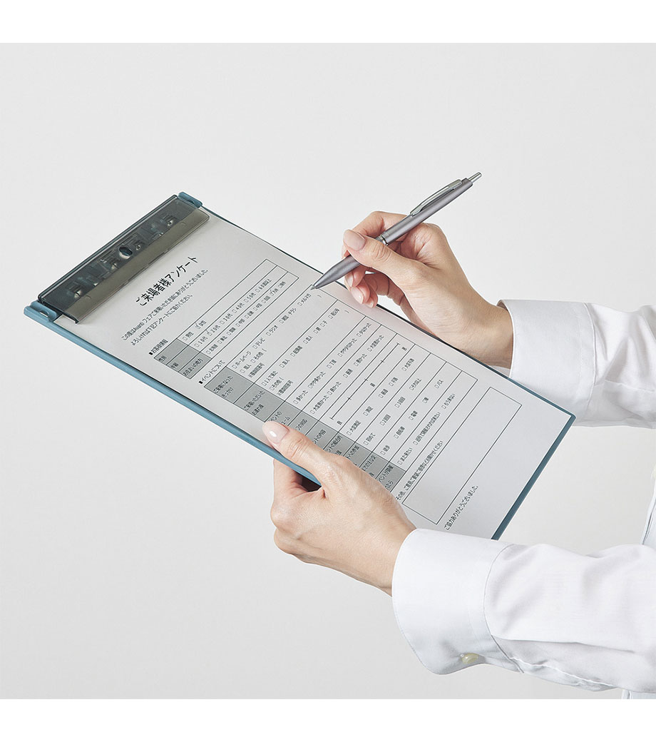 片手で簡単にオープン&ロックできる縦型のクリップボード。工夫いっぱいのユニバーサルデザインです。クリップを開いたままで固定できるロック機能付き。表面は書きやすいエンボス加工で、A4用紙を40枚収納。ペンホルダーや、用紙がきれいに揃うサイドストッパーや5mmピッチの目盛りもついています。1色でロゴを入れ、オリジナルボードを作れます。ボードが硬く手持ちでも安定して記入できるので、クリニックのカルテ記入や外回りの営業、回覧に便利です。