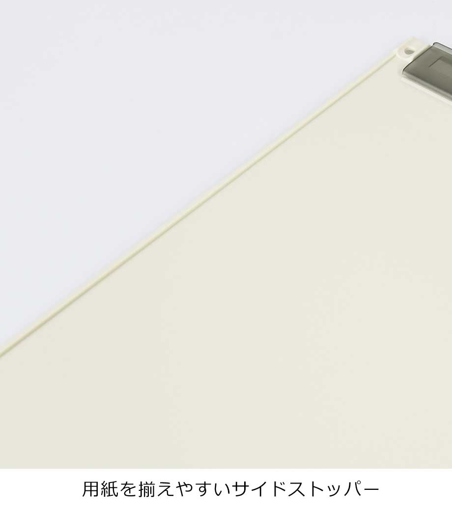 片手で簡単に開閉でき、開いた状態でロックできる横型のクリップボードです。クリップを下まで押すとレバーが起き上がり開いたままでロックするので用紙が閉じやすいロック機能付き。サイドストッパーや特殊エンボス加工した表面、ペンホルダー、5mmピッチの目盛りなど、誰もが使いやすい工夫がいっぱいです。あまり見かけない横型タイプは、会社内の掲示やスポーツのスコア表になり便利!