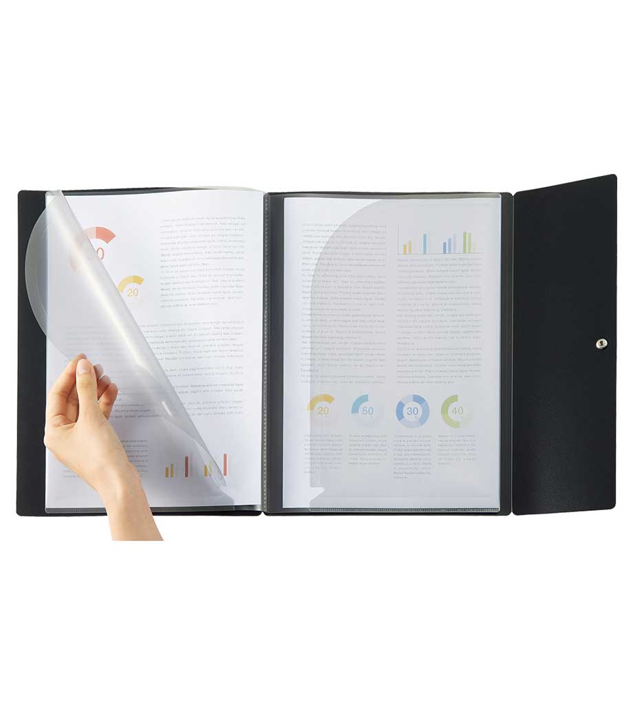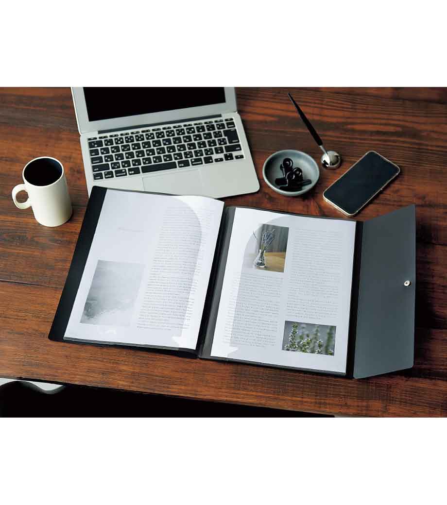 見開きでA3のコピー用紙が挟め、入れやすいラウンドタイプの厚口ポケット。A4サイズまでは10か所収納可能です。ホックボタンで留められ、スマートに持ち運べます。