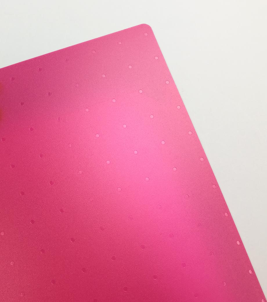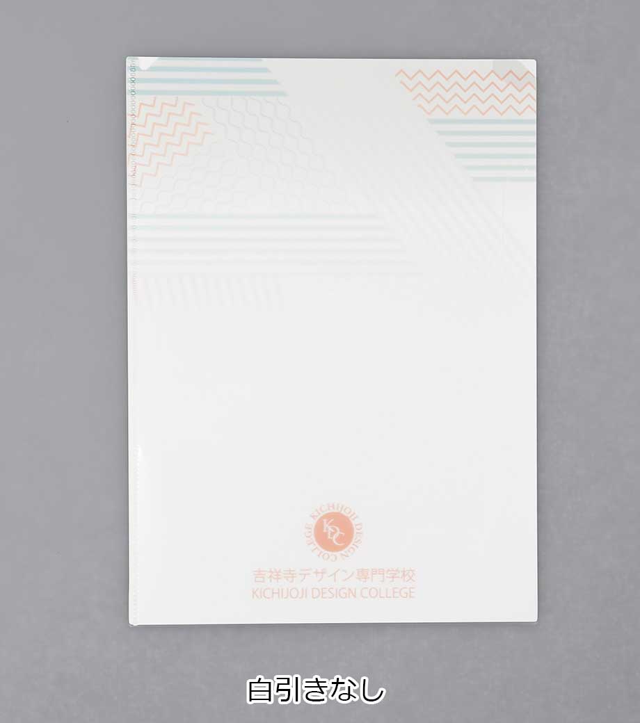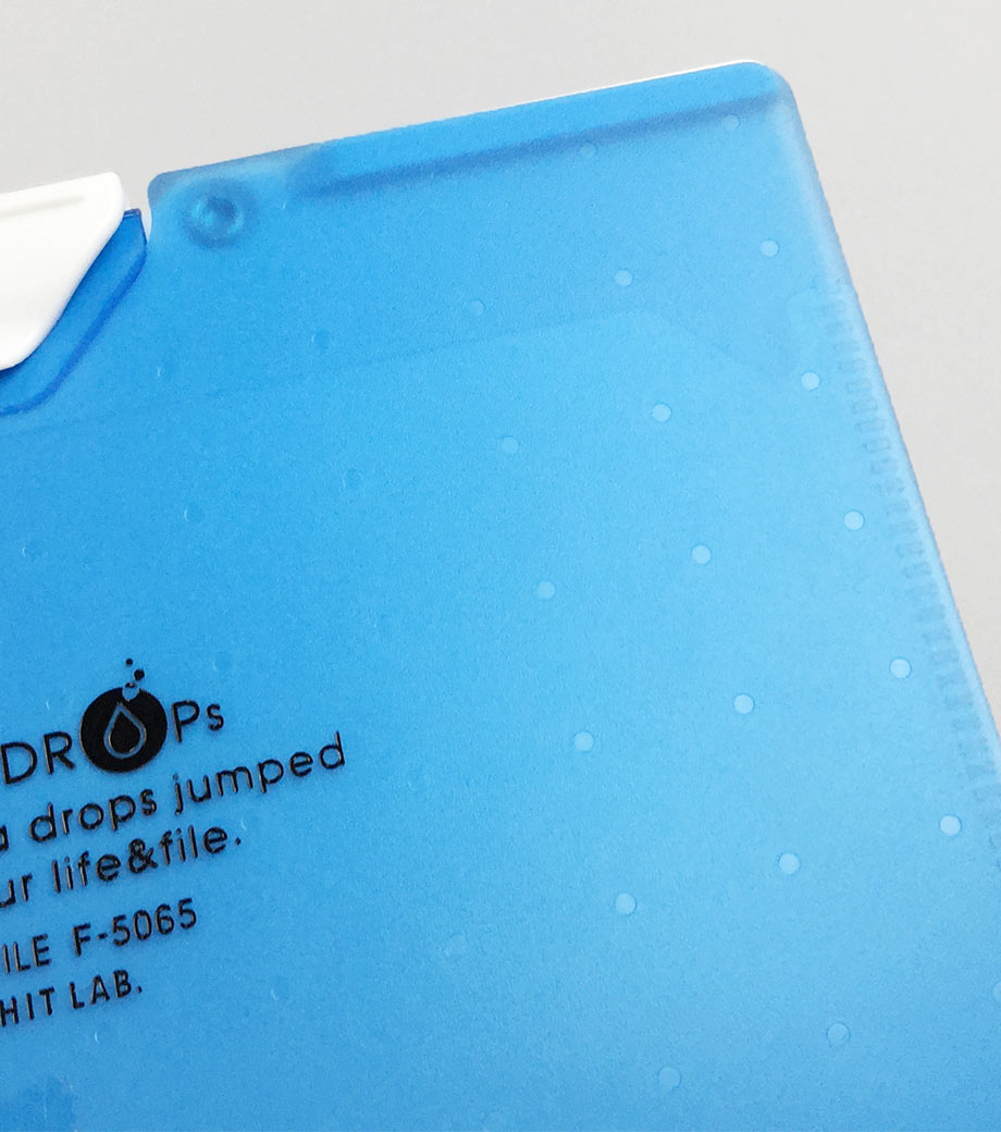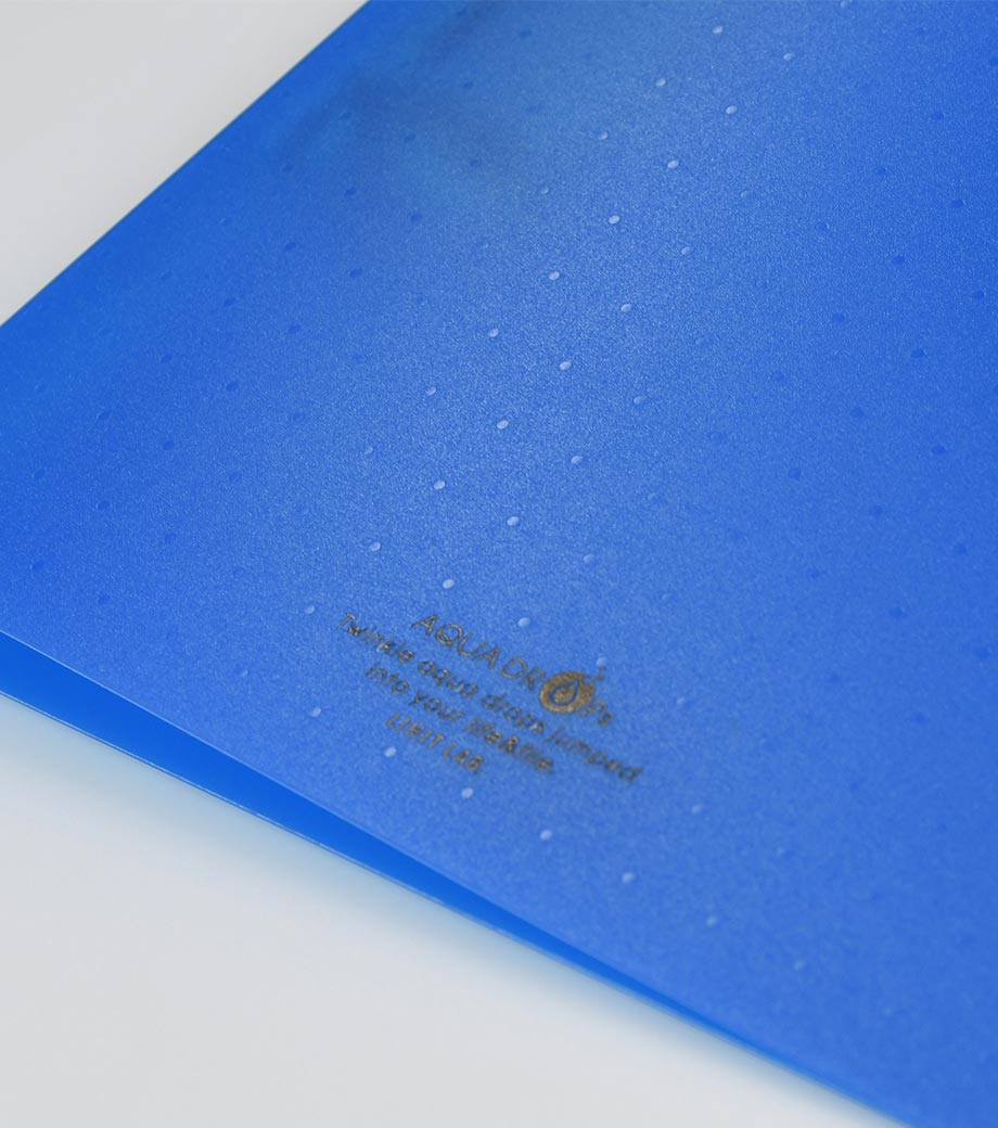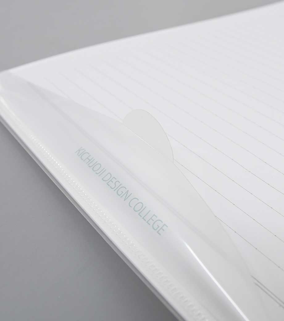 表紙には水滴をイメージしたピンドットエンボス入り。厚めのポリプロピレン製で長く使えます。表紙に1色印刷が可能で、学校名や企業名を入れたオリジナルグッズを製作できます。