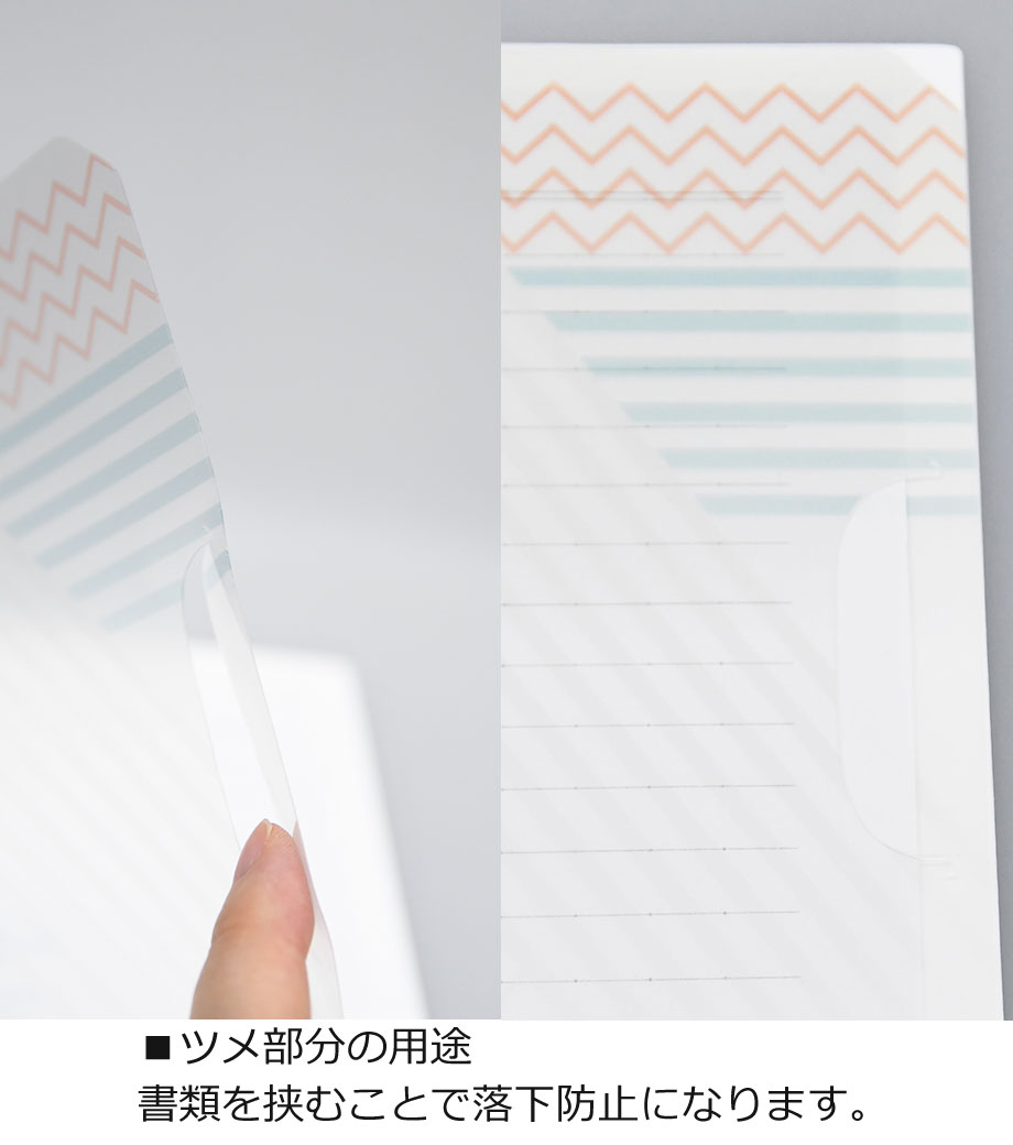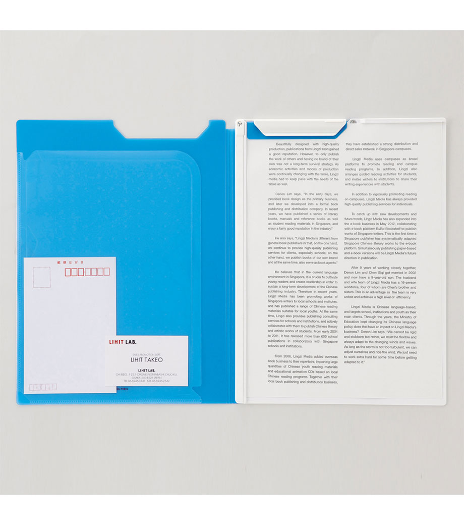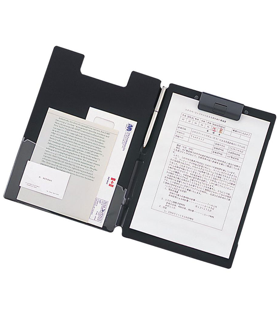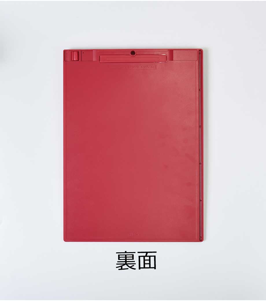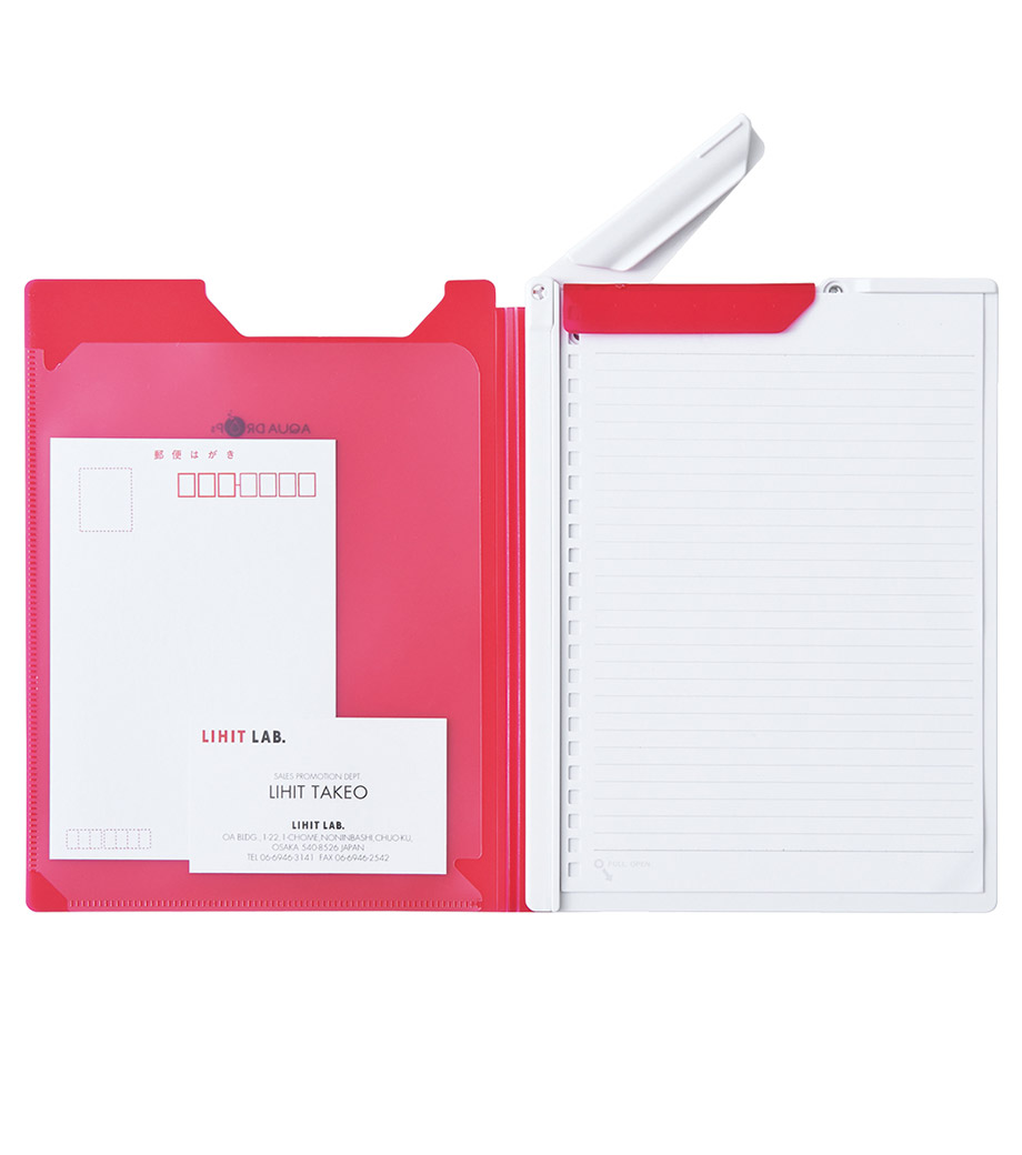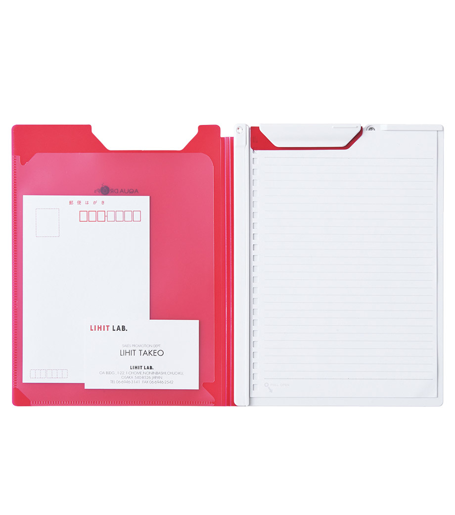 ボード面には段差が施してあるので、用紙がきれいに揃えられます。内側にはハガキや名刺を入れておける透明ポケットも付いています。使い勝手抜群のクリップファイルです。