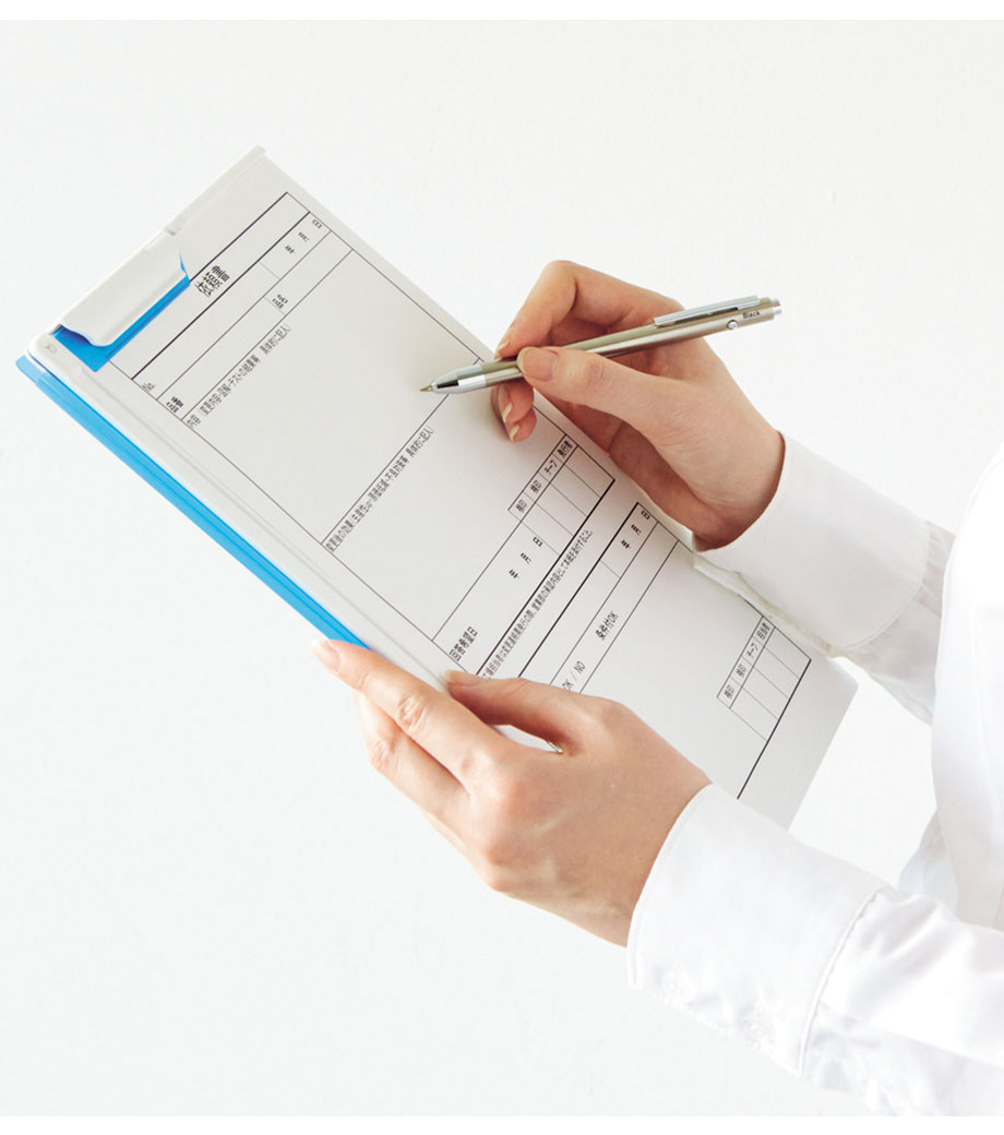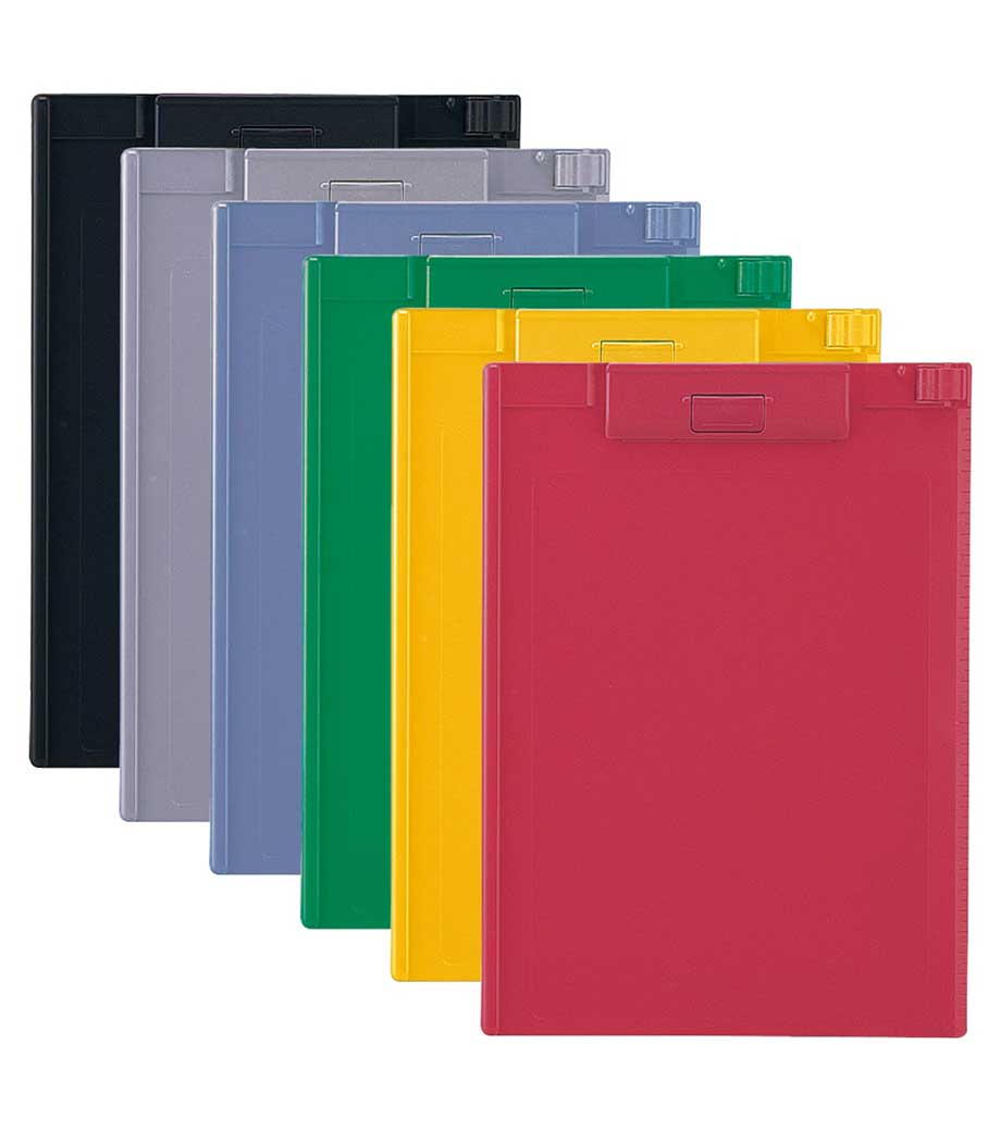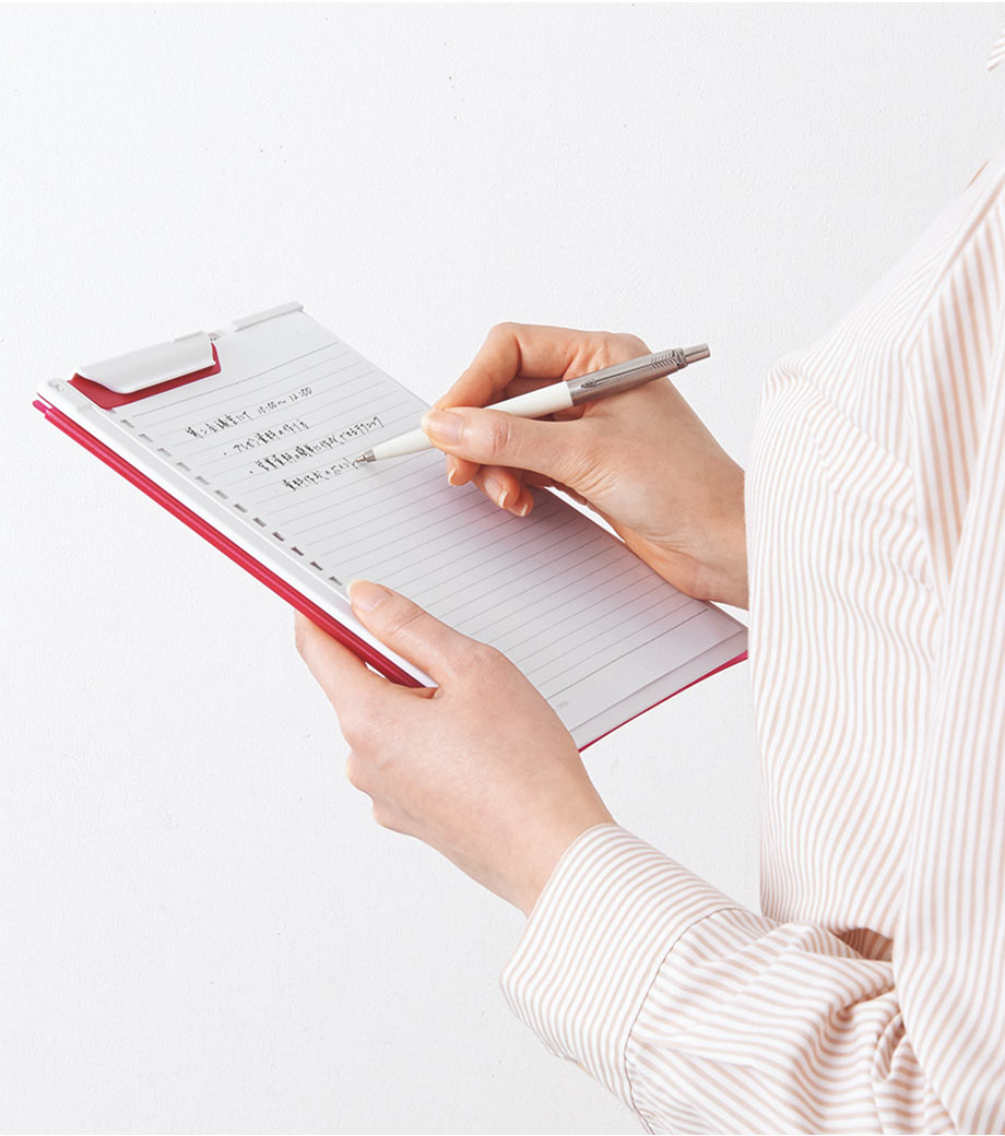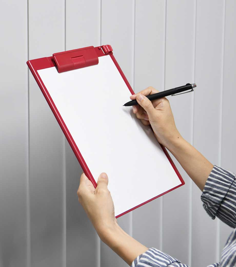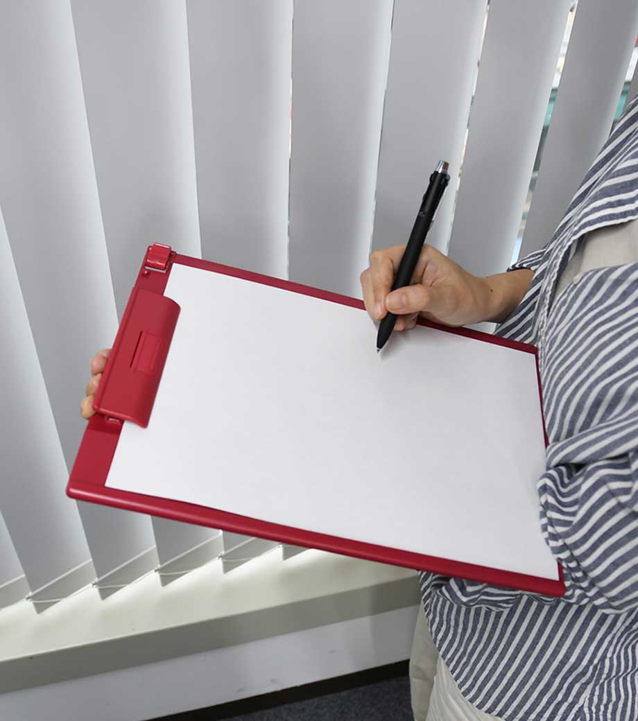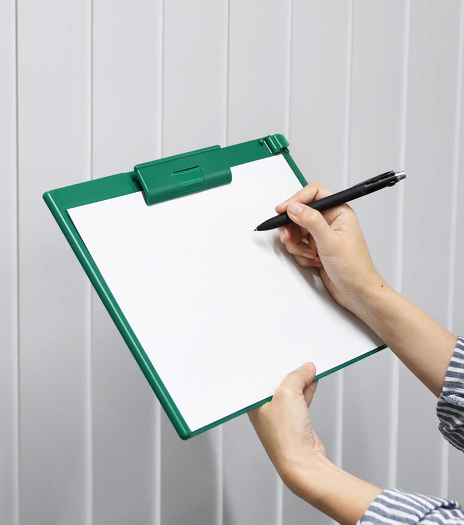 片手で簡単にオープン&ロックできる縦型のクリップボード。工夫いっぱいのユニバーサルデザインです。クリップを開いたままで固定できるロック機能付き。表面は書きやすいエンボス加工で、A4用紙を40枚収納。ペンホルダーや、用紙がきれいに揃うサイドストッパーや5mmピッチの目盛りもついています。1色でロゴを入れ、オリジナルボードを作れます。ボードが硬く手持ちでも安定して記入できるので、クリニックのカルテ記入や外回りの営業、回覧に便利です。