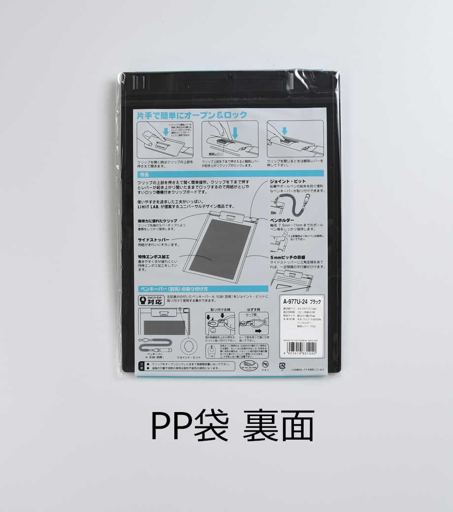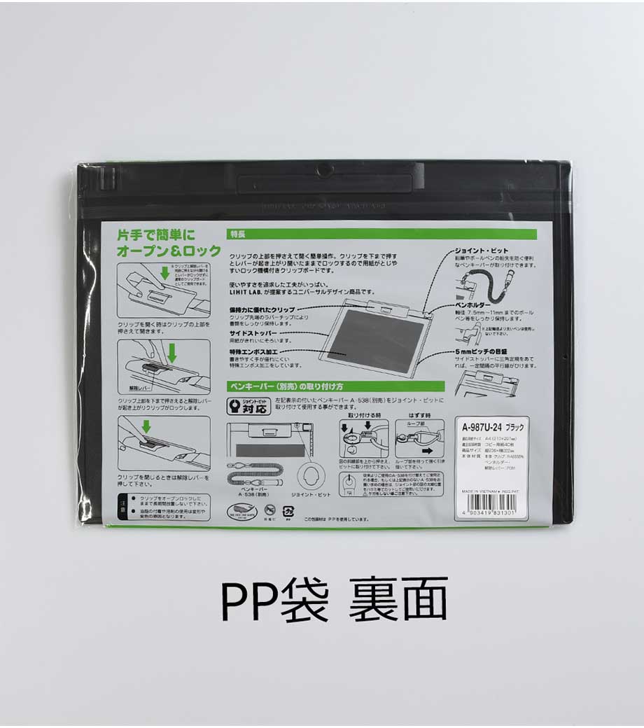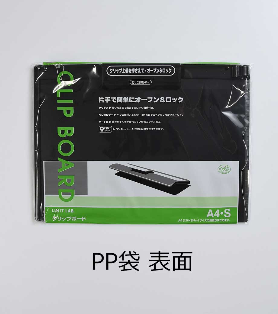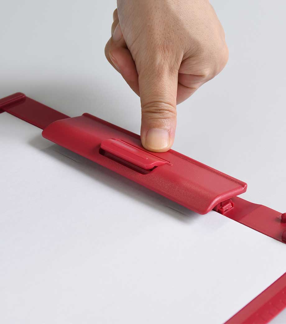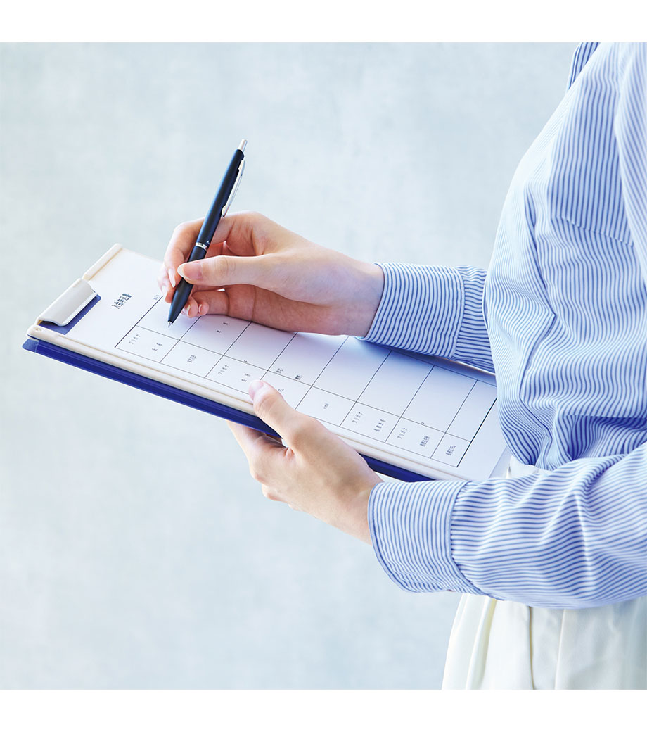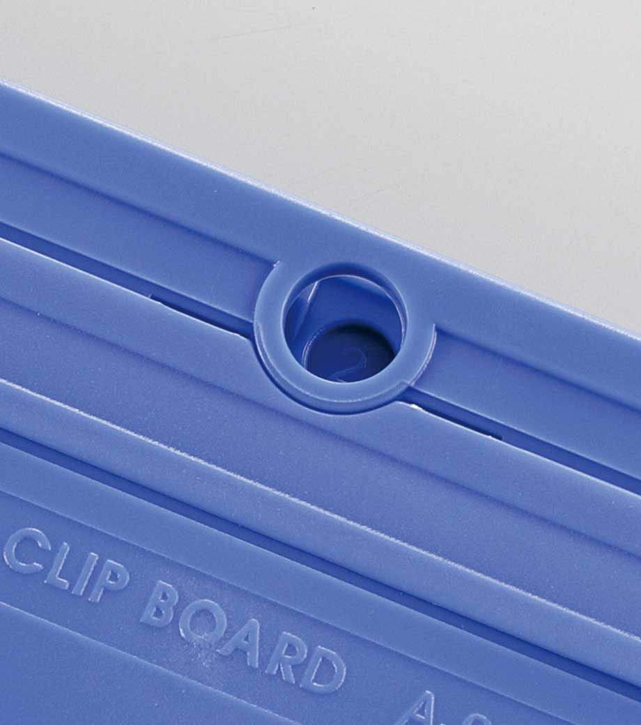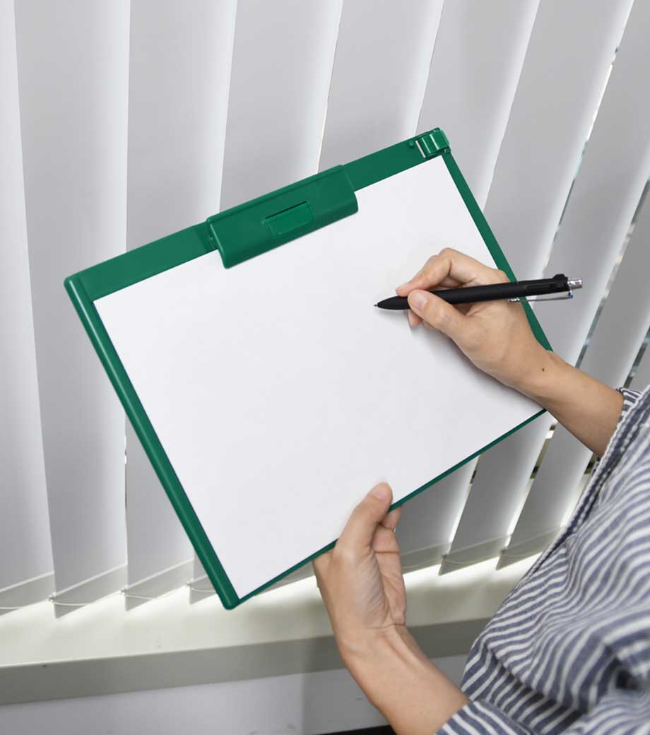 片手で簡単にオープン&ロックできる縦型のクリップボード。工夫いっぱいのユニバーサルデザインです。クリップを開いたままで固定できるロック機能付き。表面は書きやすいエンボス加工で、A4用紙を40枚収納。ペンホルダーや、用紙がきれいに揃うサイドストッパーや5mmピッチの目盛りもついています。1色でロゴを入れ、オリジナルボードを作れます。ボードが硬く手持ちでも安定して記入できるので、クリニックのカルテ記入や外回りの営業、回覧に便利です。