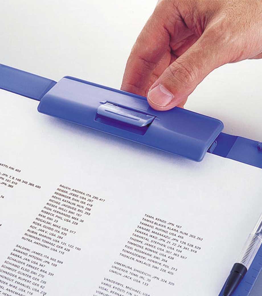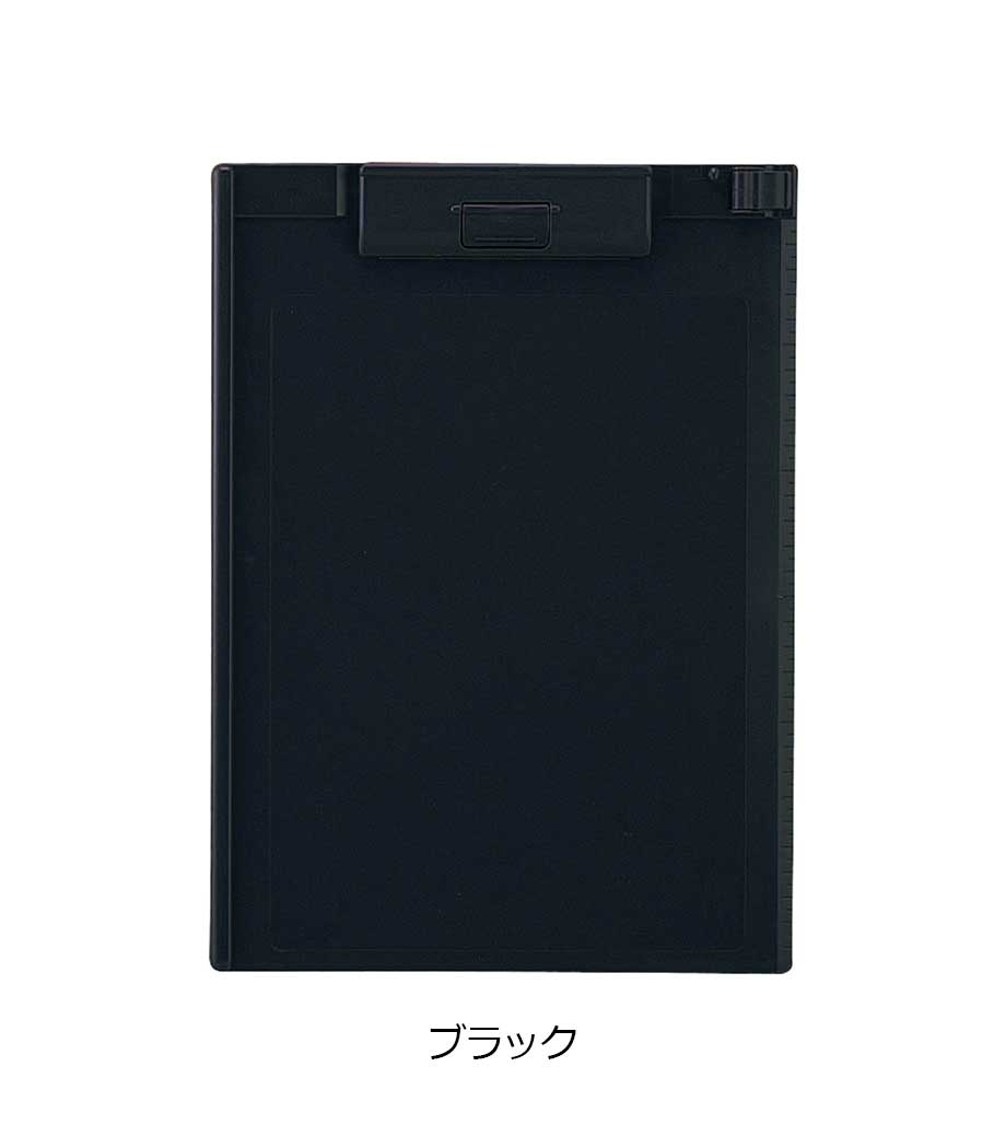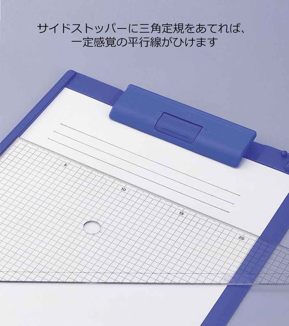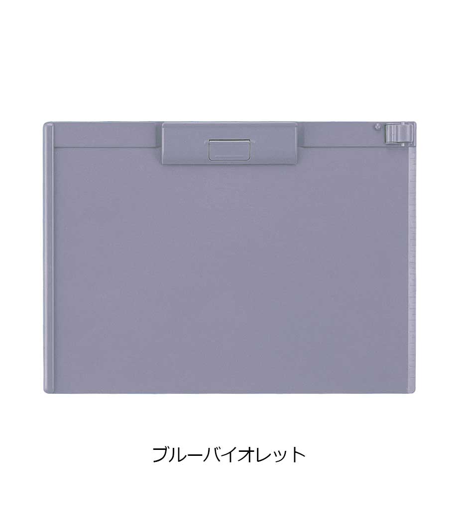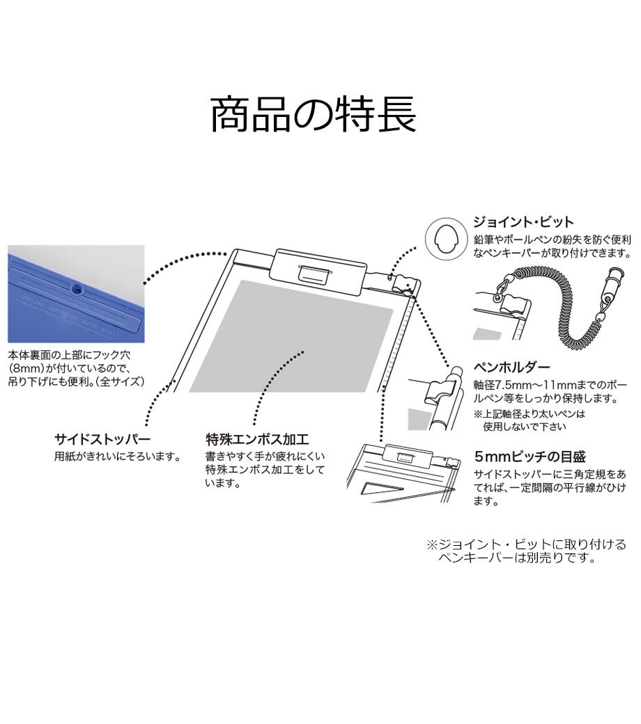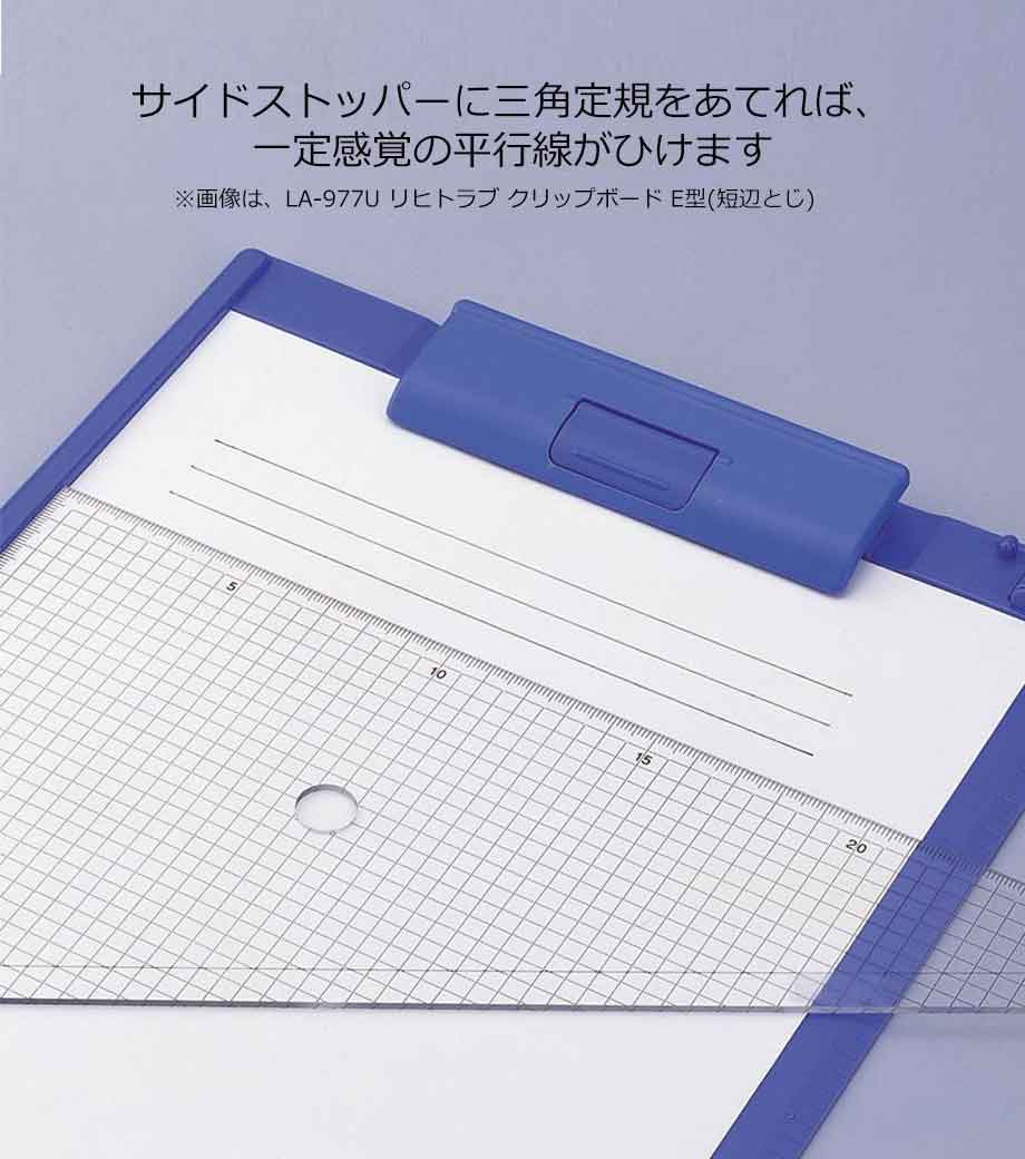 片手で簡単に開閉でき、開いた状態でロックできる横型のクリップボードです。クリップを下まで押すとレバーが起き上がり開いたままでロックするので用紙が閉じやすいロック機能付き。サイドストッパーや特殊エンボス加工した表面、ペンホルダー、5mmピッチの目盛りなど、誰もが使いやすい工夫がいっぱいです。あまり見かけない横型タイプは、会社内の掲示やスポーツのスコア表になり便利!