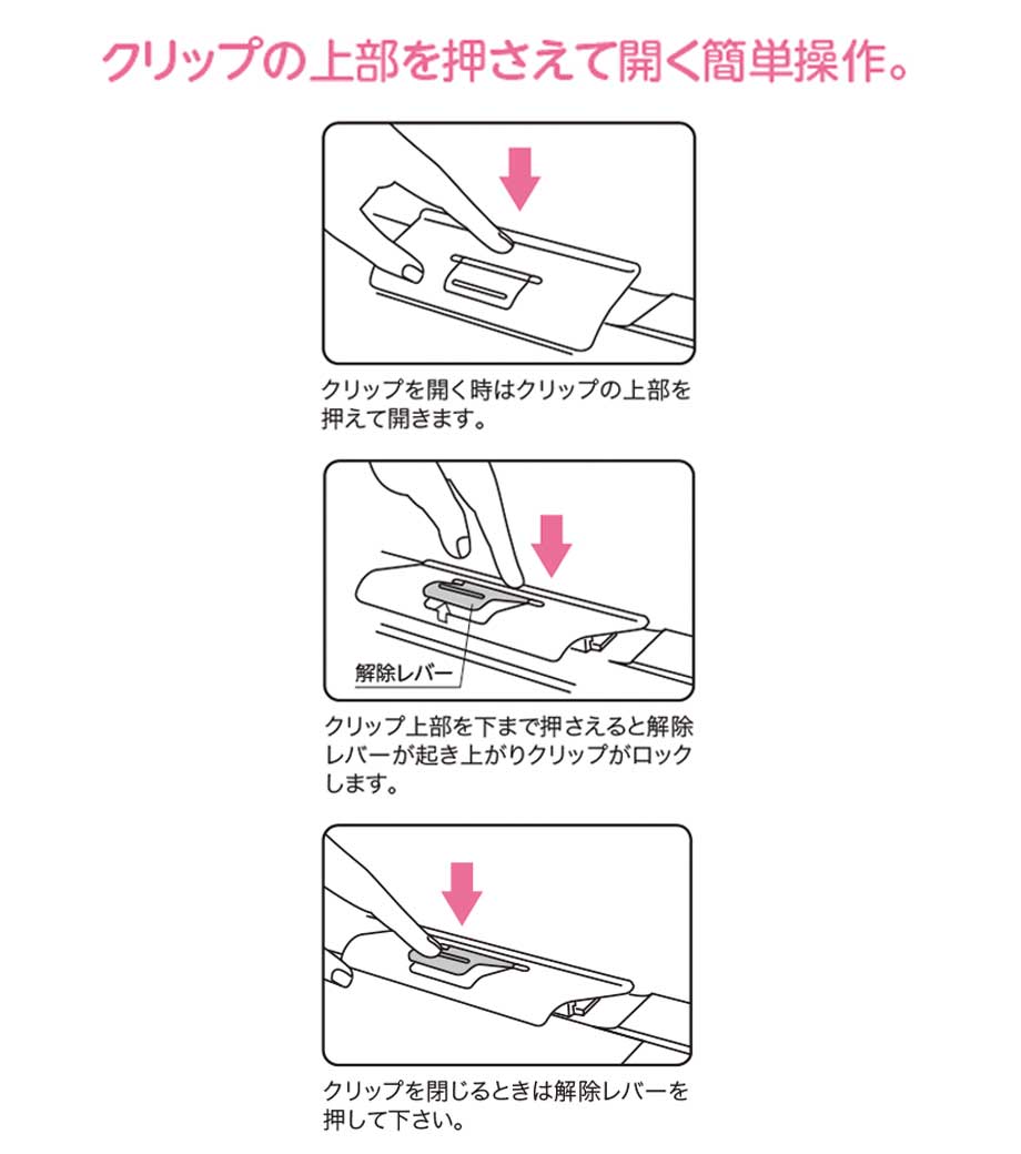 クリップ部分は、片手で上部を押さえて簡単にオープン&ロックできます。ロックが付いているので挟んだ下の資料を片手で「さっ」と取り出せます。