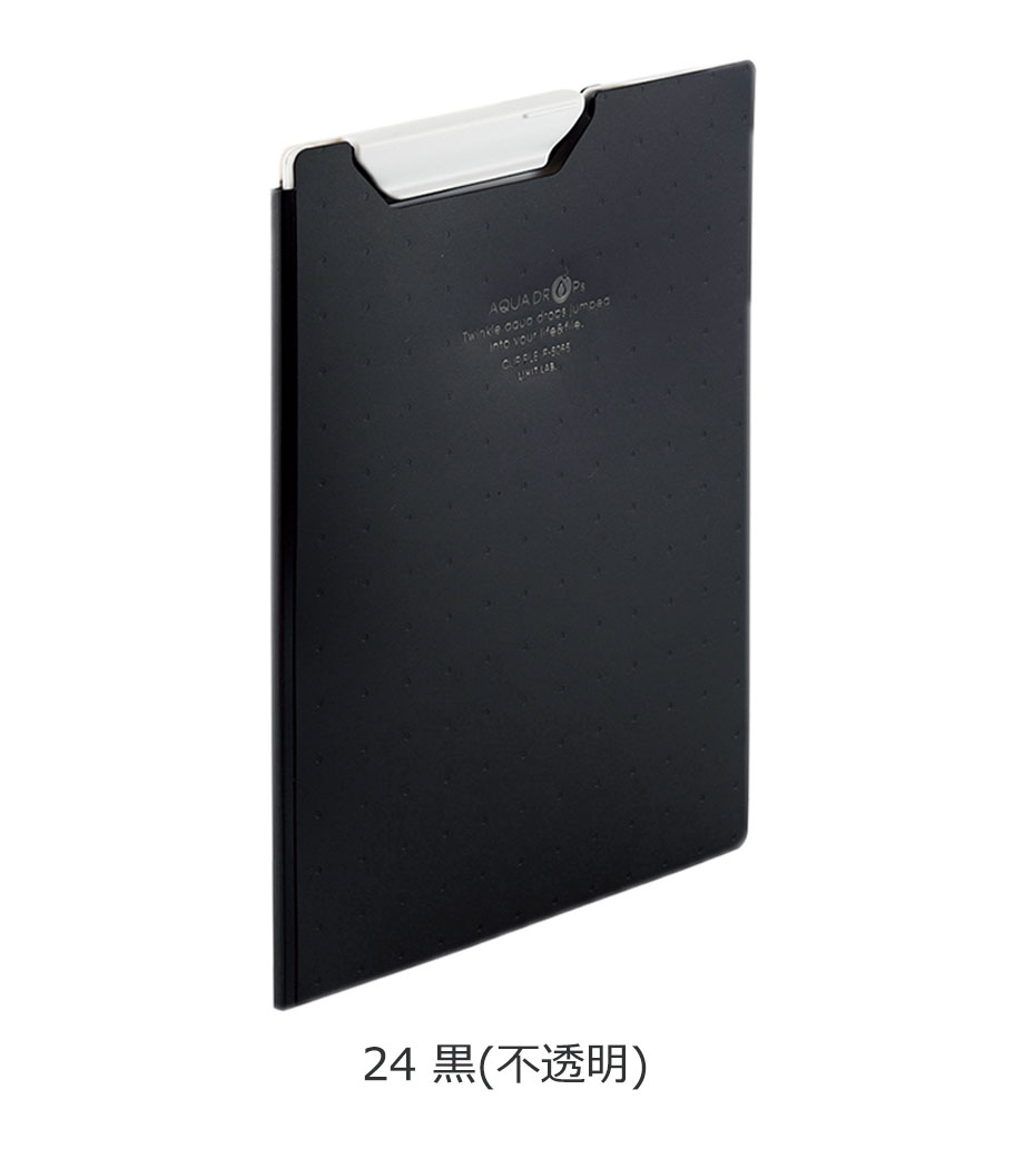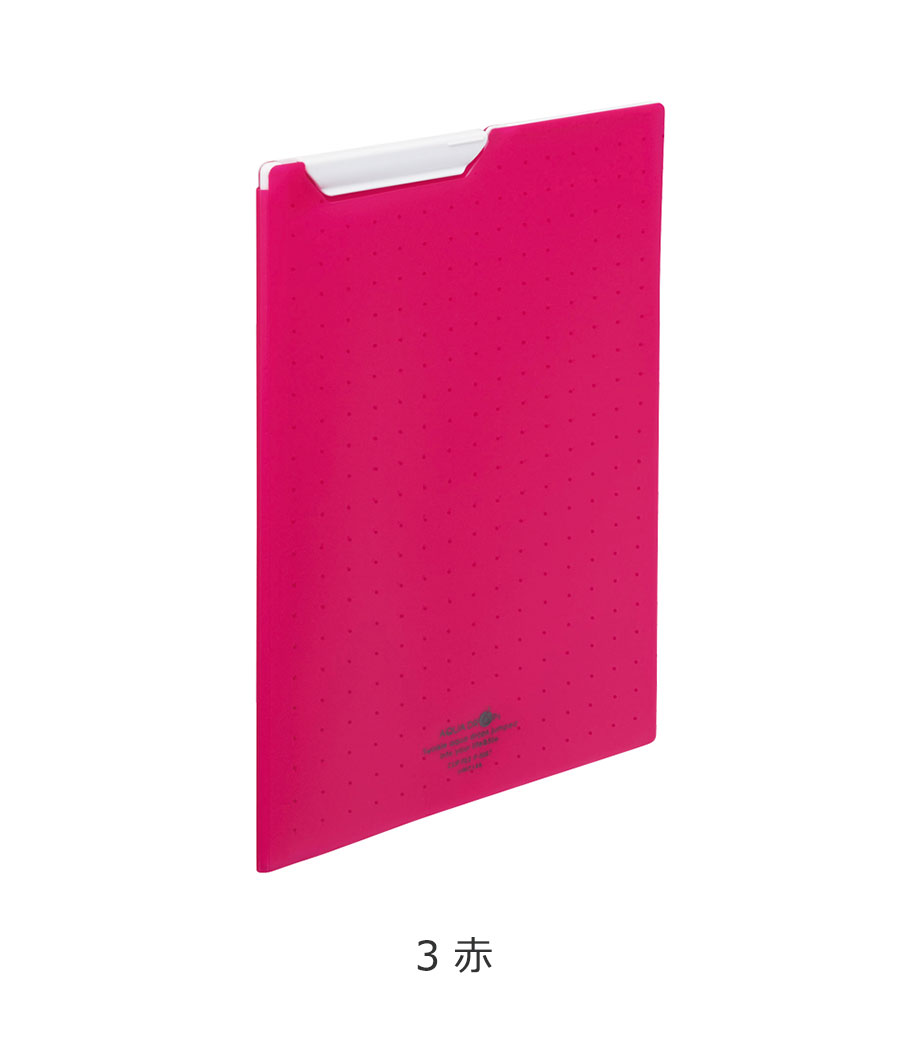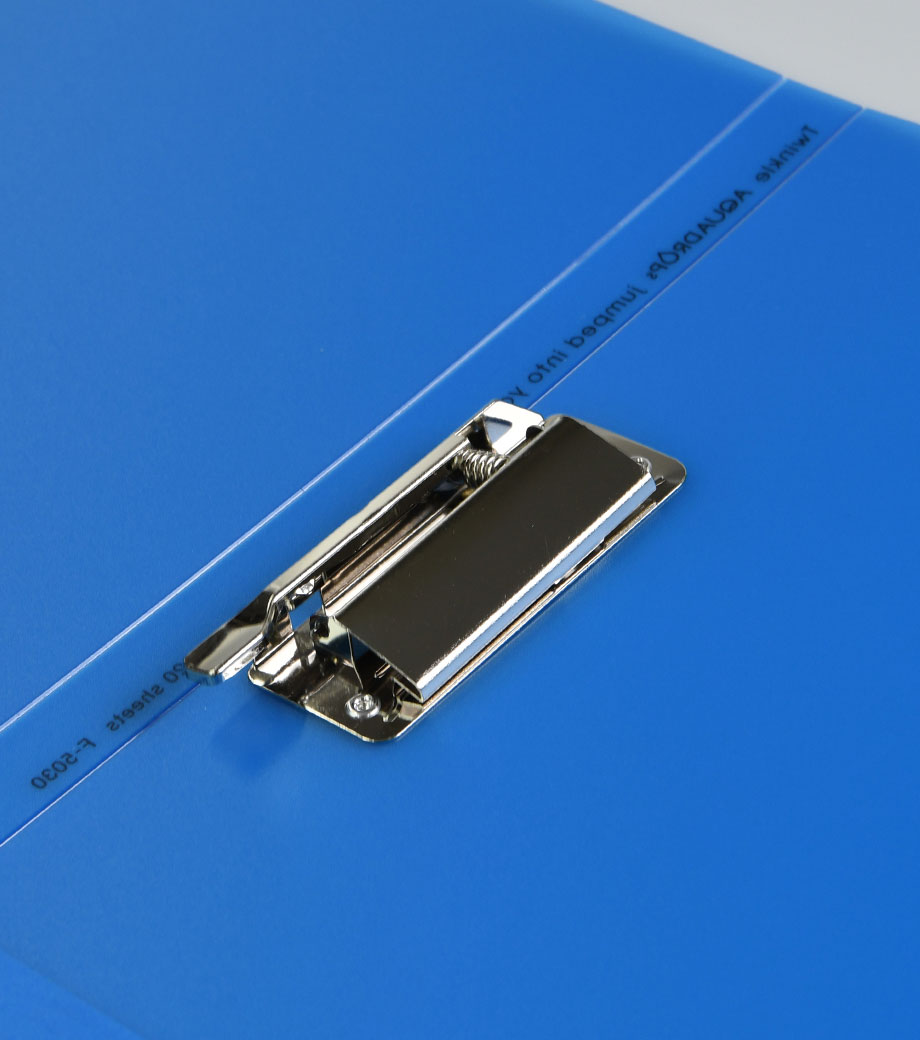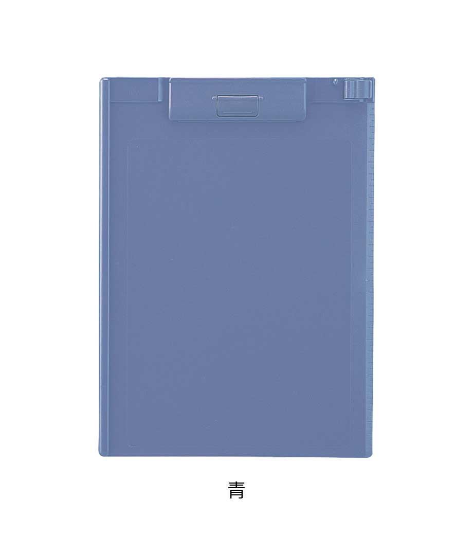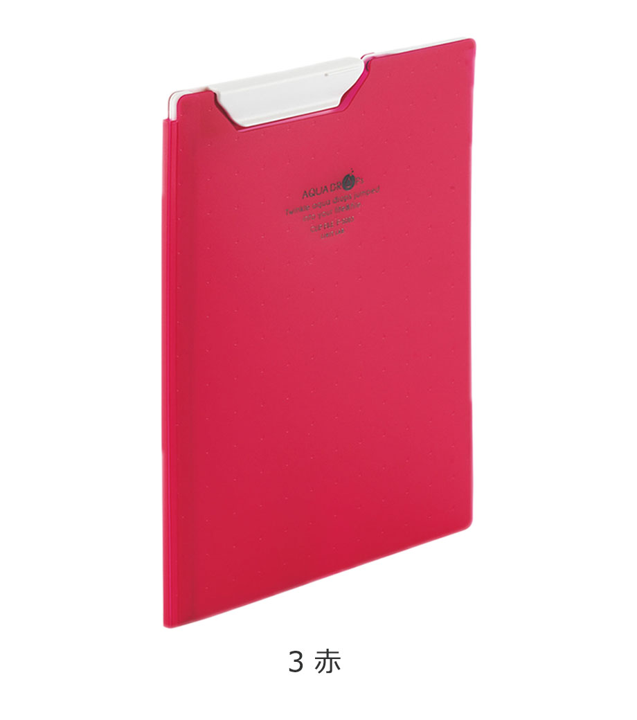 AQUA DROPs クリップファイル(A4)は、ボード面がしっかりしているので、机や書く場所がないときでも、立ったまま記入できるファイルです。一般的なクリップボードとは違い、スライド式のクリップを採用。バチンと音を出すこともなく、クリップの開閉と同時に紙押さえも開くので、用紙の抜き差しがスムーズに行えます。
