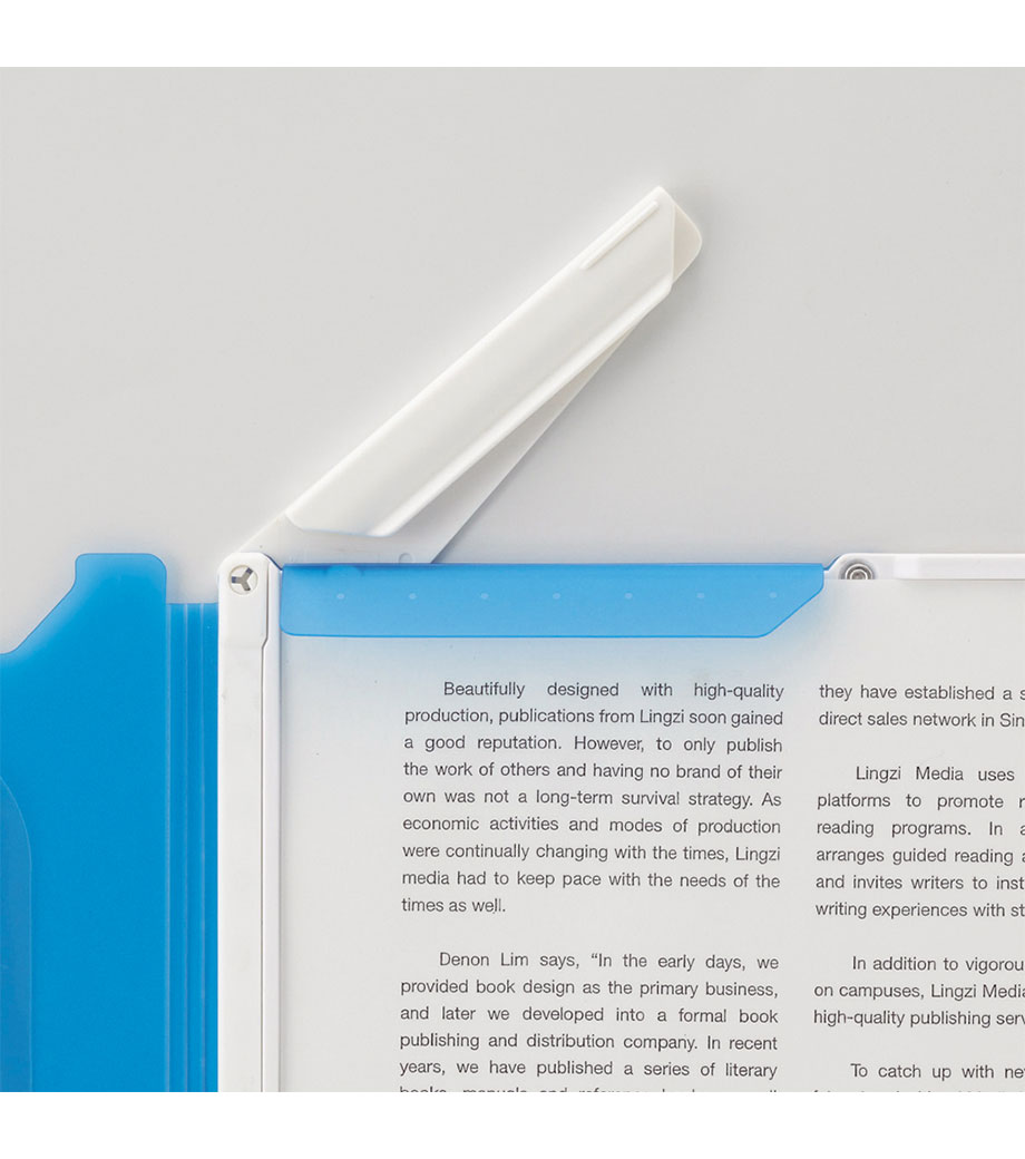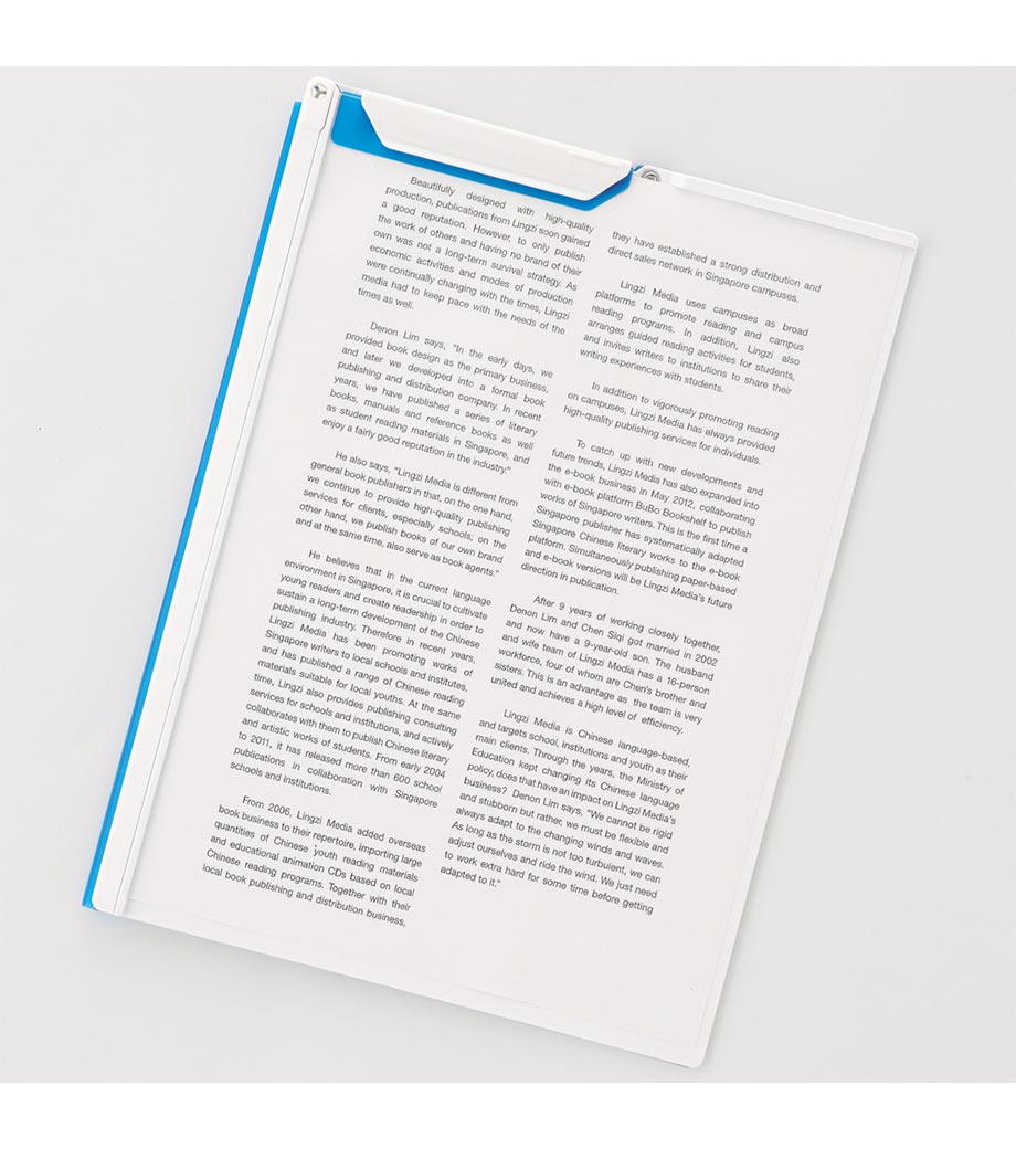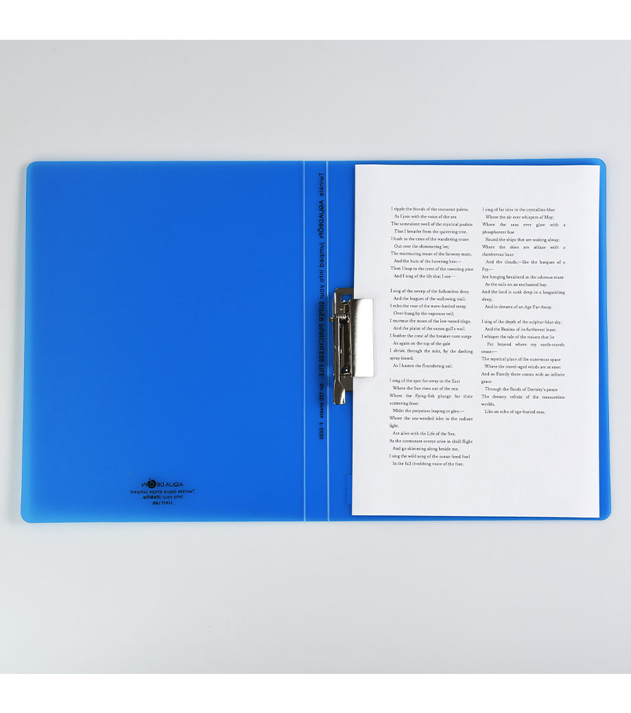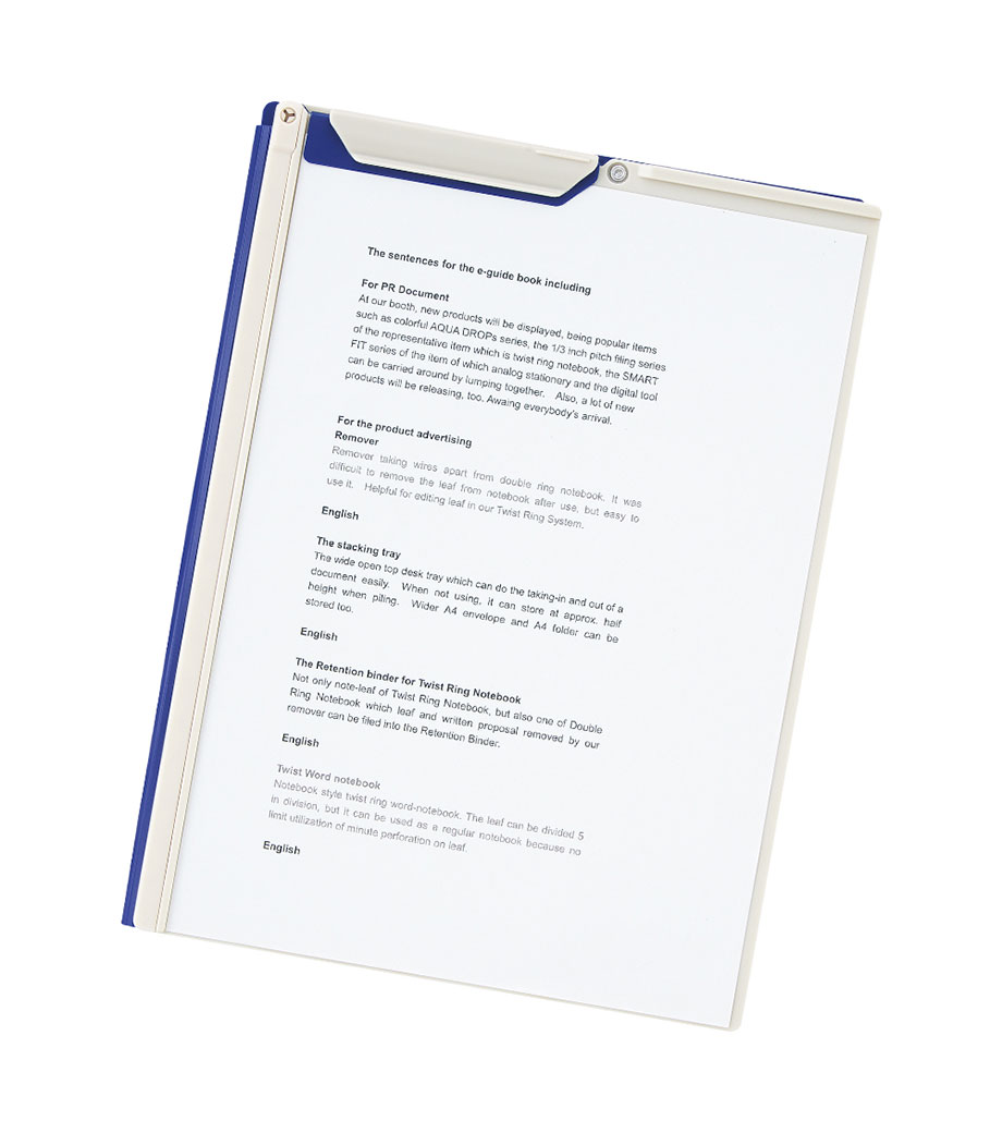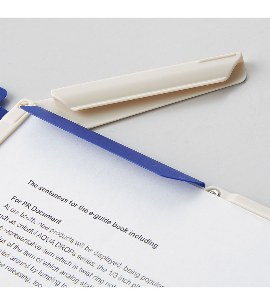 AQUA DROPs クリップファイル(A4)は、ボード面がしっかりしているので、机や書く場所がないときでも、立ったまま記入できるファイルです。一般的なクリップボードとは違い、スライド式のクリップを採用。バチンと音を出すこともなく、クリップの開閉と同時に紙押さえも開くので、用紙の抜き差しがスムーズに行えます。