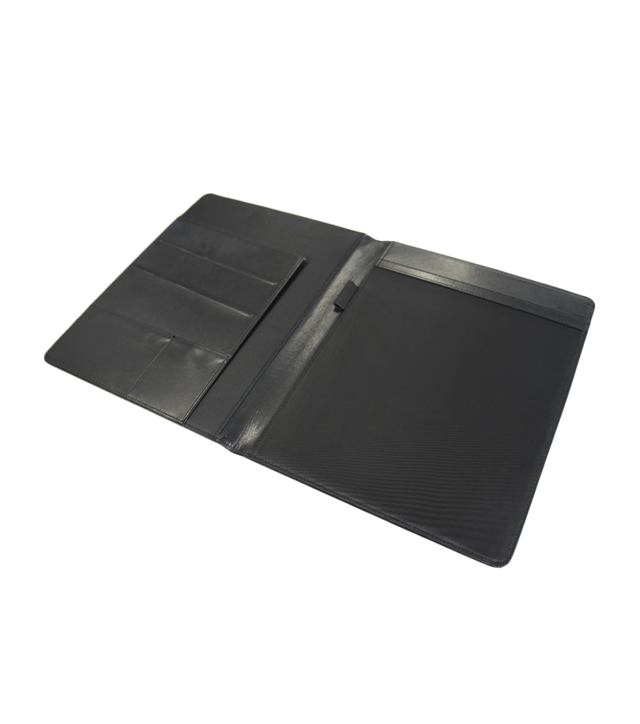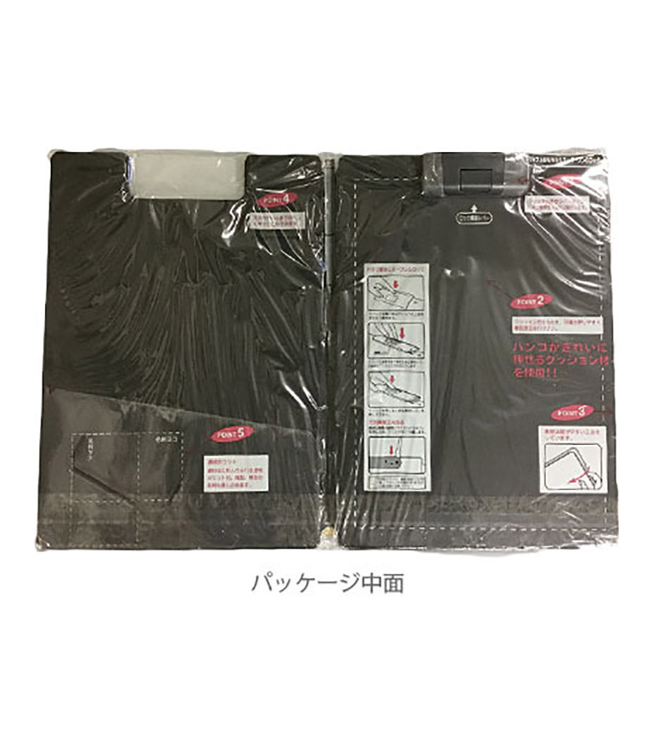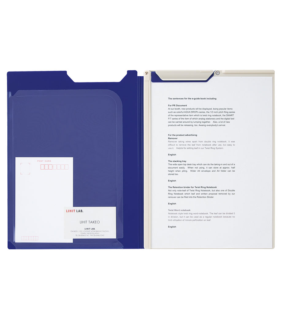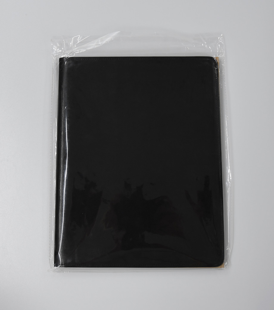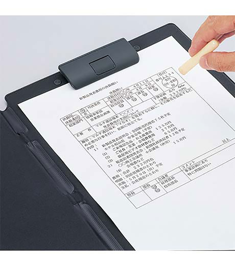 微妙なクッション性と紙が滑りにくい素材によって、電車の中でも文字をきれいに書くことができ、契約書に印鑑を美しく捺印できます。裏表紙に資料や名刺を入れておける透明ポケットがあり、カタログも挟めます。