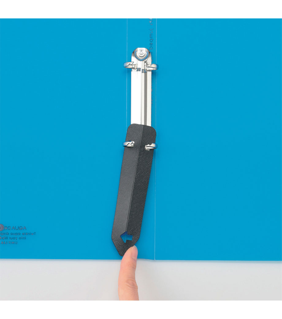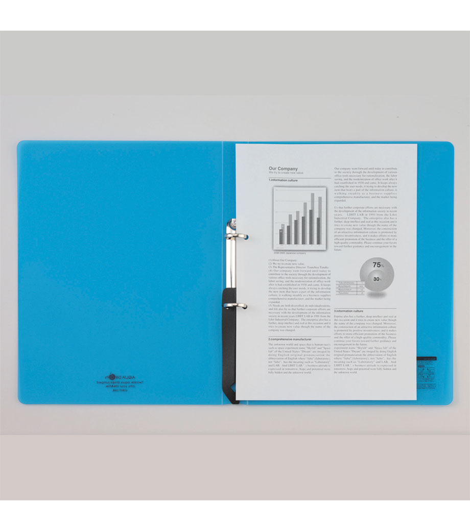 A4規格のリングファイル。最大150枚収容可能です。リングは片手でひねるだけでオープンできるユニバーサルデザイン。リングを触らずオープナーをスライドしてもリングを開けることができます。閉じる時も金具をつまむだけで簡単です。