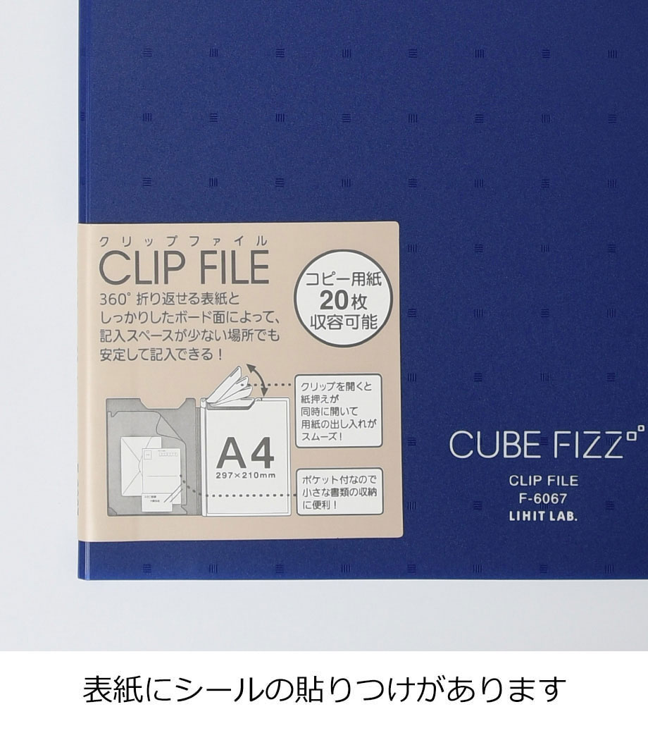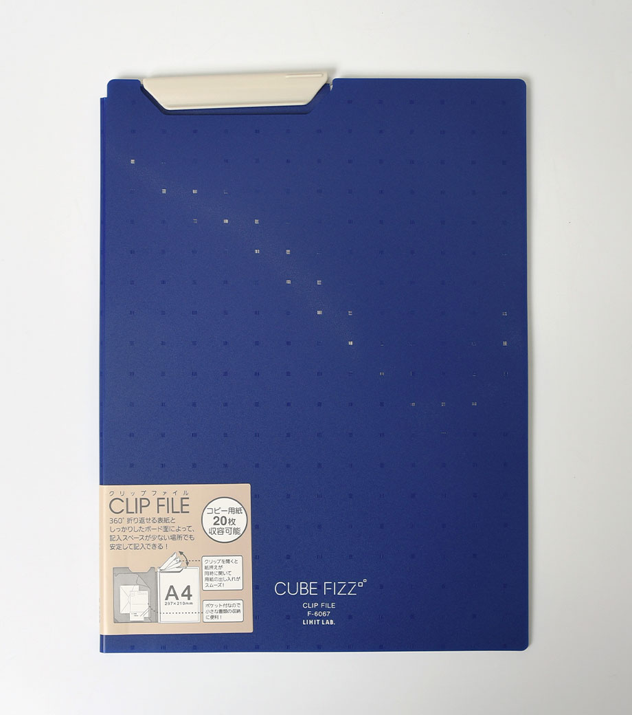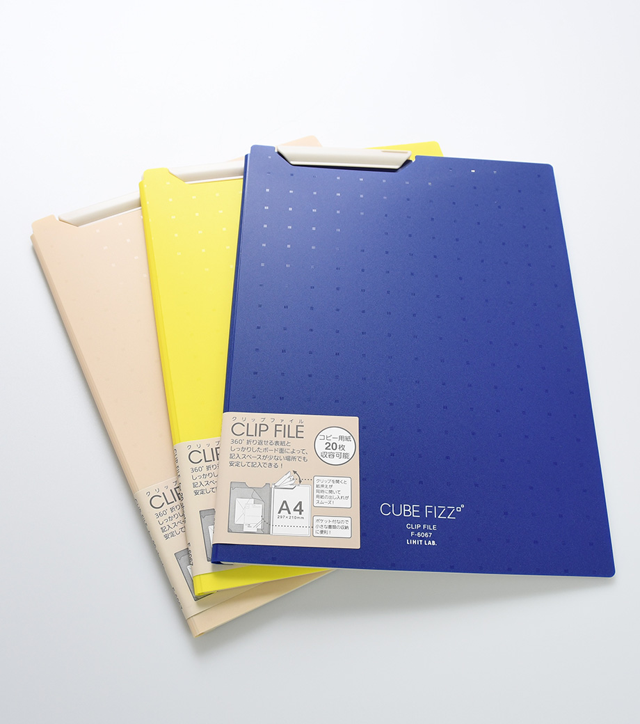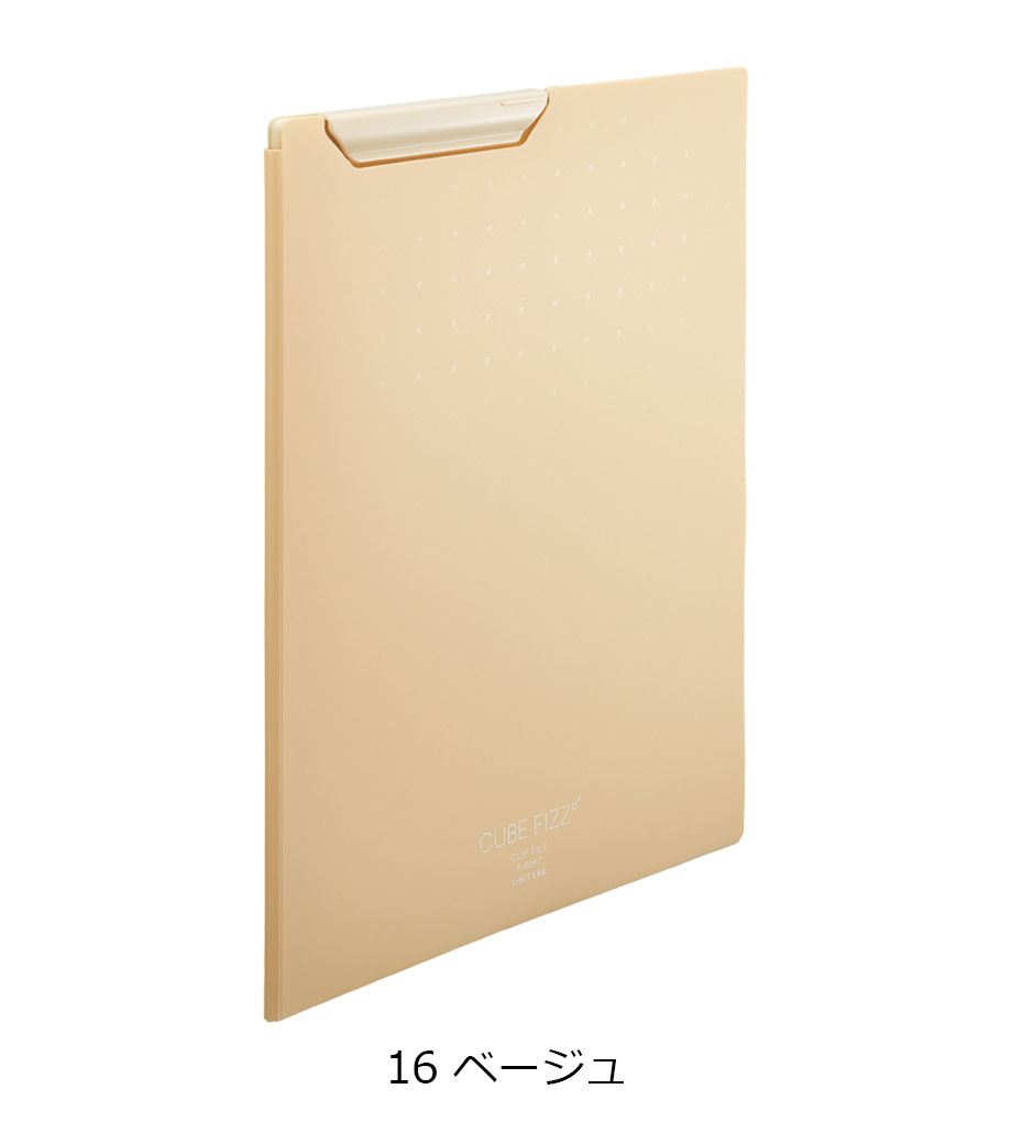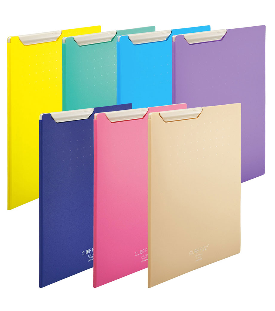 リヒトラブ CUBE FIZZ クリップファイルは、A4サイズのコピー用紙が20枚収容できるファイルです。表紙は360°折り返し可能。ボード面は厚みがありしっかりとしているので立ちながらの筆記に便利です。内側には透明ポケット付き。スライド式クリップは力もいらず楽に開閉できます。クリップの開閉と同時に紙押さえも開くので、用紙の抜き差しがスムーズ。本体色と同色の紙押さえがおしゃれに彩りを添えます。カラフルな色合いでお馴染みの文具メーカーLIHIT LAB.(リヒトラブ)の商品です。