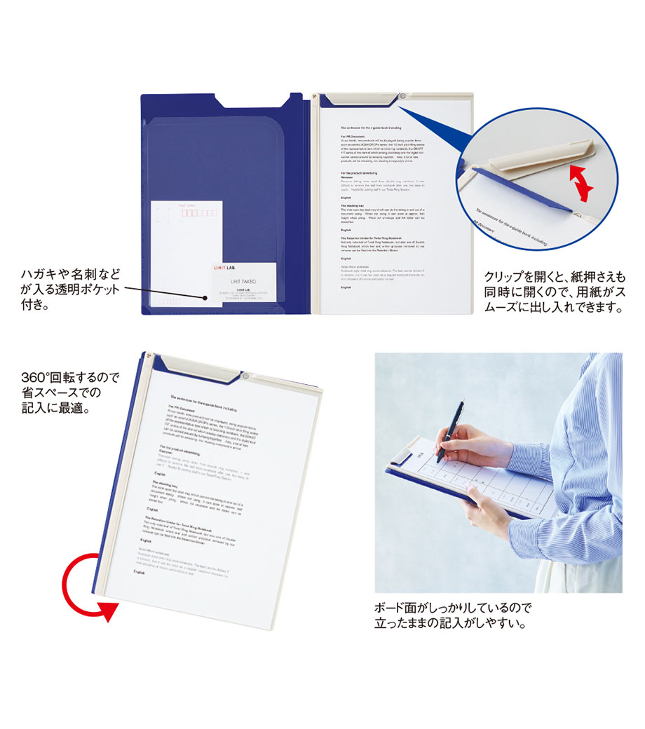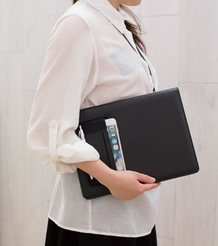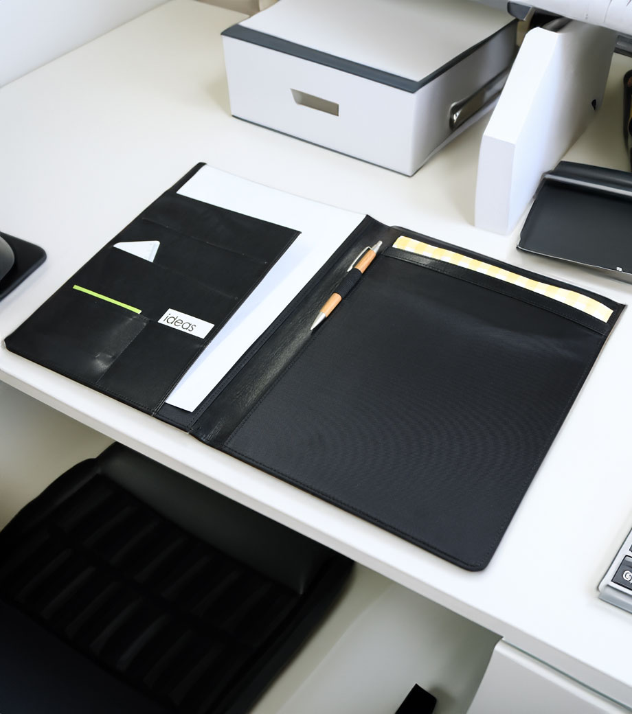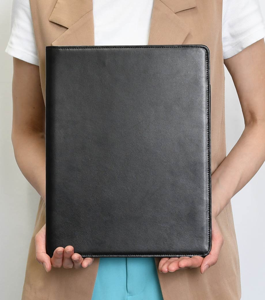 会議の書類をさっと挟み、ノートもすばやく書き込め、必要なメモをポケットに仕分けて入れておけるので、クリアファイルのようにごちゃごちゃになりません。通勤鞄に入れてもノートが折れることがなく、デスクに着いてすぐに仕事に取り掛かれるので作業効率UP間違いなし。