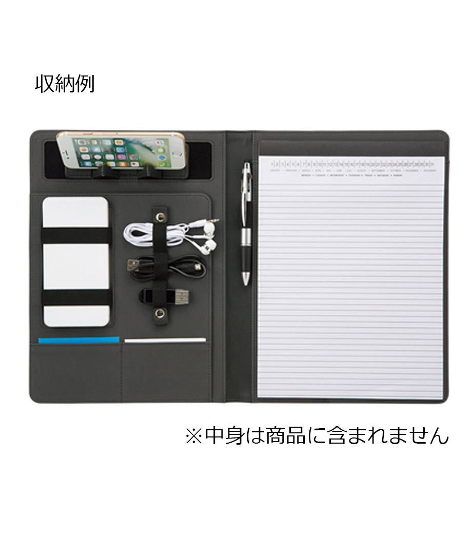 中を開くと、左側にはモバイルバッテリー、ケーブルやUSBメモリなどを挟めるベルト。下部は名刺や付箋などを収納できる2つのポケットが付いています。上部にはフラットに収納できるモバイルスタンドが付いていて、携帯を立てて使用できます。