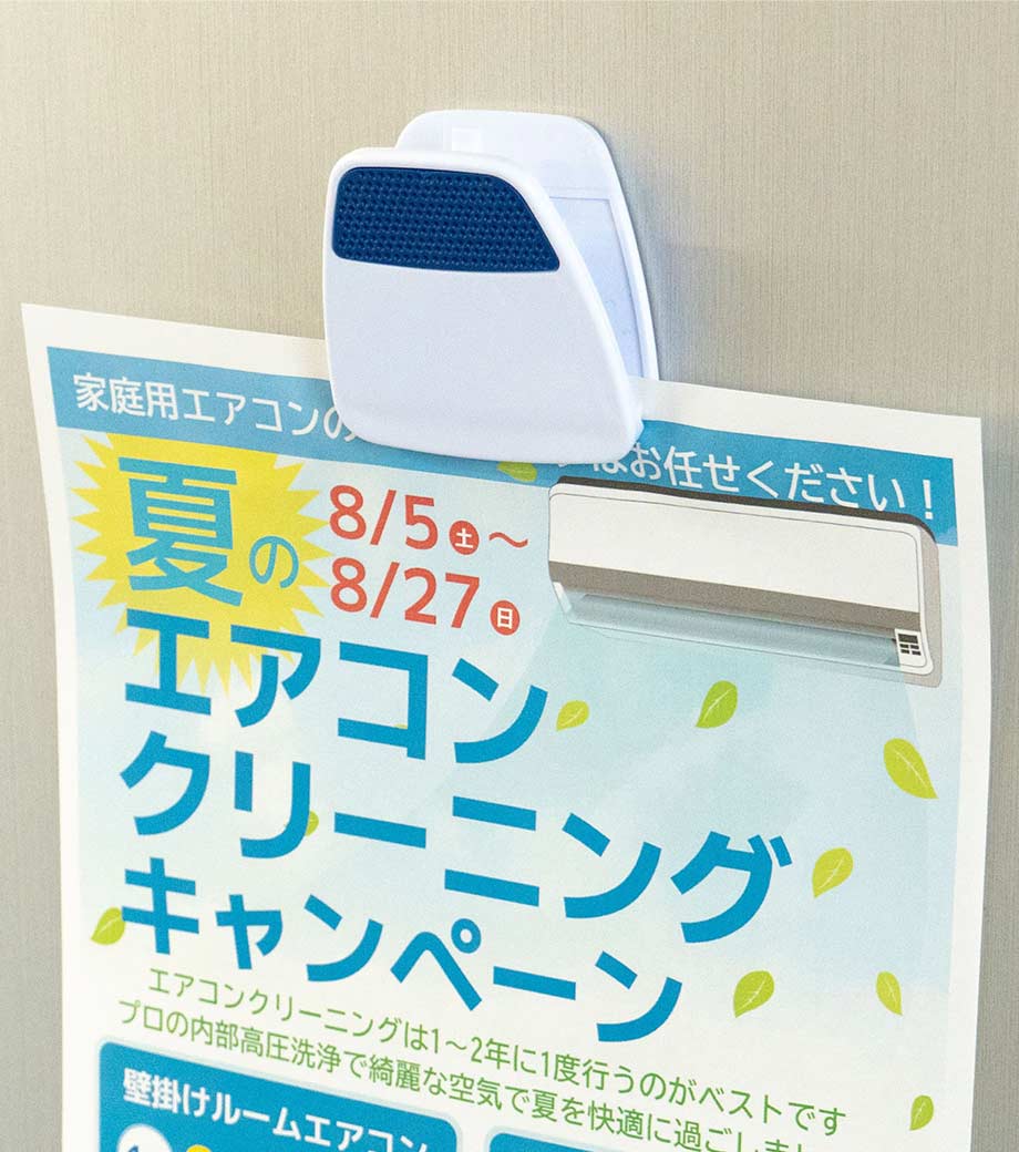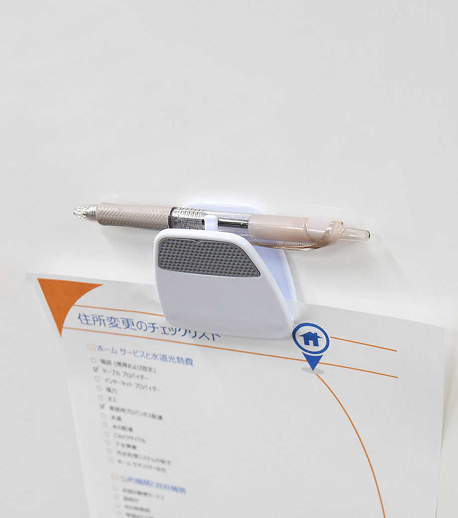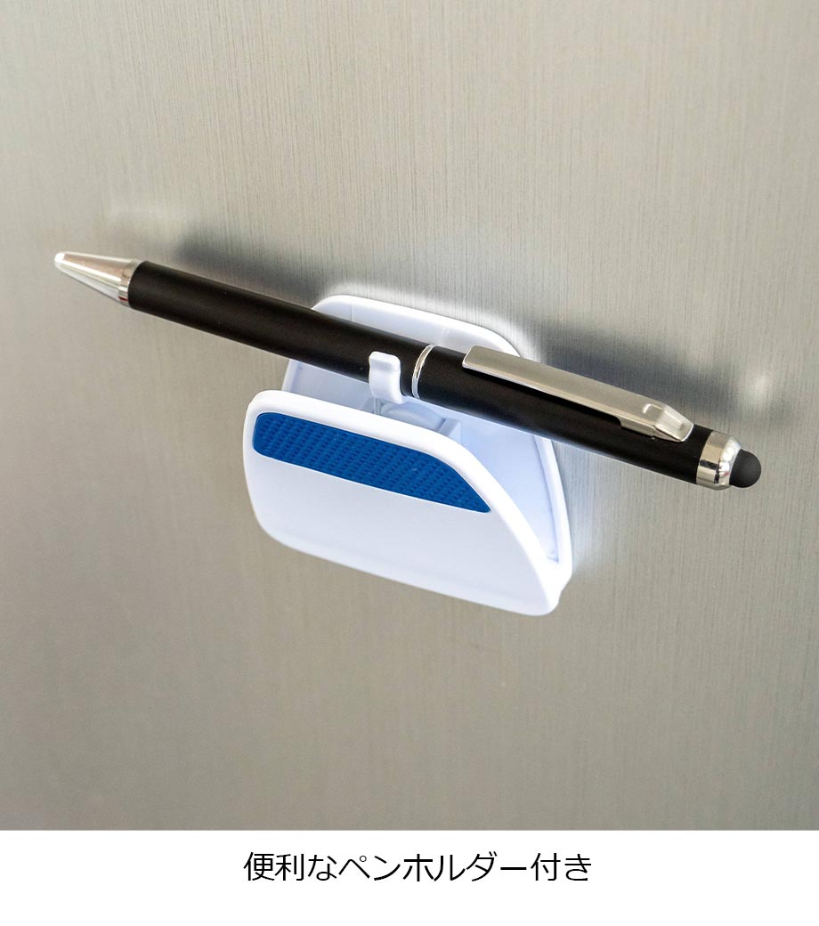天面にペンホルダーが付いたマグネットクリップです。強い磁力を持つネオジウムマグネットが紙とペンをまとめて貼り付けます。冷蔵庫に貼ったメモや職場で貼り出された書類に、ペンを取りに行くひと手間なく書き込めて便利!商品価格が100円以下なので予算を抑えてたくさん作れます。病院・薬局の開院記念や、バラマキ用ノベルティにもおすすめです。