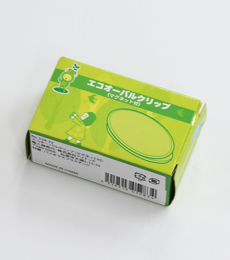 エコオーバルクリップ(マグネット付)は、生物由来のバイオマスプラスチックを使用したマグネットクリップです。資源循環型で二酸化炭素削減につながり、地球温暖化防止に効果があります。クリップ裏面にマグネット付きなので、スチール扉や冷蔵庫にペタリと貼れます。買い物メモや特売チラシを挟んでおけば、とっても便利!