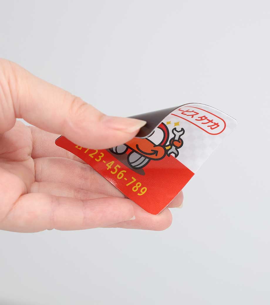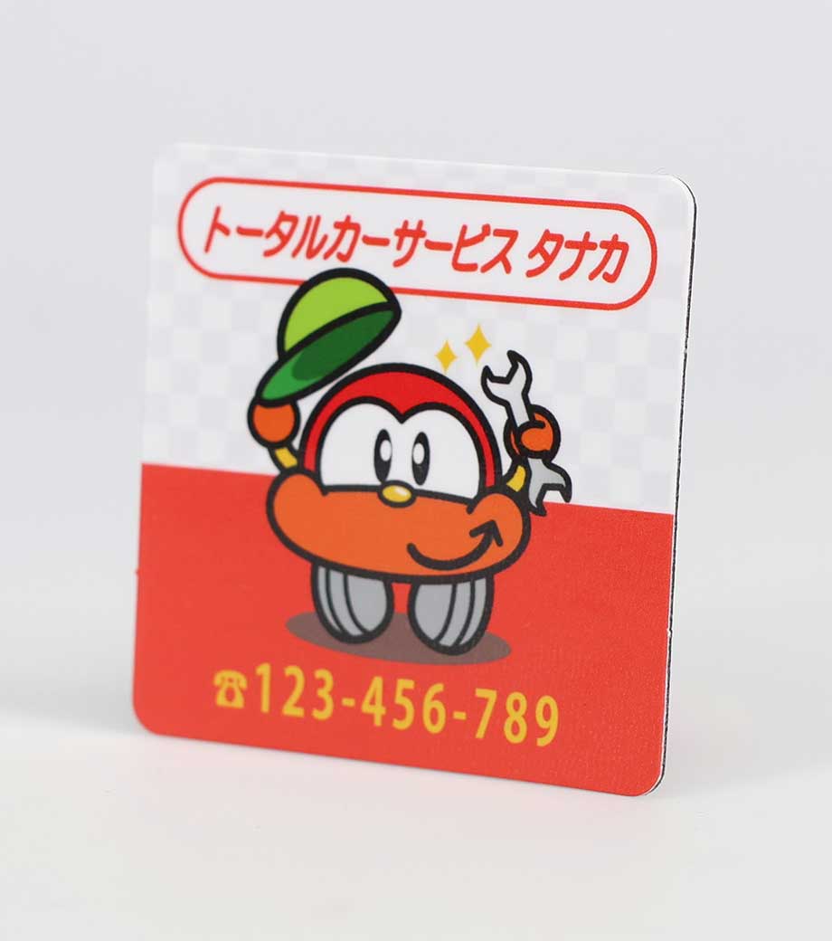 イラストや写真もフルカラーで印刷できる、シート状のマグネットです。冷蔵庫や金属製の扉に貼れて日常的に目につきやすく、宣伝効果が高いのが特長。サイズは55×55mmとコンパクトなので、営業訪問時に粗品として手渡したり、資料と一緒にポストインするのにおすすめです。