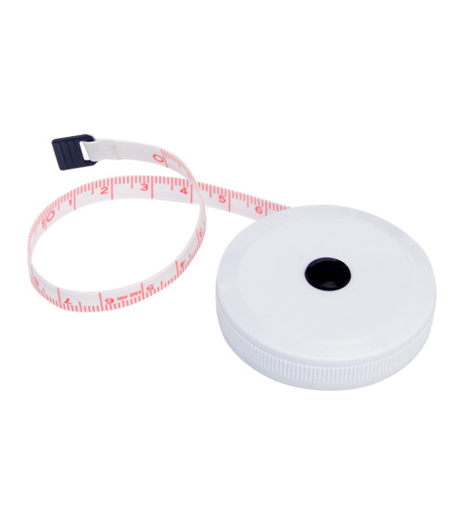 150cm長のメジャーには、便利なメタボ関連情報をプリントしました。「標準体重の求め方」、「BMI値の求め方」、「ウエストサイズの平均値(男女年齢別)」、「おやつカロリーチェック」が表記されているので、健康で正しいダイエットに役立ちます。