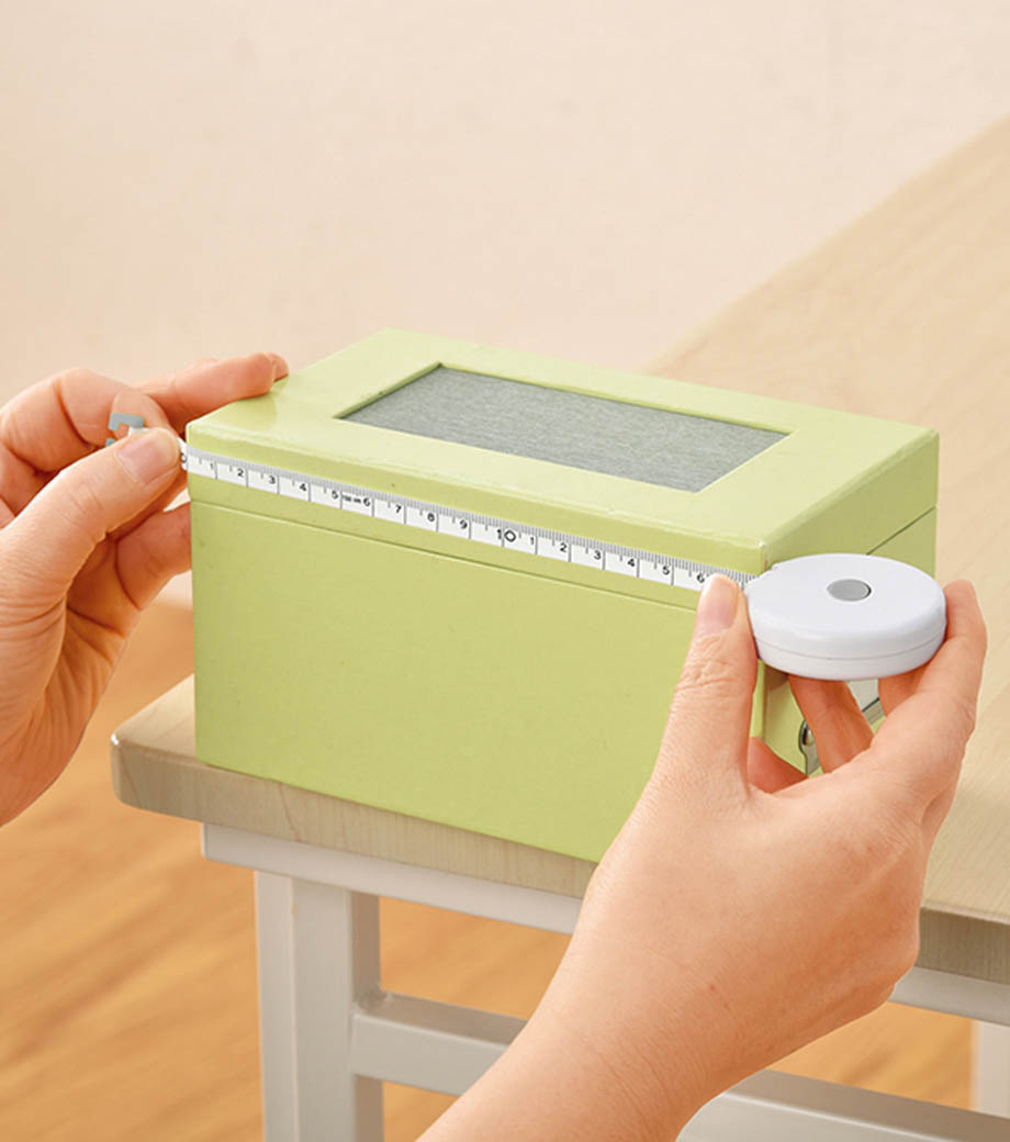高級感のあるレザー調のメジャーです。コンパクトでバッグやポケットに入れてもかさばりにくく、新しい家具の購入時やDIY作業時に携帯しやすくなっています。中心部分を押すとメジャーが巻き取れる仕組みです。