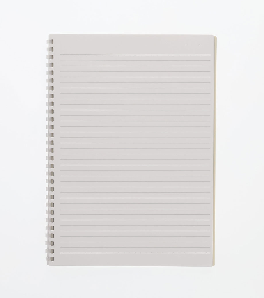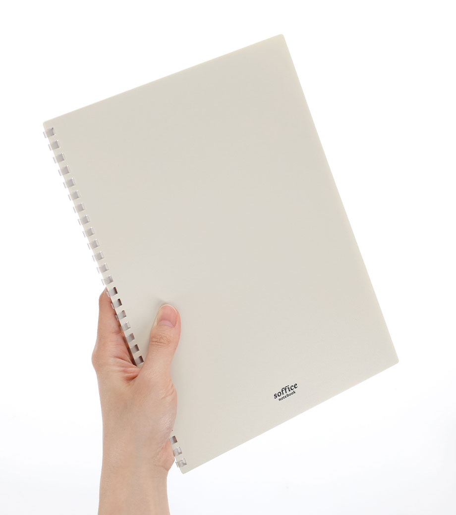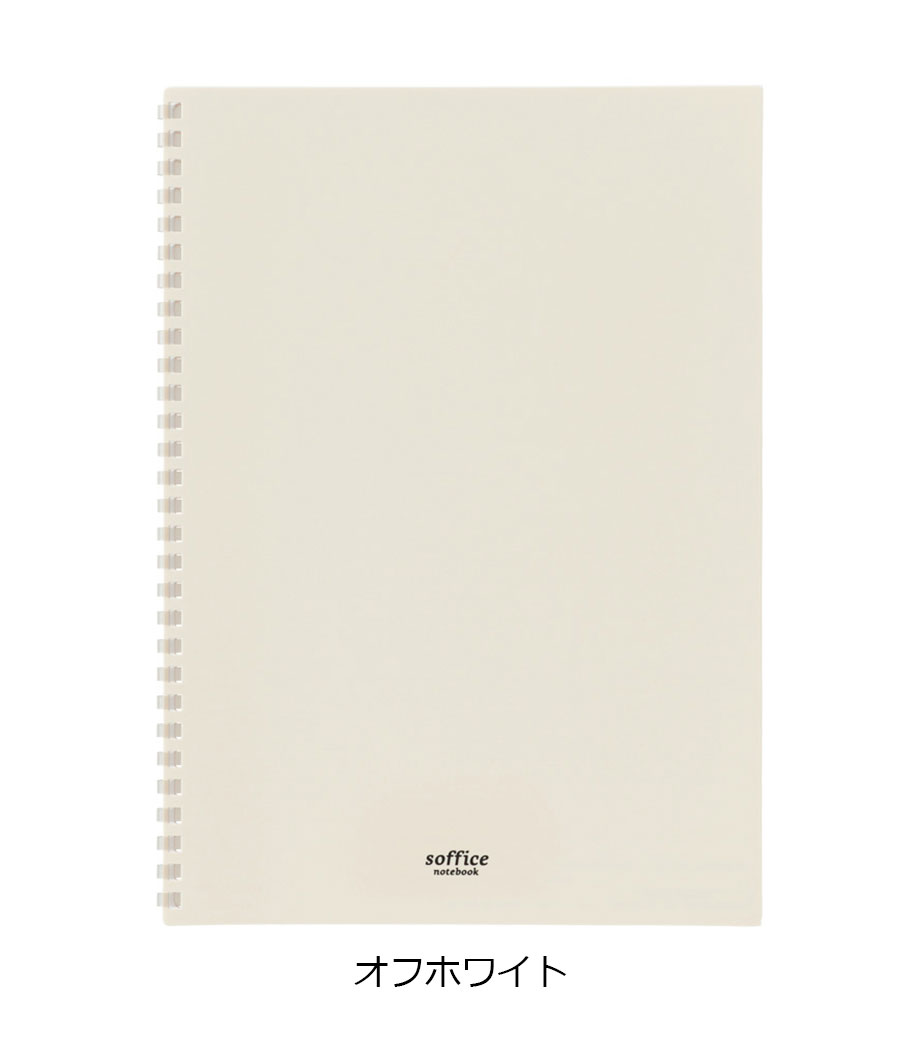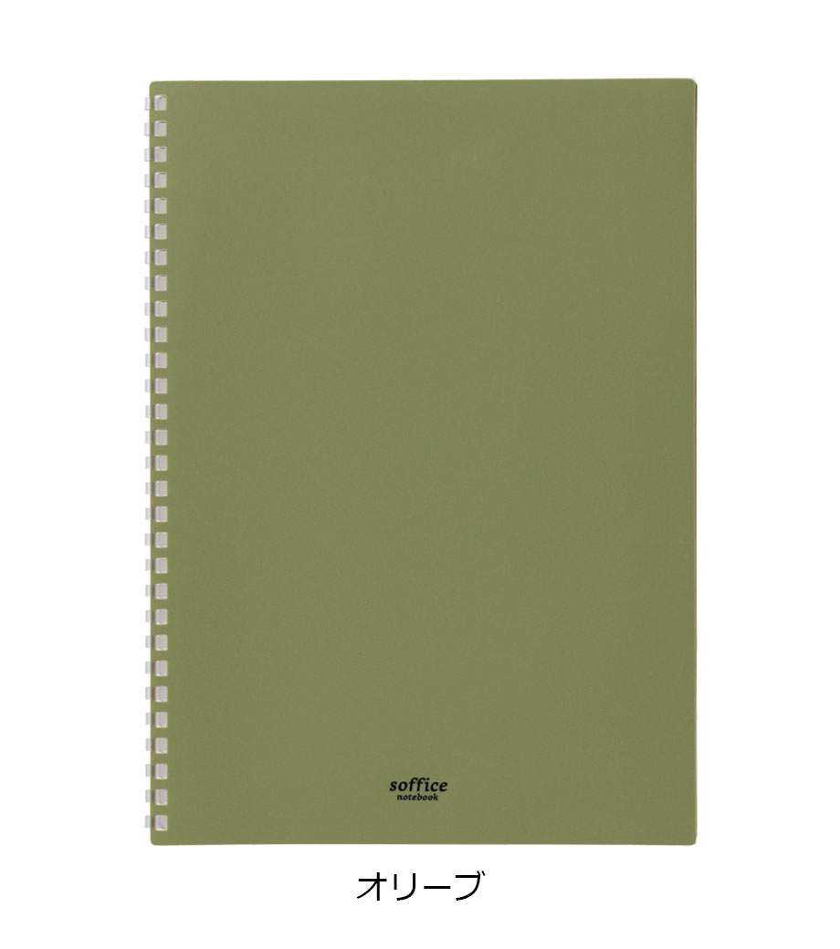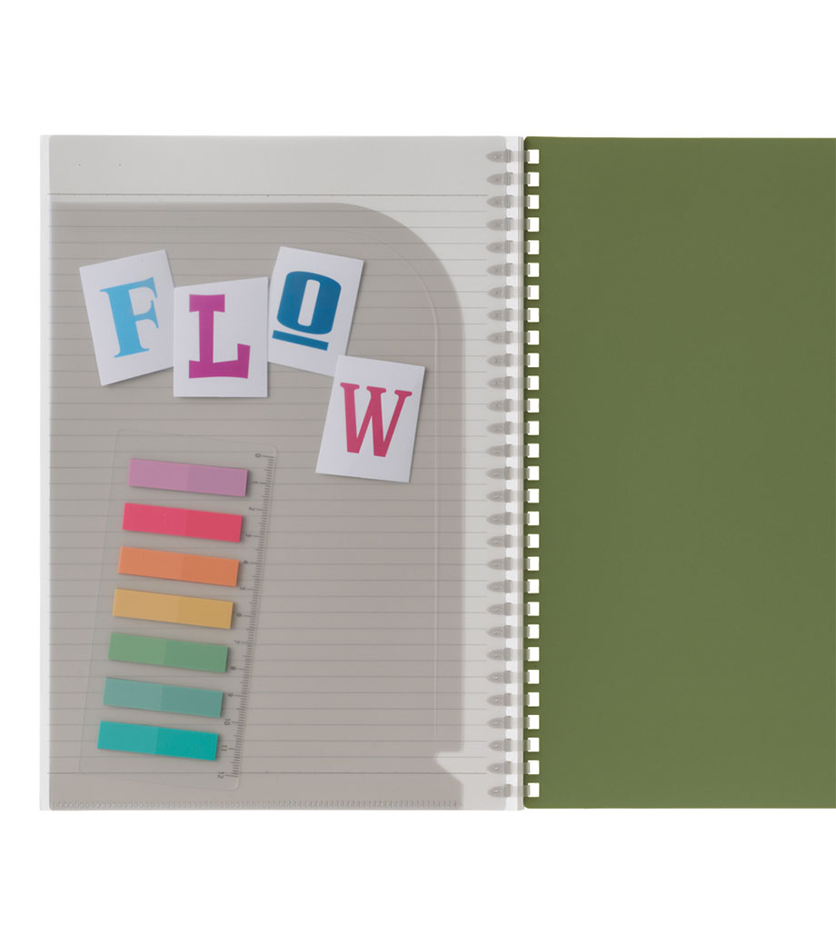 やわらかなPP製で「リングが手に当たって書きにくい」というプチストレスを軽減したノートです。使い切ったらリングをハサミで切ってリーフの取り外しが可能。リヒトラブのツイストノートやオープンリングノートシリーズに移し替えできます。背面には付箋やシールを入れられるオープンポケット付き。