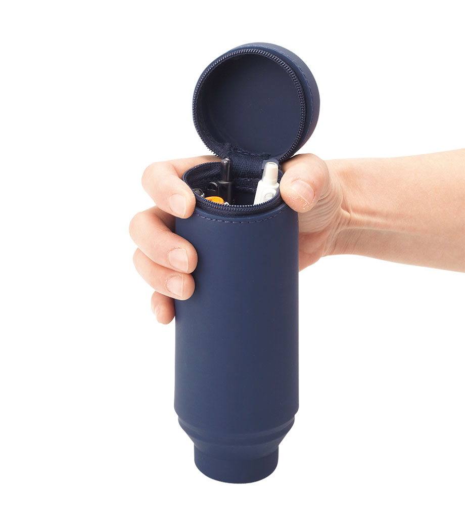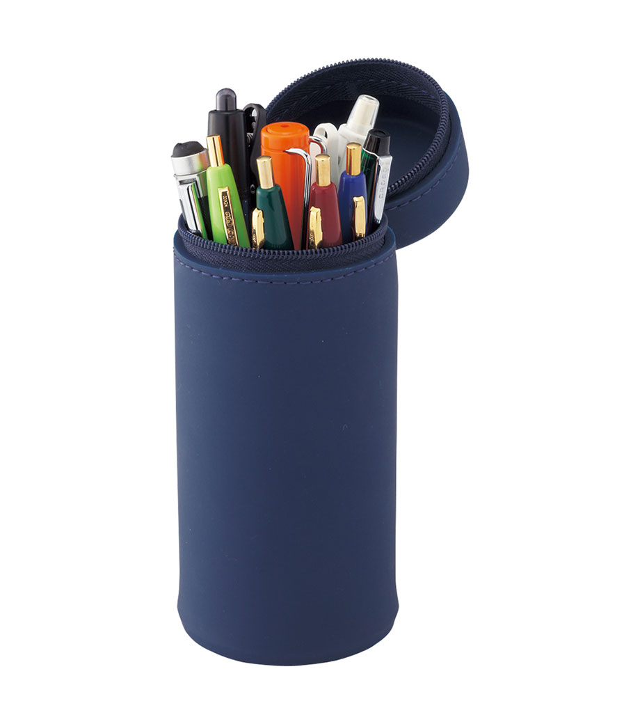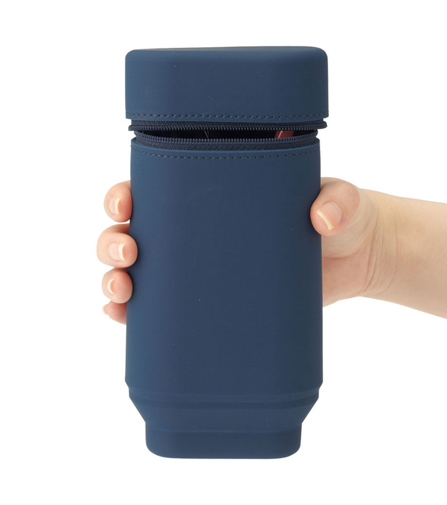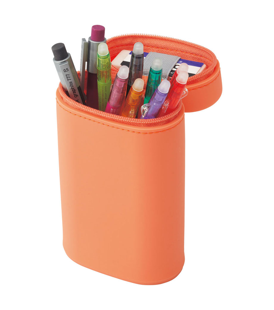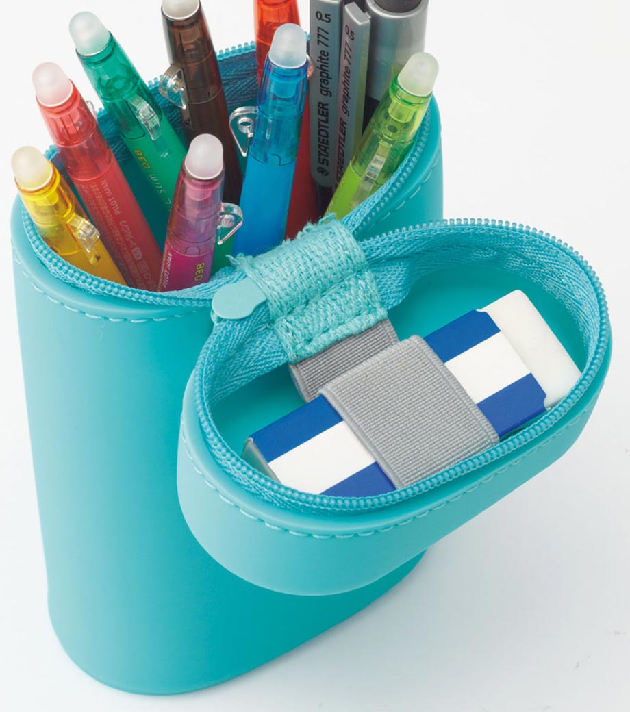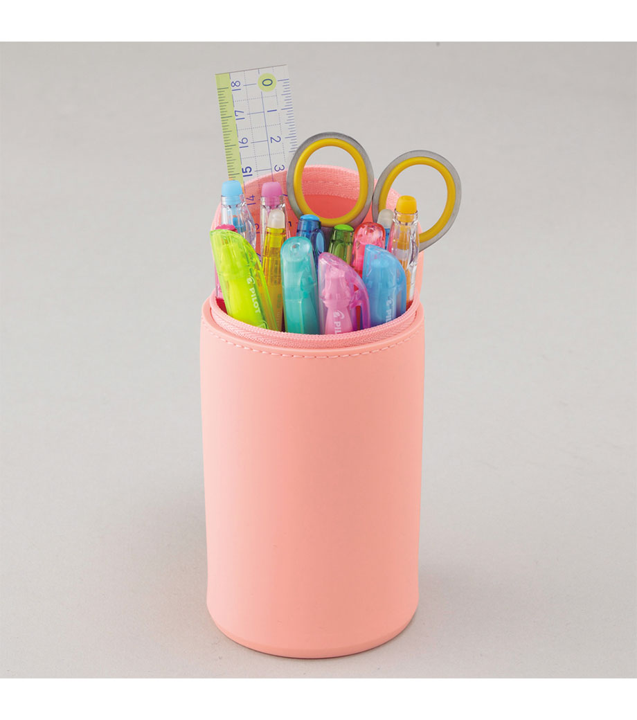 SMART FIT ACTACT スタンドペンケース(オーバルタイプLサイズ)は、デスクでペンスタンドのように立てて使えるペンケースで、ペンは約22本も入る収納力。ファスナーを開けて本体を握り、上から押すと底のでっぱりがへこんでペンスタンドに早変わり!しまうときは底を引っ張り出すとペンケースに戻ります。フタ部分には消しゴムホルダー付。ペンケースの底に落ちて、全部ペンを取り出さないと消しゴムが出てこない!なんてイライラから解放されますね。
