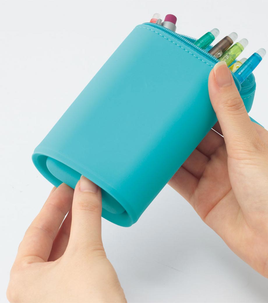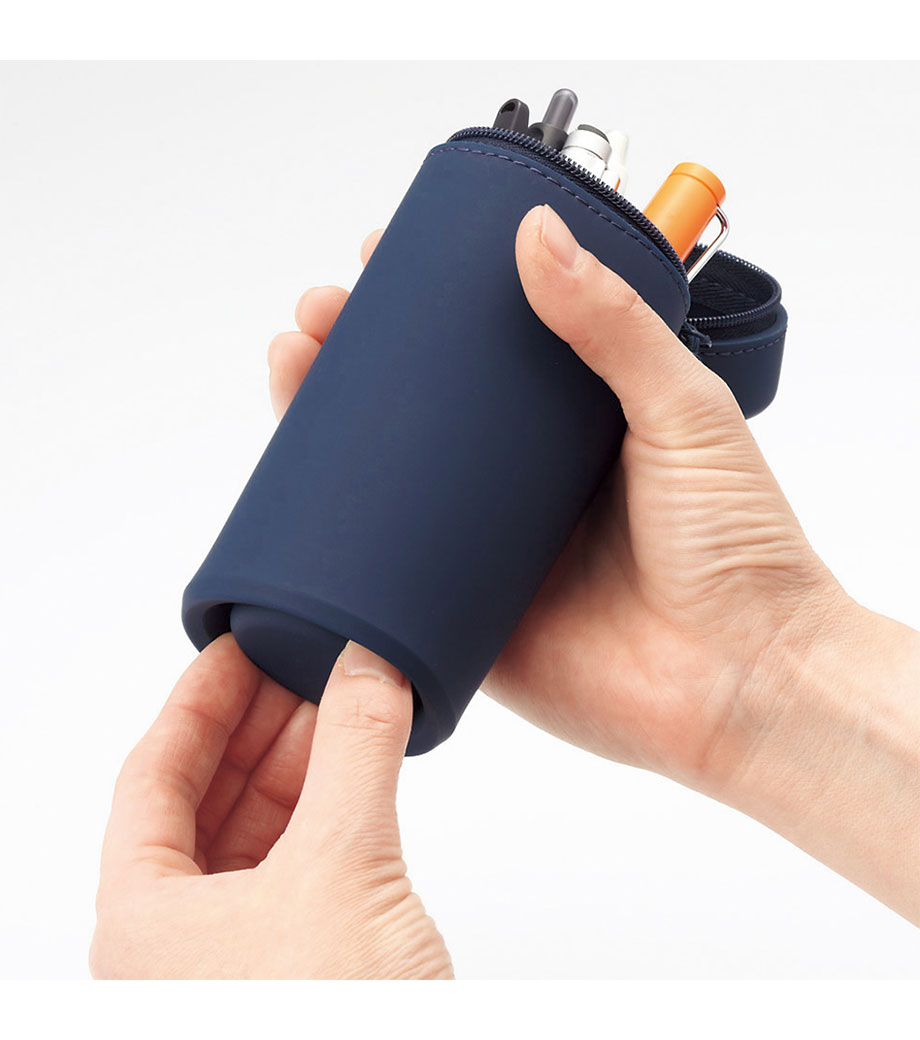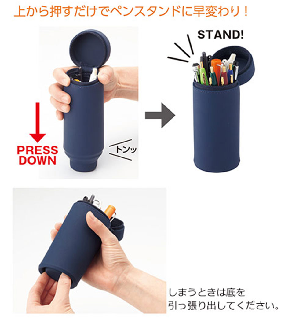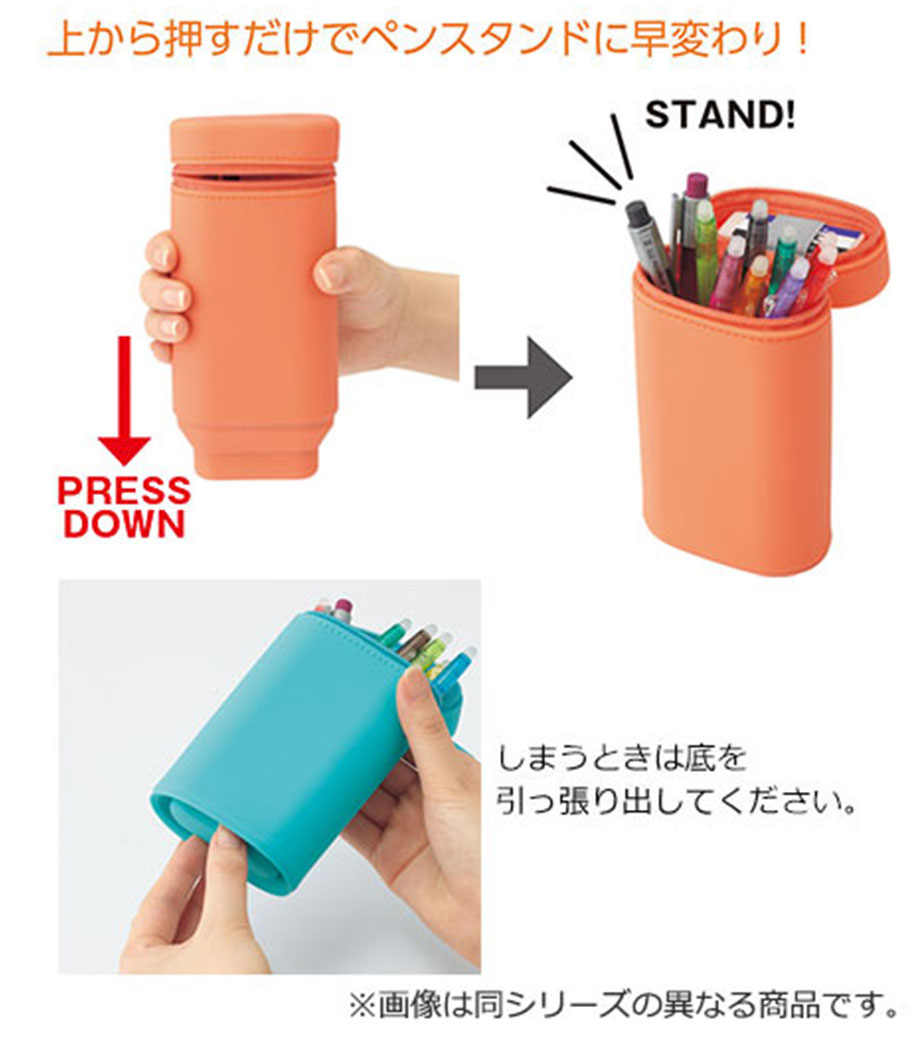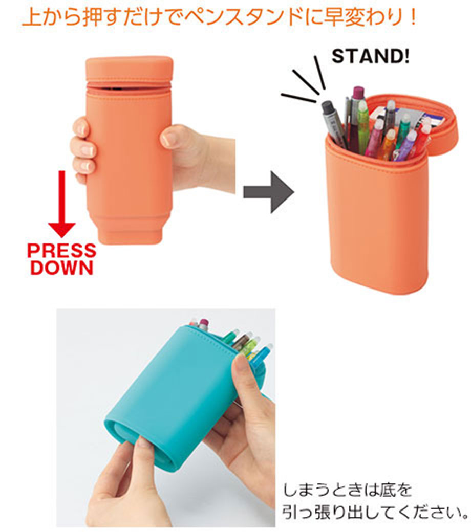 SMART FIT ACTACT スタンドペンケースは、デスクでペンスタンドのように立てて使えるペンケースです。ペンの収納は約15本。ファスナーを開けて本体を握り、上から押すと底のでっぱりがへこんでペンスタンドに早変わり!使いたいペンが一目で見つかるので、筆記作業がスムーズ。しまうときは底を引っ張り出すとペンケースに戻ります。