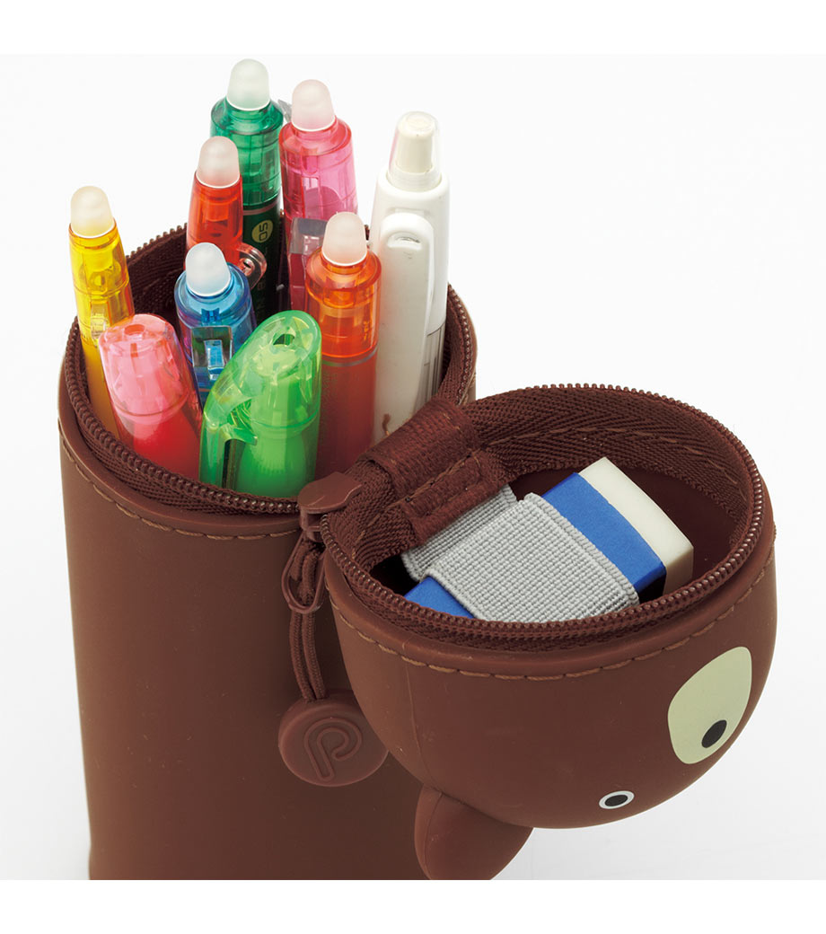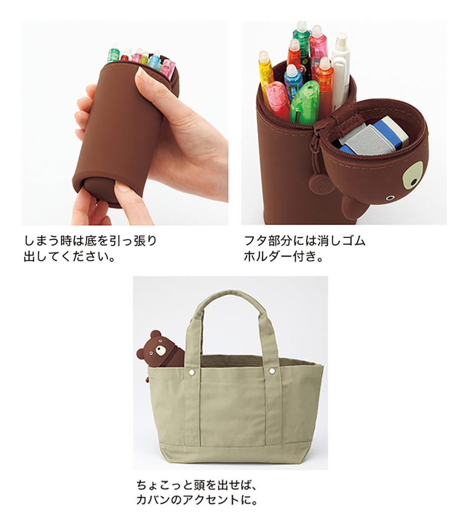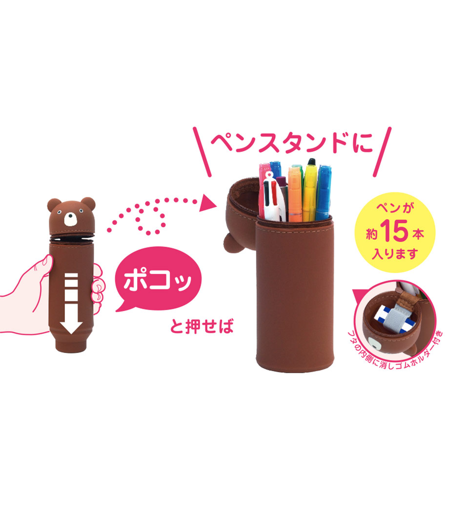 SMART FIT PuniLabo(プニラボ)スタンドペンケースは、デスクでペンスタンドのように立てて使えるペンケースで、ペンは約22本入ります。ファスナーを開けて本体を握り、ポコッと押し下げるとペンスタンドに早変わり!使いたいペンが一目で見つかるので、筆記作業がスムーズに。しまうときは底を引っ張り出すとペンケースに戻ります。フタの内側には消しゴムホルダー付。ペンケースの底に落ちて、全部ペンを取り出さないと消しゴムが出てこない!なんてイライラから解放されますね。