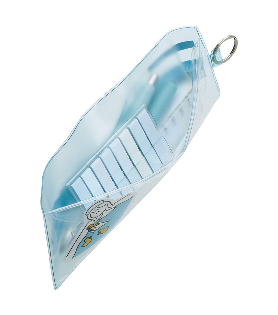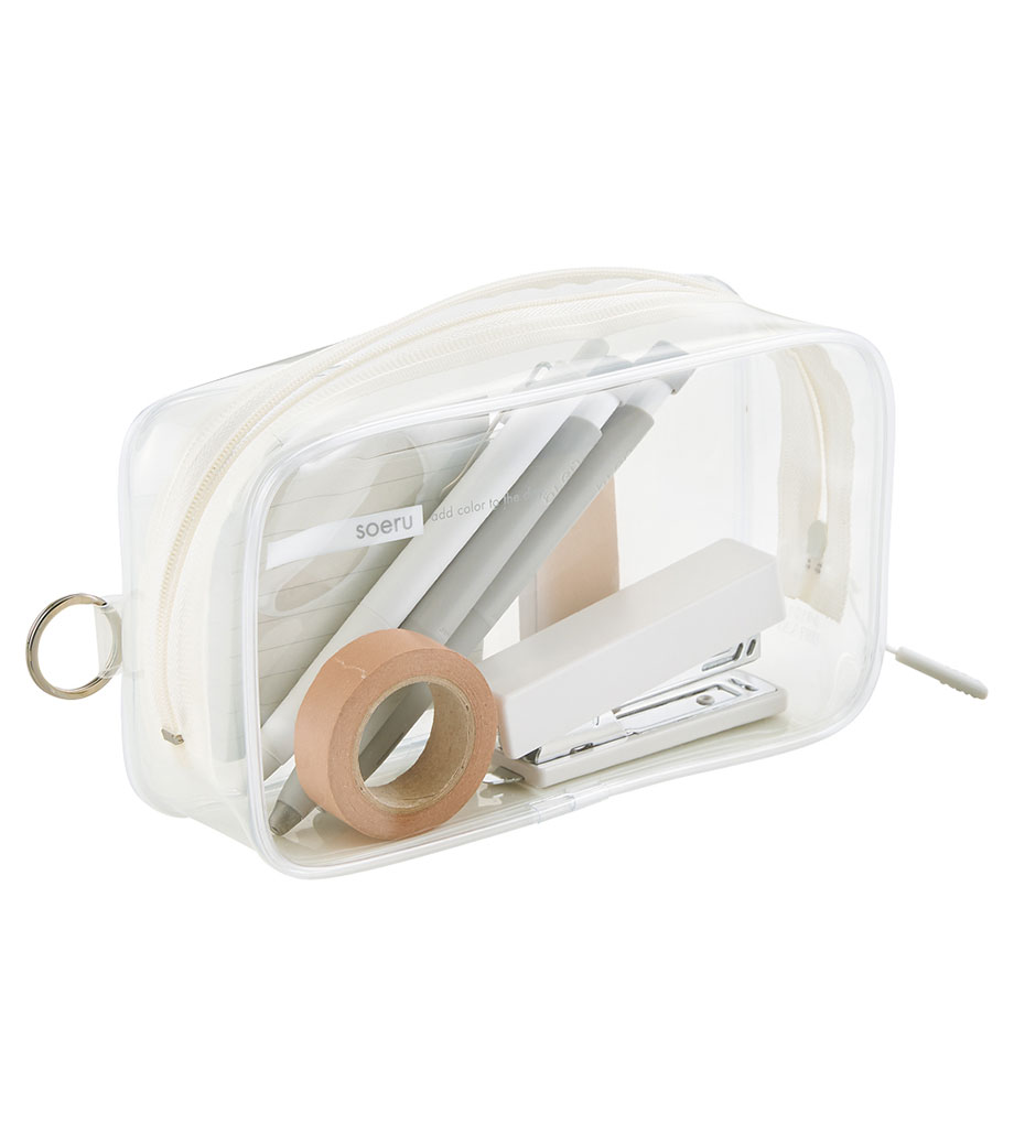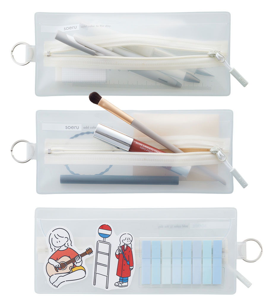 かさばりにくいフラット形状でスマートに持ち歩ける、クリアタイプのペンケースです。背面のフラップ付きポケットで、お気に入りの付箋やステッカーを見せながら収納できます。コスメやリップクリームなど、こまごましたアイテムの収納にも便利。日常に彩りを添えるおしゃれなニュアンスカラーが魅力です。