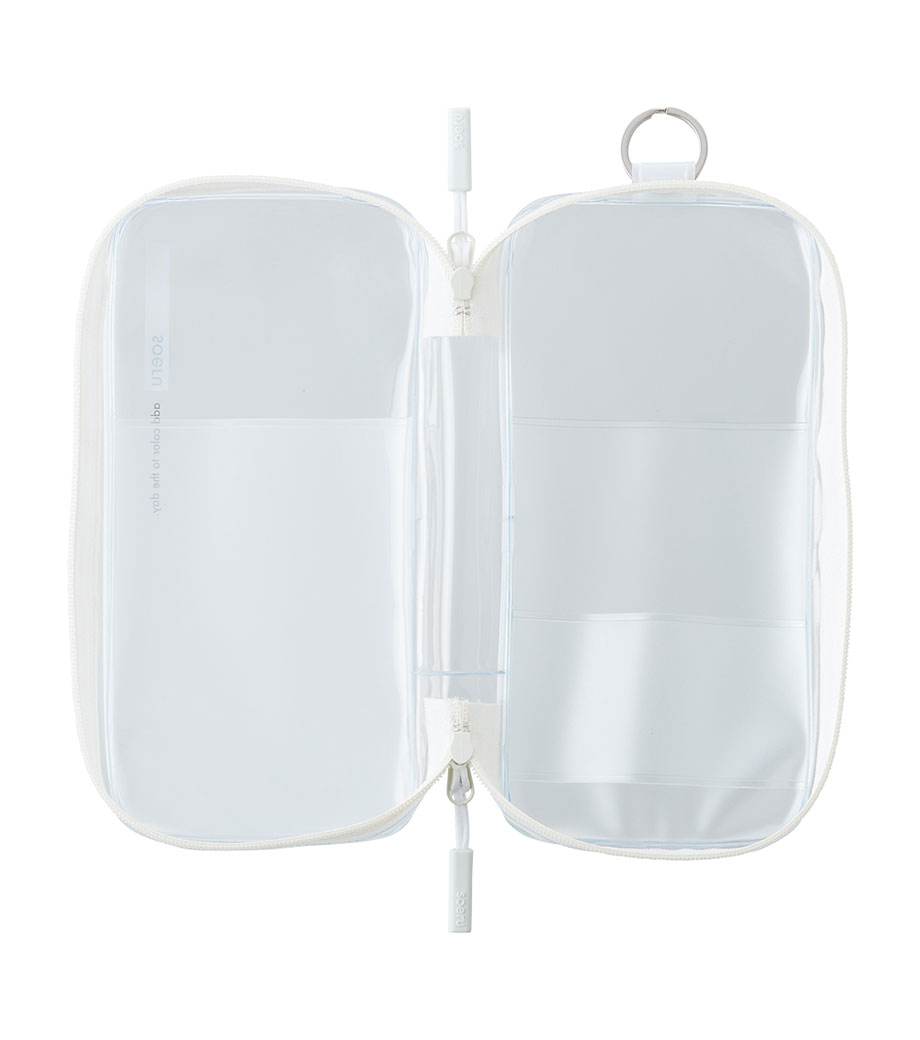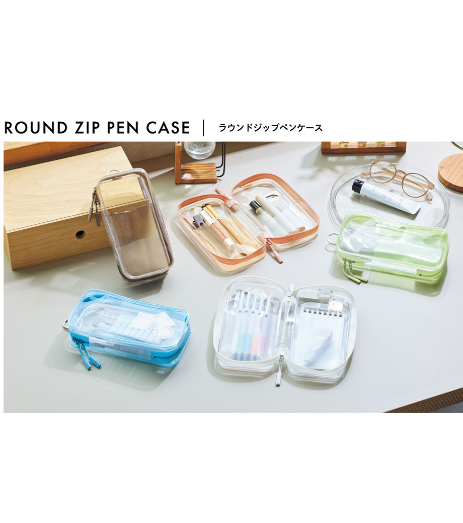 中身がひと目で確認できる、クリア素材のラウンドジップポーチです。見開き仕様で一覧しやすく、2ヶ所のポケットと小物を留められる帯できれいに収納できます。ペンケースとしてはもちろん、トラベル用のポーチやガジェット収納にもおすすめ。おしゃれなニュアンスカラーが日常に彩りを添えてくれます。