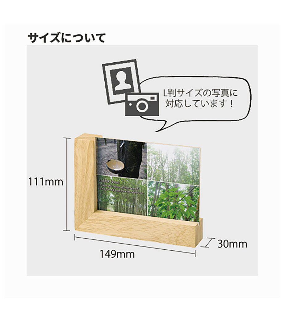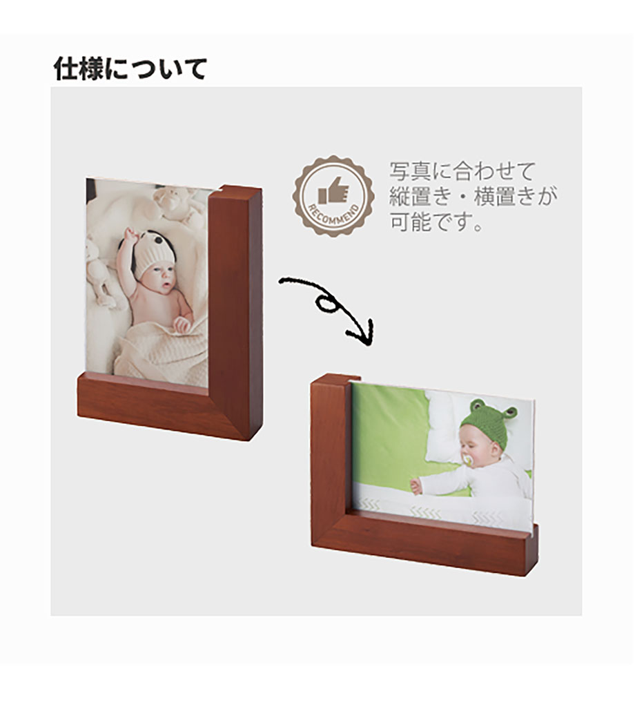 ラバーウッドコーナーフォトスタンドは、入れる写真に合わせて、縦にしても横にしても使えるL型のフォトフレームです。