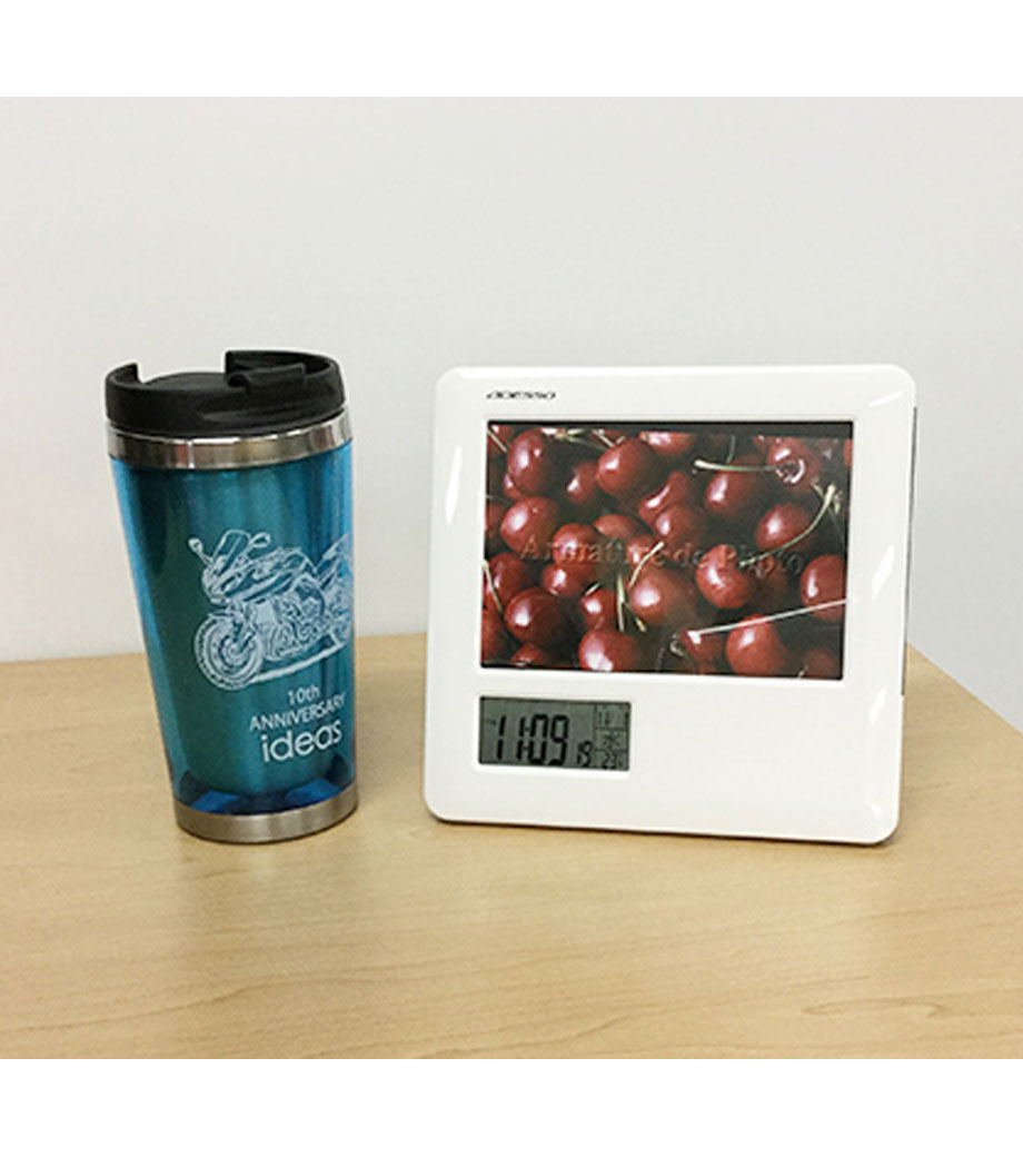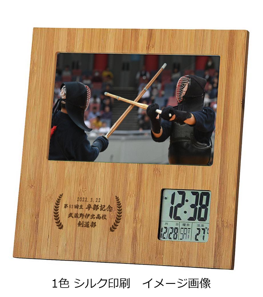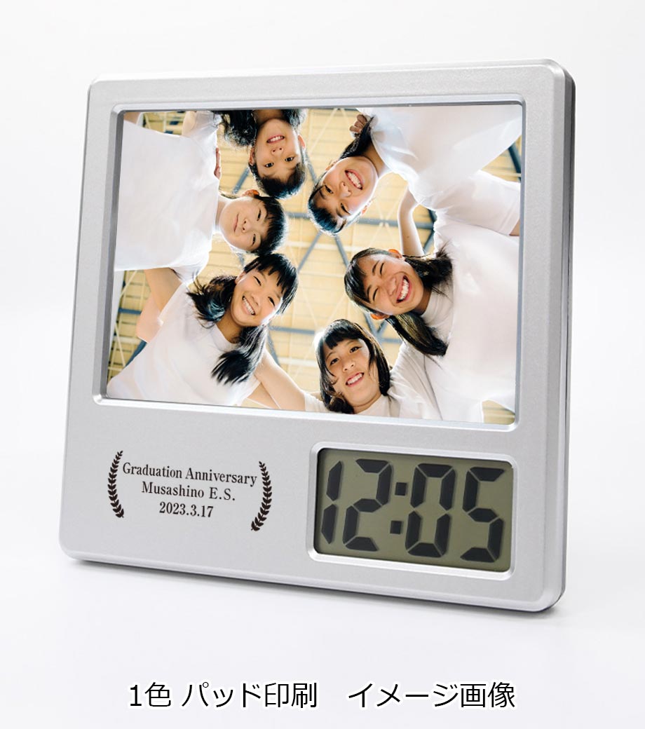 集合写真をいれて卒業記念品に、ポストカードをいれておしゃれなインテリア時計にと、使う人によって自由にカスタマイズ可能。時計液晶横部分に、名入れができます。