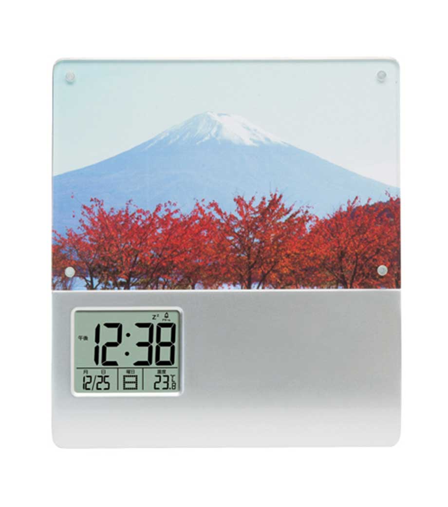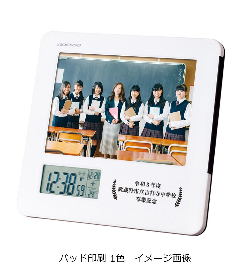 フレームはシンプルなホワイトで、印刷が映えます。目につく時計画面のすぐ横に、名入れができます。学校名や企業名を入れて、卒業記念や周年記念に人気のお品です。クラブやクラス、会社の思い出の集合写真をお仲間と共有できますね。時刻のほか、温度や日付を表示してくれ、アラームやスヌーズ機能も充実しています。
