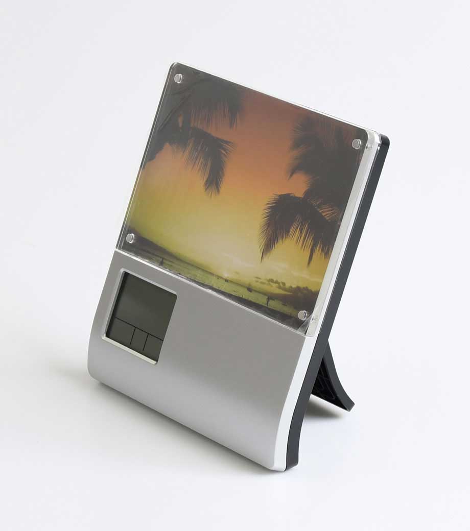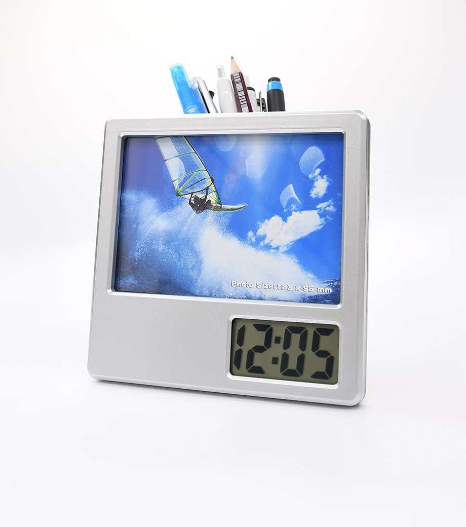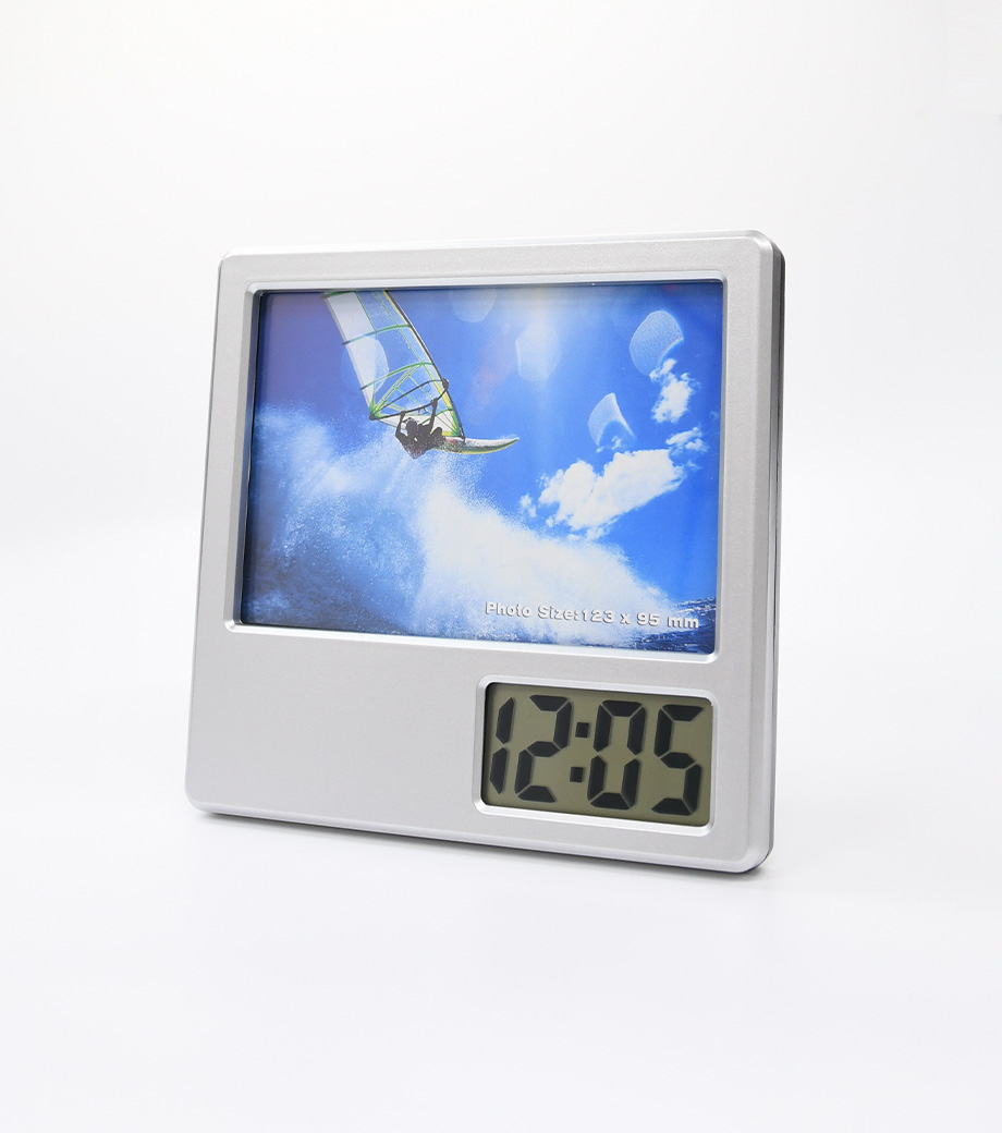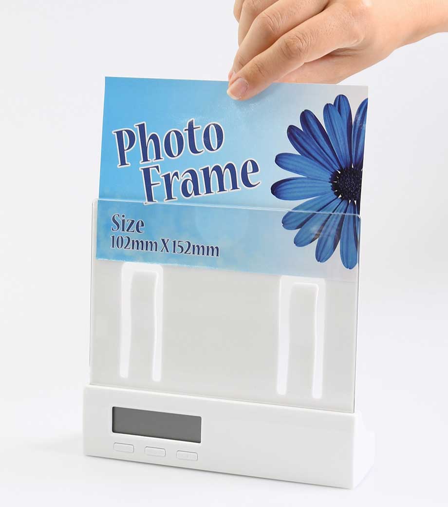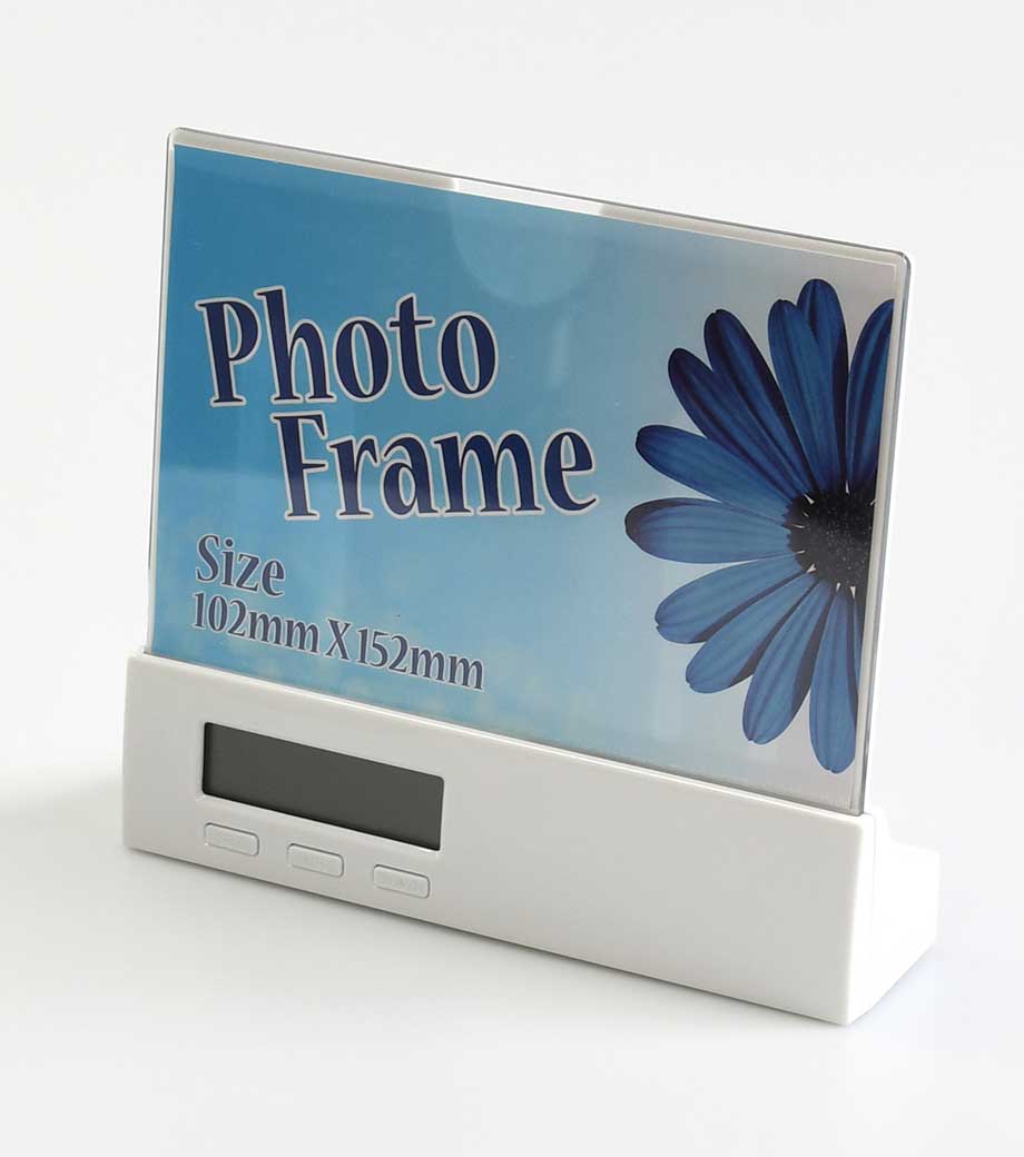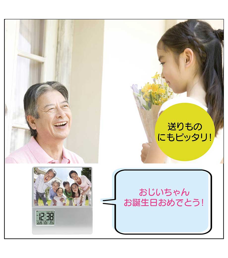 「フォトフレームクロック」は写真を入れてオリジナルの時計にできる記念品にぴったりのアイテム。時刻表示・カレンダー・アラーム・温度計・スヌーズの毎日に必要な機能をしっかり搭載しています。