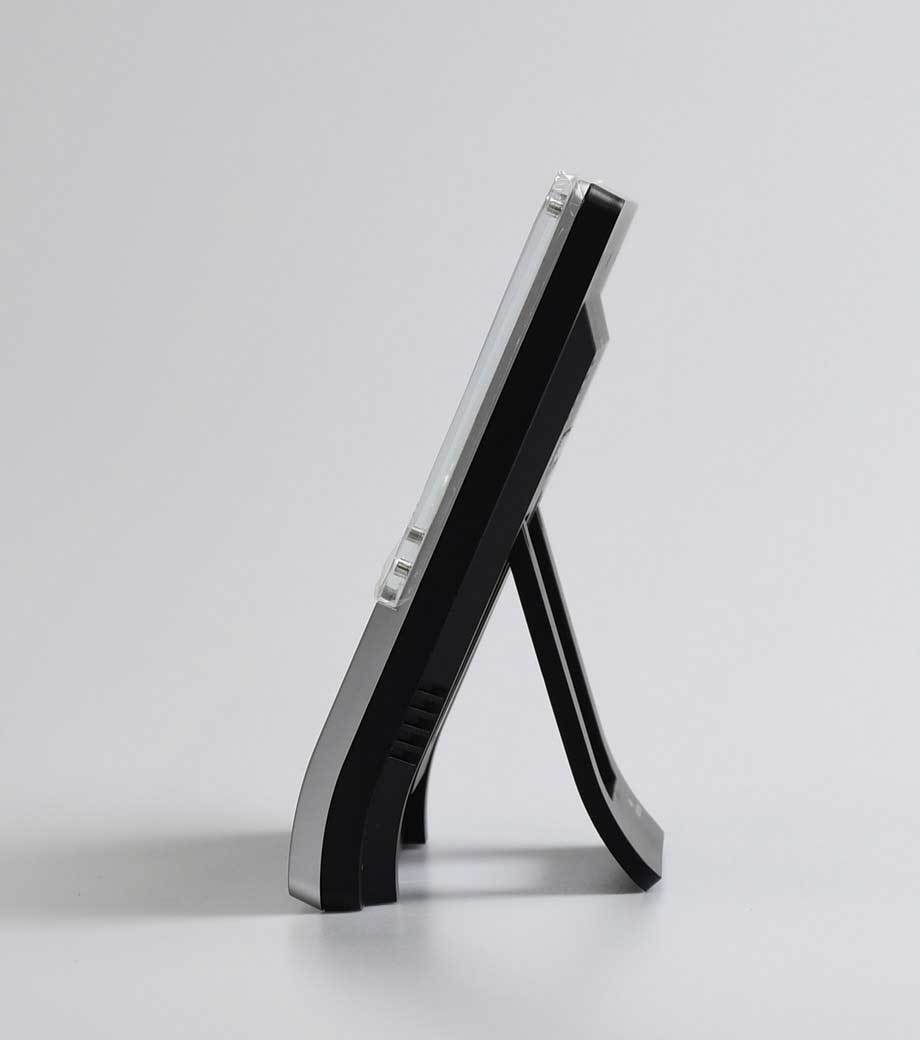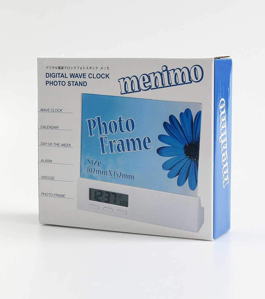 デジタル電波クロックフォトスタンド メニモは、お部屋やデスク上をお気に入りの写真で彩る置き型タイプの時計です。L版サイズの写真やポストカードを手早く簡単に差し替えることができます。アラーム機能とカレンダー付き。曜日が漢字で示されるのでパッと見やすく便利です。