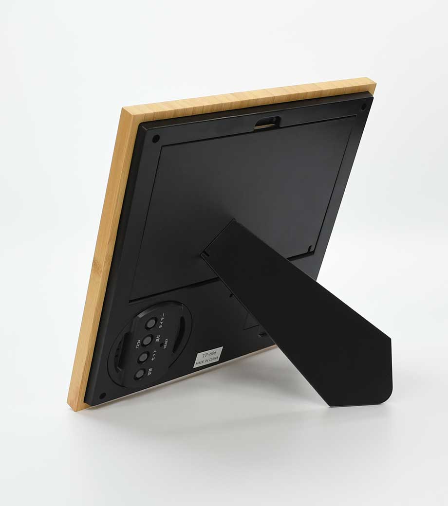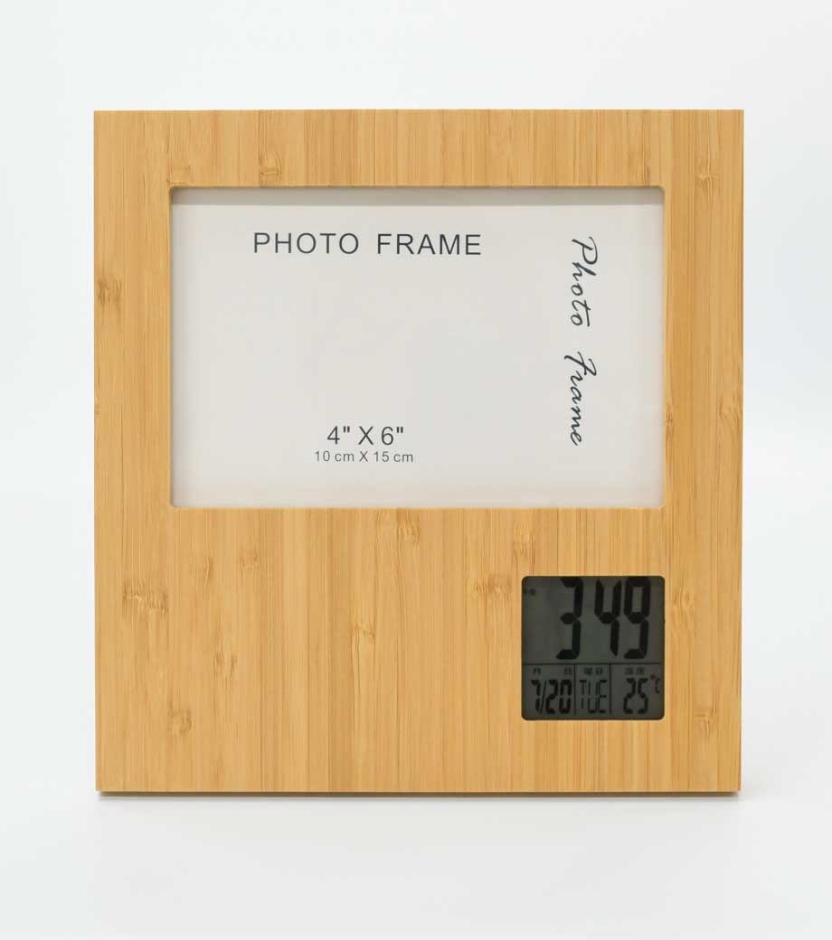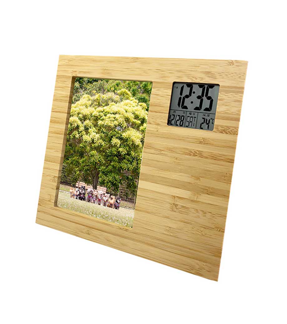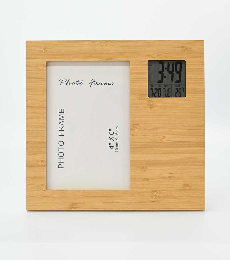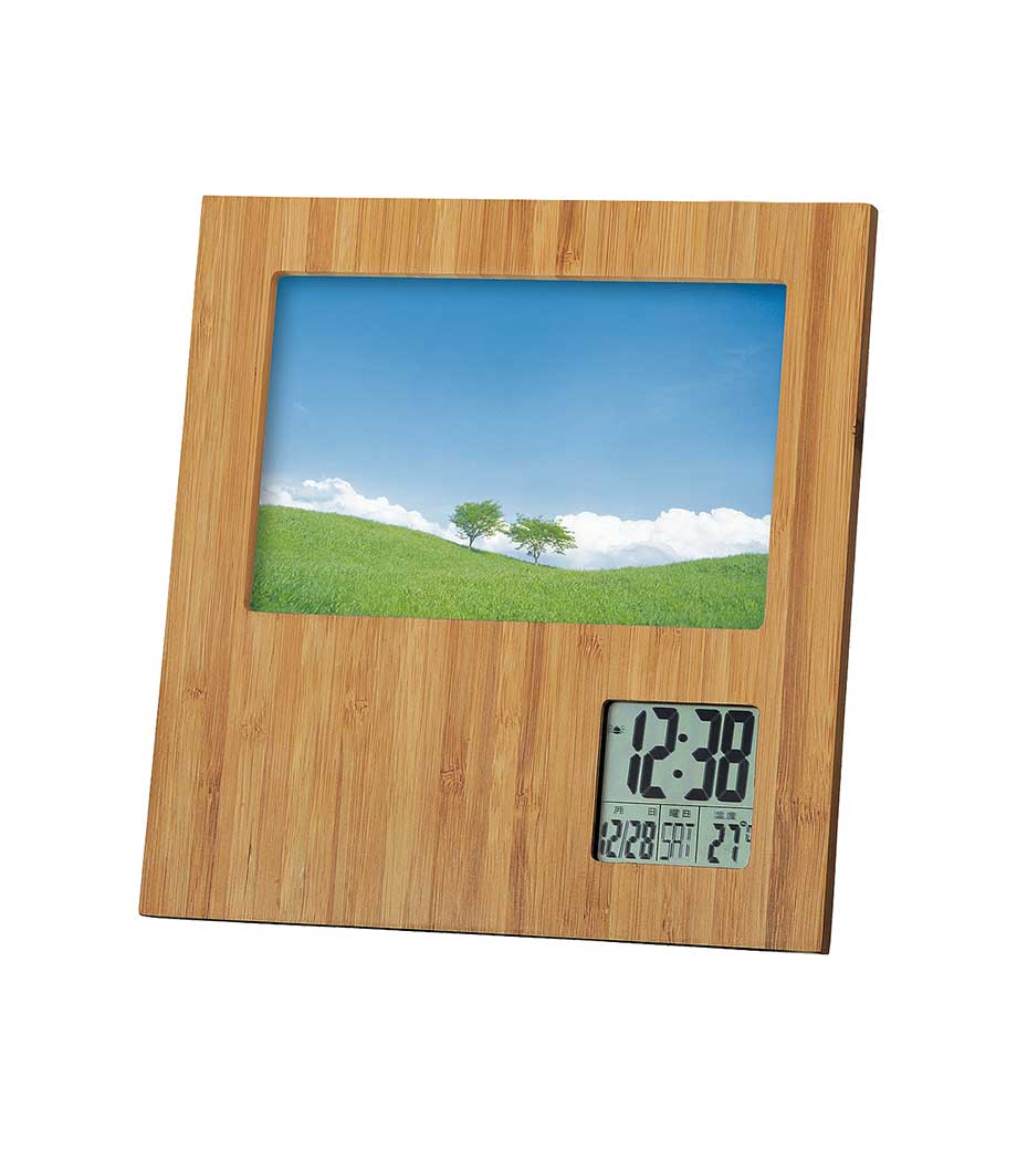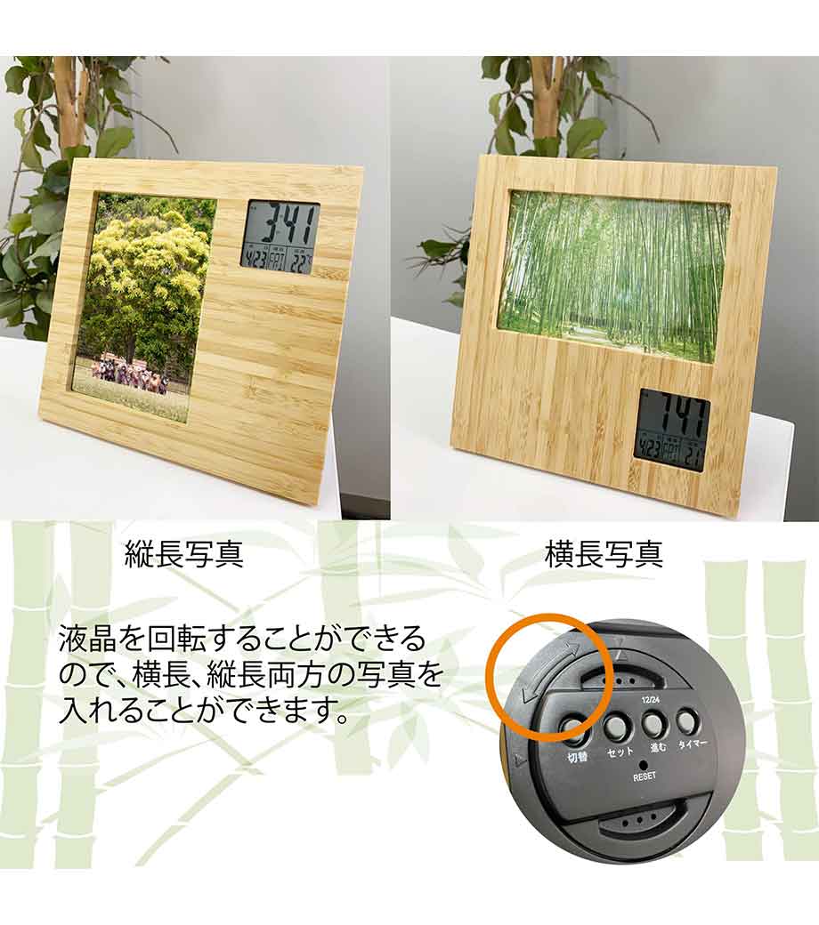 竹のフォトフレームクロックは液晶部分を回転することにより、写真の向きを縦横問わず使用できる商品です。写真は最大でハガキサイズまでセット可能。液晶は時計・カレンダー・温度計として機能するので、思い出の1枚と共に毎日目に留まるところに置いておけますね。天然の竹の風合いがどんなインテリアにも馴染みます。