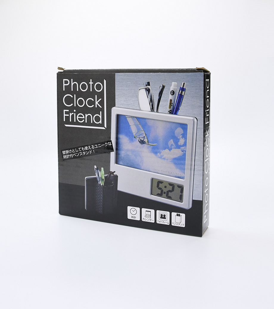 「フォトクロックフレンド」は、時計・カレンダー・フォトフレーム・ペンスタンドが付いたマルチ機能ペンスタンド。ペンスタンド部分を折りたためば、壁掛け時計としても使えます。置く場所を選ばないシンプル&スリムなデザイン。フォトフレームにお気に入りの写真が入れて楽しめます。