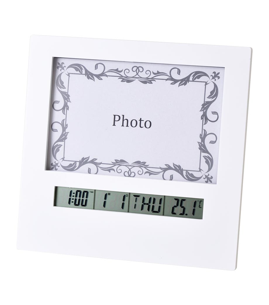フォトフレームクロックは、時計・カレンダー・フォトフレーム・アラーム・温度計・カウントダウンタイマー・誕生日お知らせアラームが付いた多機能クロック。置く場所を選ばないシンプルなデザインで、フォトフレームはハガキサイズ対応。お気に入りの写真やポストカードを入れて楽しめます。