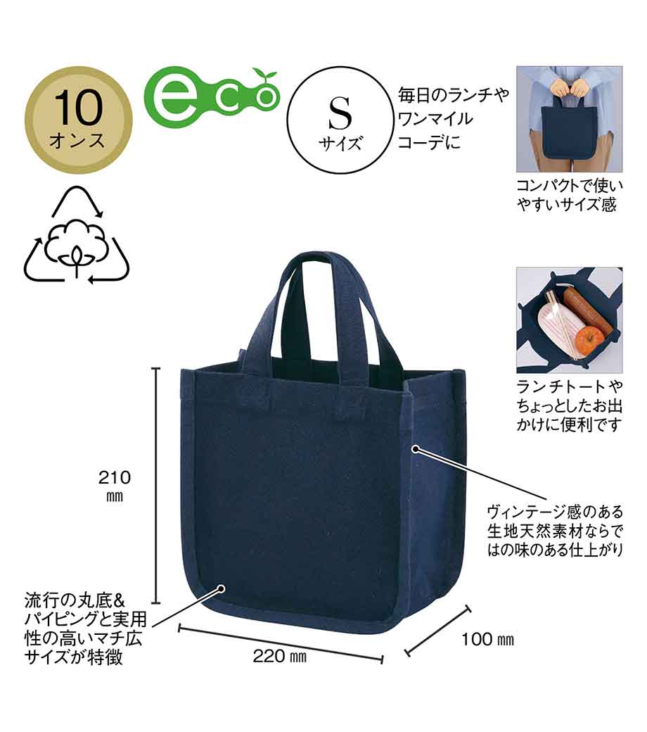 キャンバストートSはランチタイムやちょっとそこまでのお供に便利なミニトートバッグ。しっかり厚手の12オンス生地で耐久性はバッチリ。デイリーに使用できます。