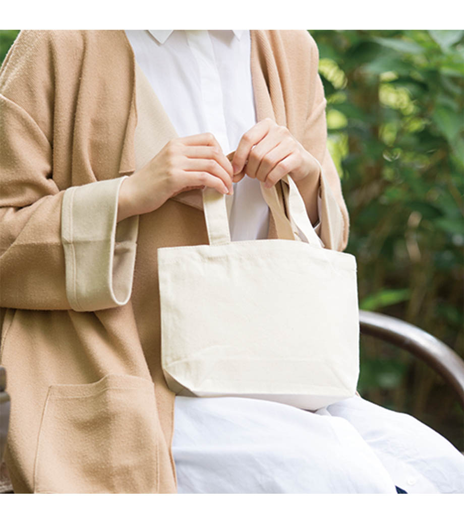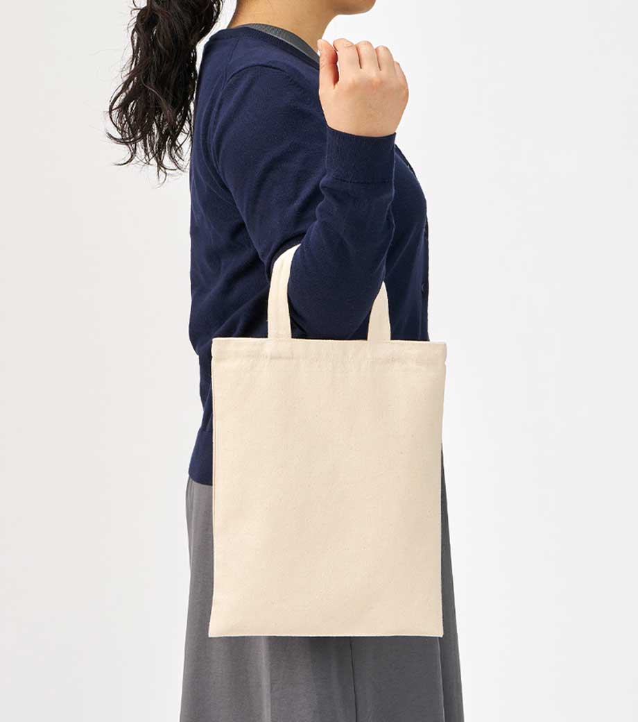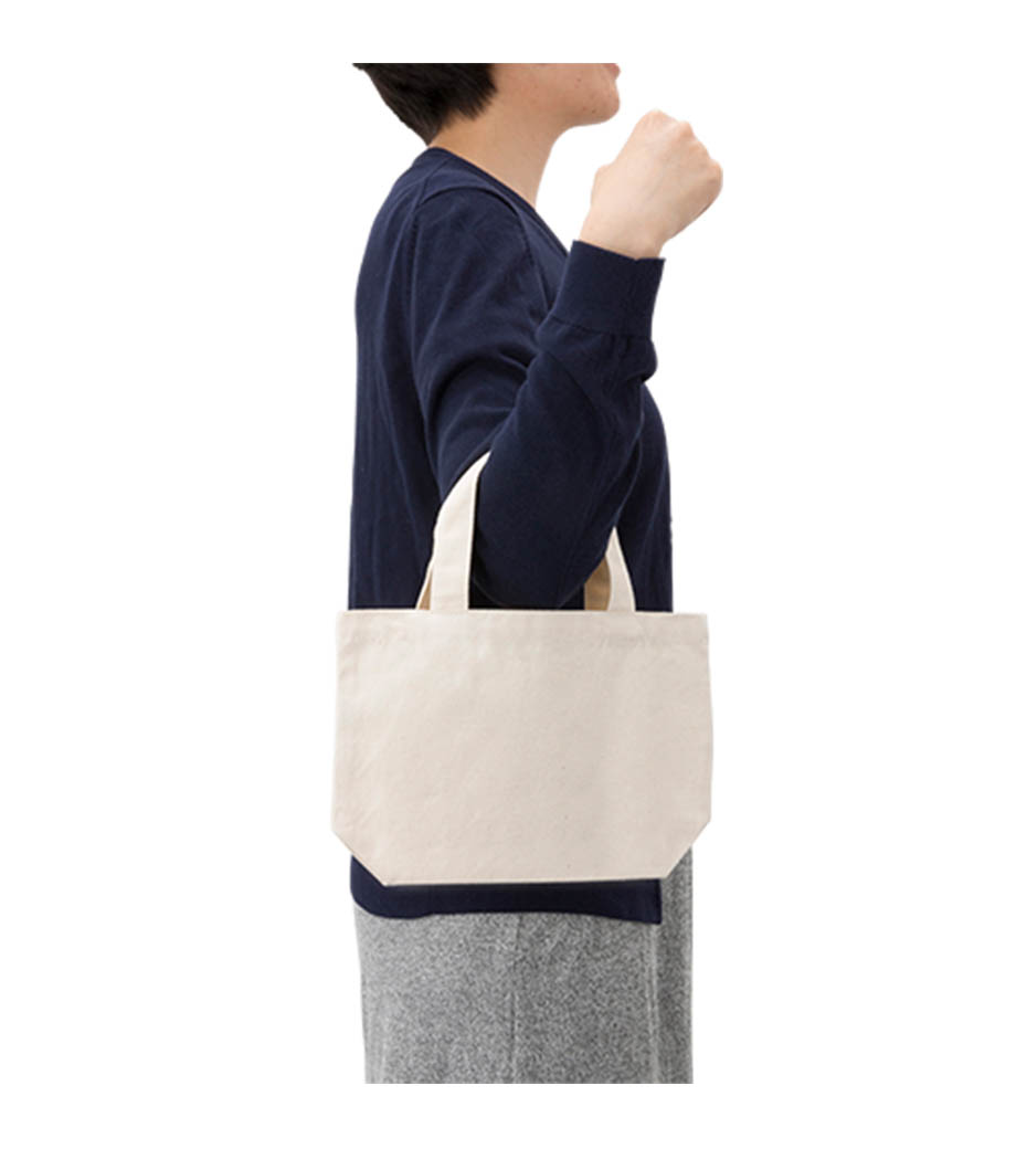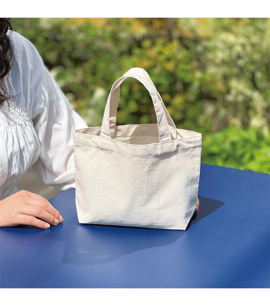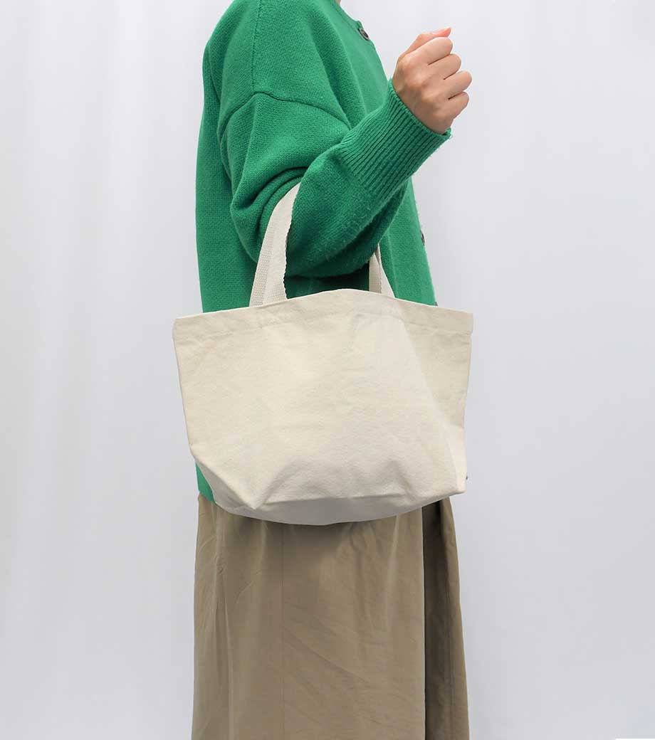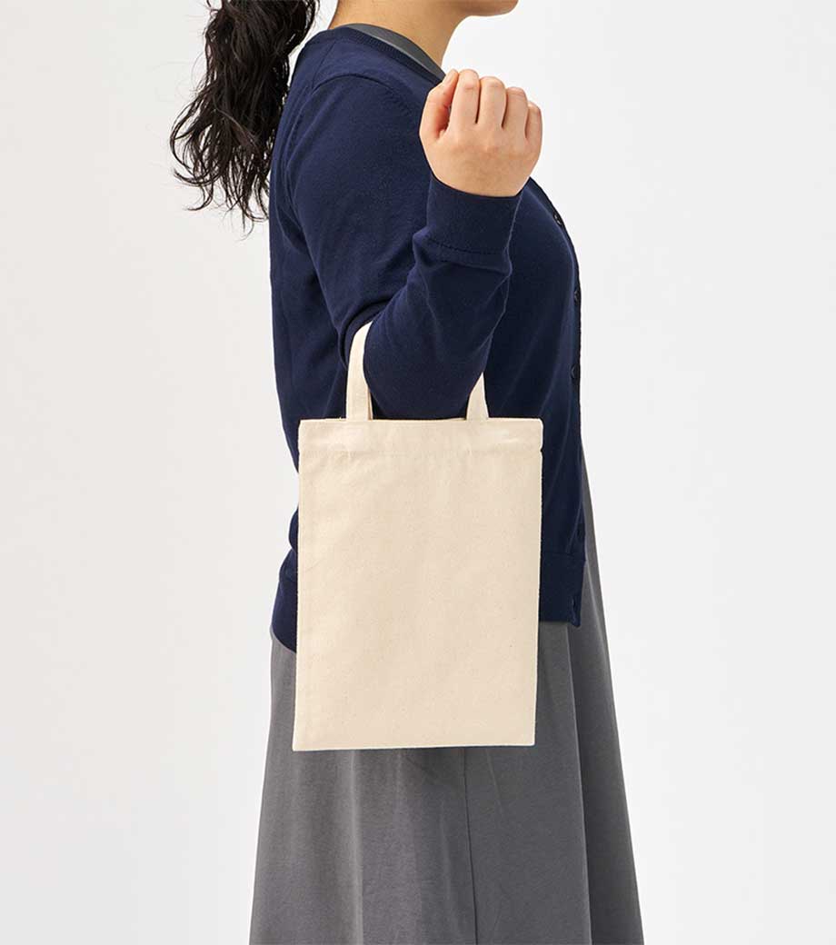 キャンバストート(S)は、コンパクトサイズなのに意外に入るミニバッグ。マチが広めで、安定感のあるデザインです。お弁当や小物などの持ち歩きにいかが。しっかりした生地でコットン100%のナチュラルな風合いが楽しめます。カラーバリエーションが豊富なので、企業カラーやイベント・展示会のイメージカラーにあわせてバッグを選ぶことができます。