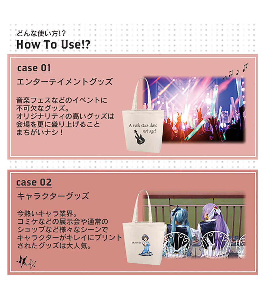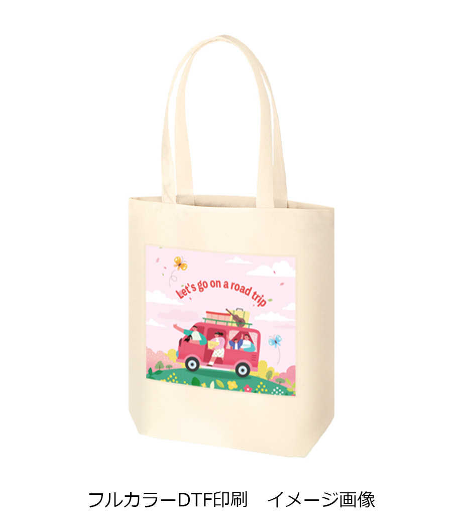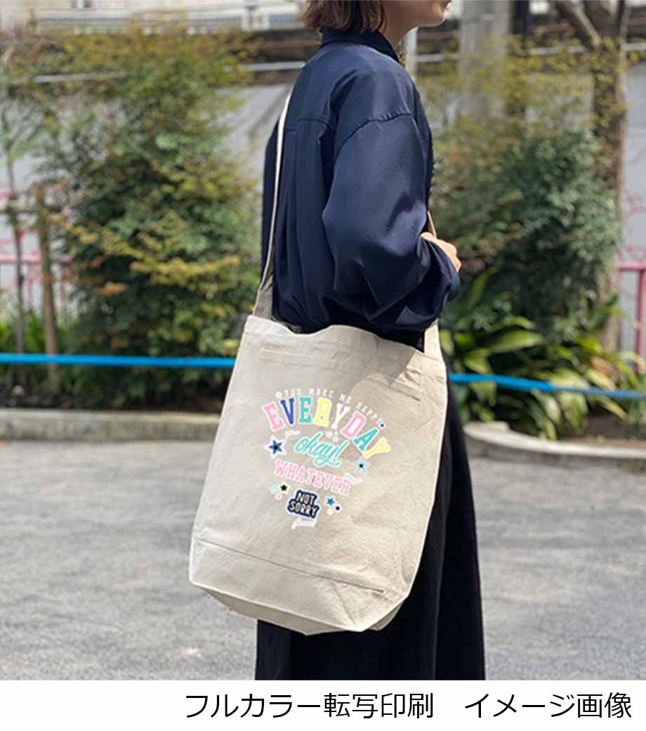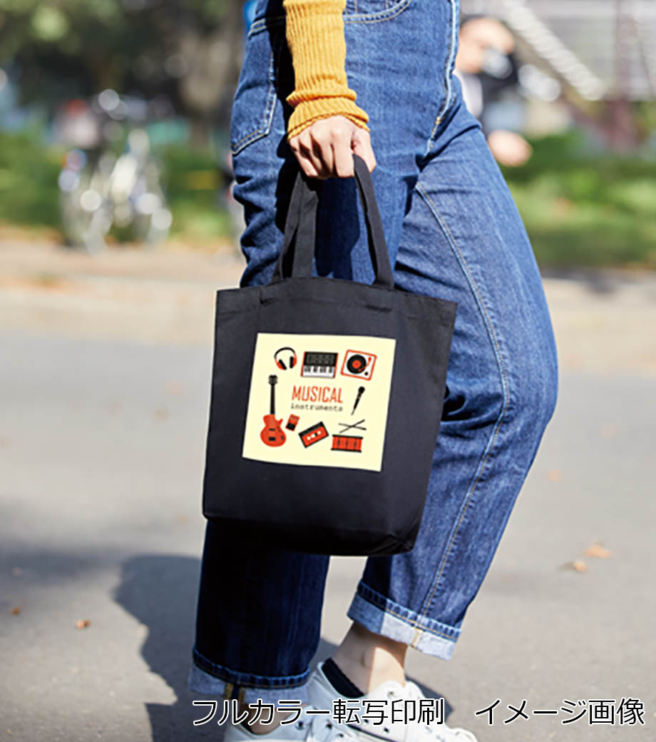 カラーは定番色からカラフル色まで12種類をご用意。印刷は、1色・2色・フルカラー印刷が対応可能。印刷するデザインによってオリジナリティの高いバッグを製作できます。販促ノベルティや同人バッグなど幅広く活用いただけます。