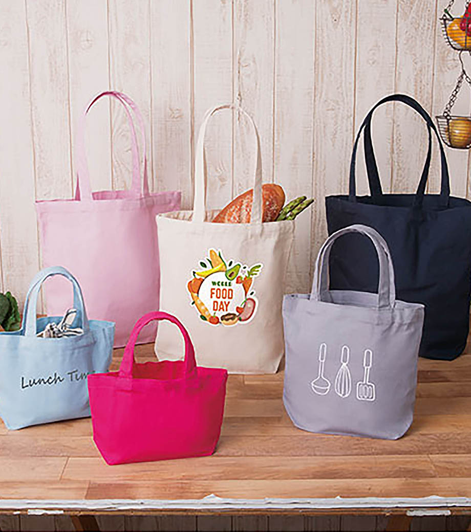 使い勝手の良いA4サイズ、大容量からランチバッグまでサイズを多数ご用意。最大12色の豊富なカラーバリエーションでオリジナルグッズ製作の幅が広がります。