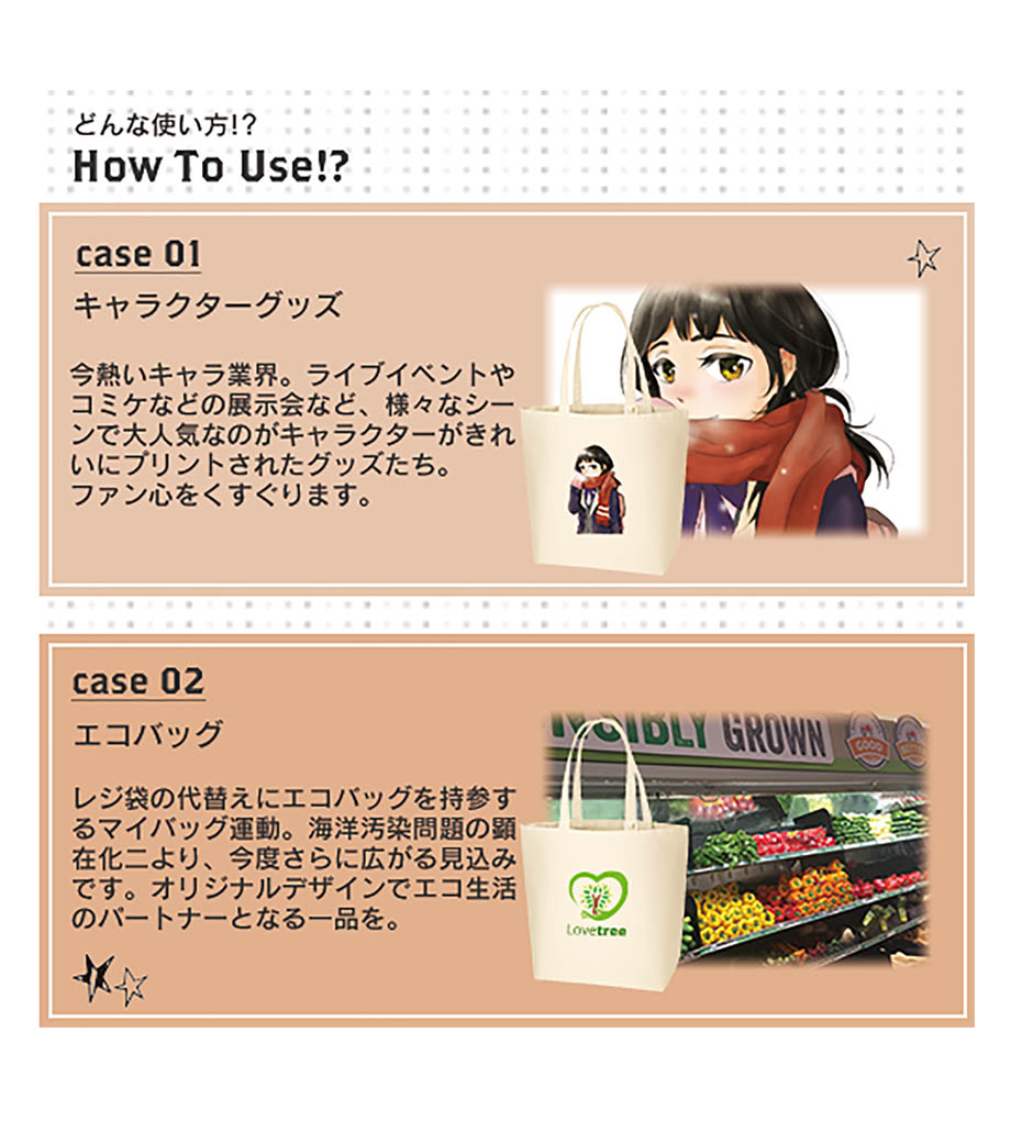 オリジナルキャンバストートバッグにおすすめのプリント方法は3種類。デザインやご希望の仕上がりに合わせて印刷方法をお選びください