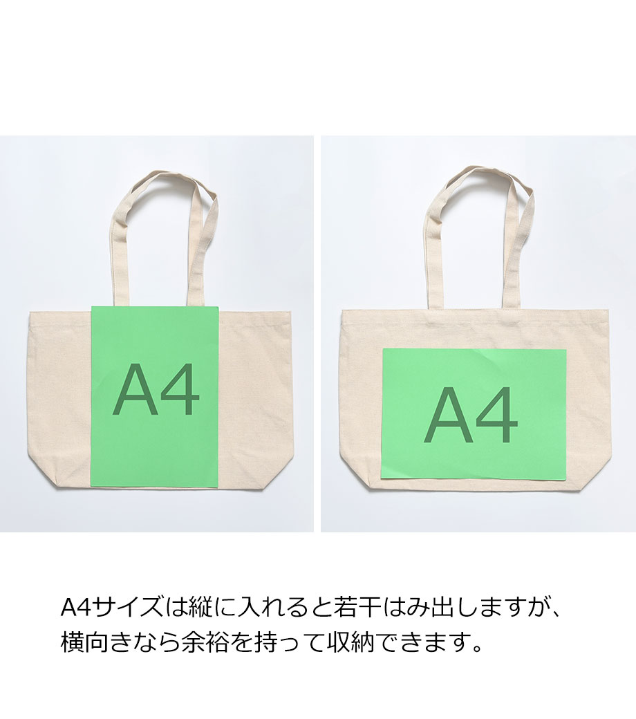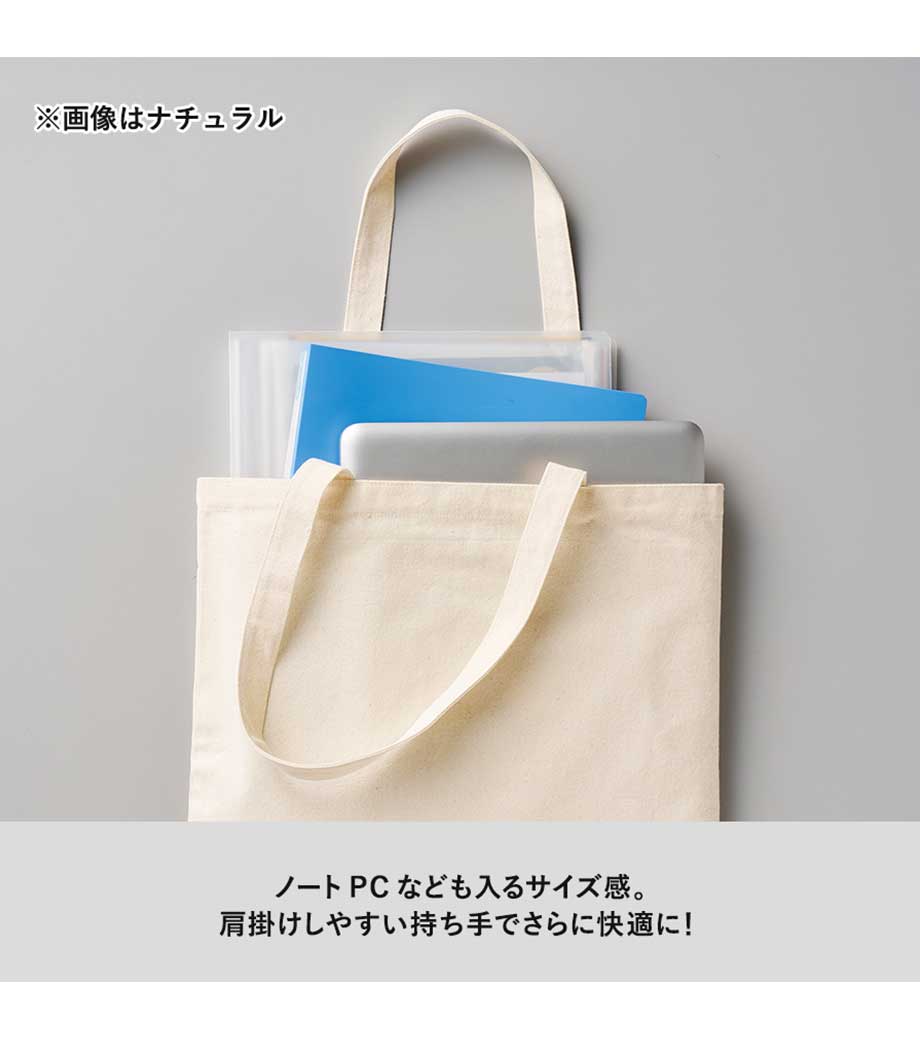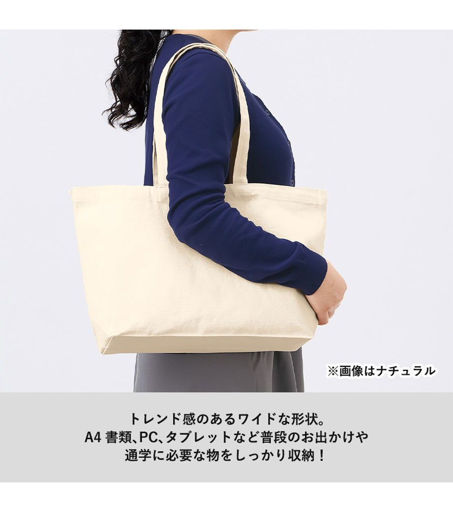 キャンバスカレッジトート(M)ワイドは、A4サイズの書類やファイルがちょうど収まるサイズ。コットントートバッグにはめずらしい横長デザインで、マチもしっかり。通勤・通学のサブバッグやレッスンバッグにぴったりです。