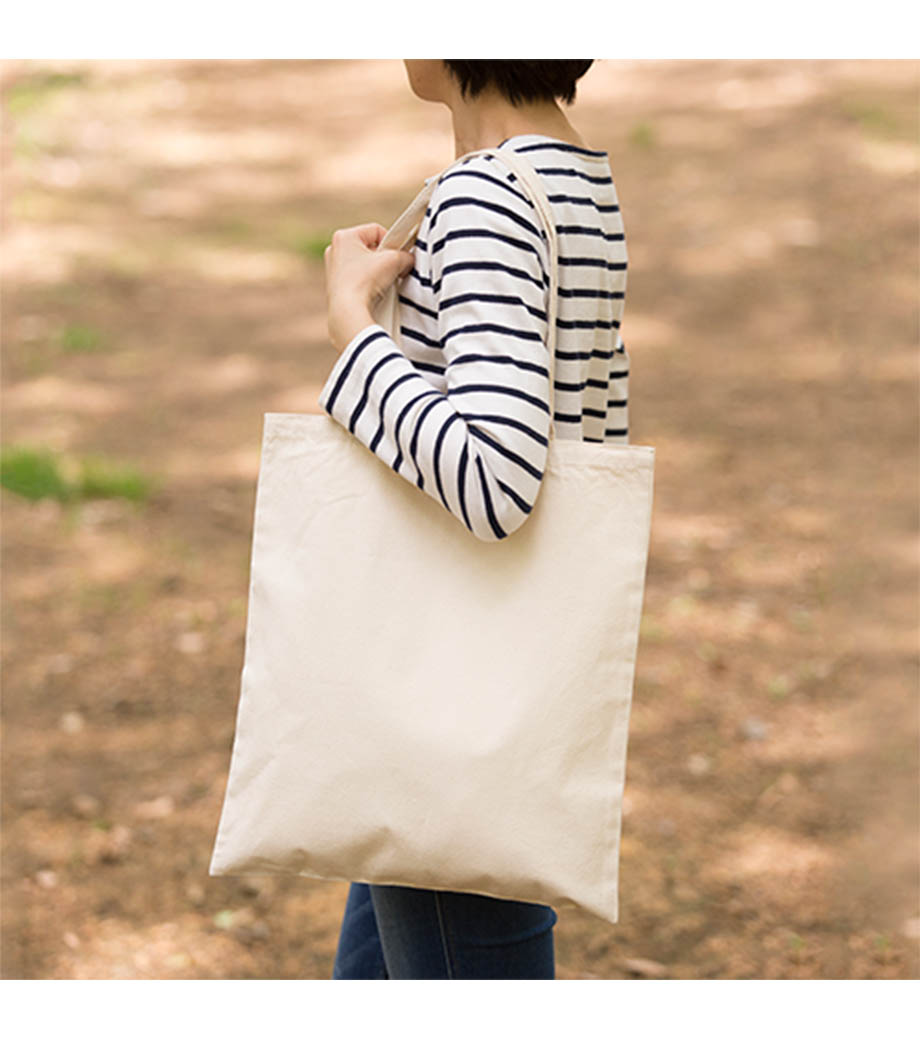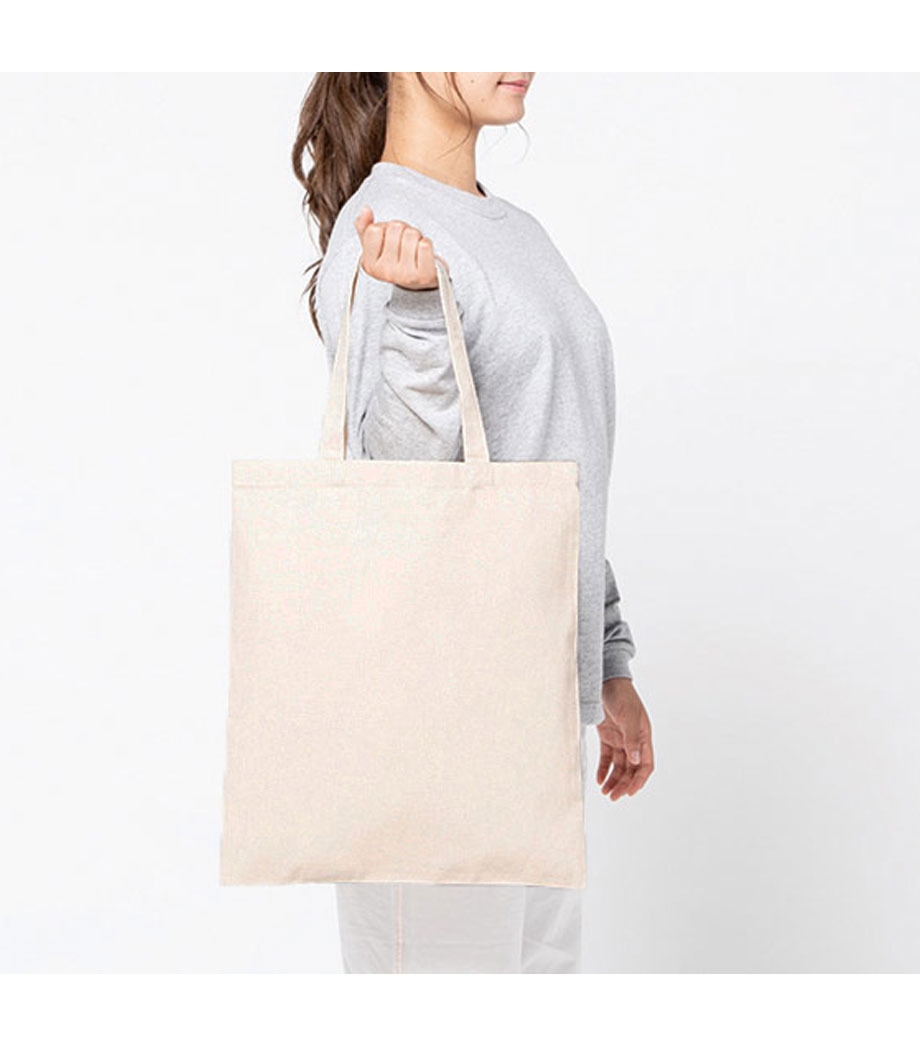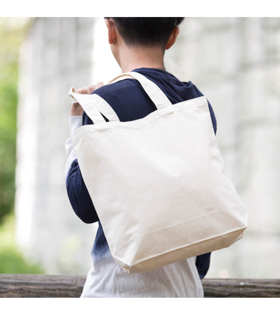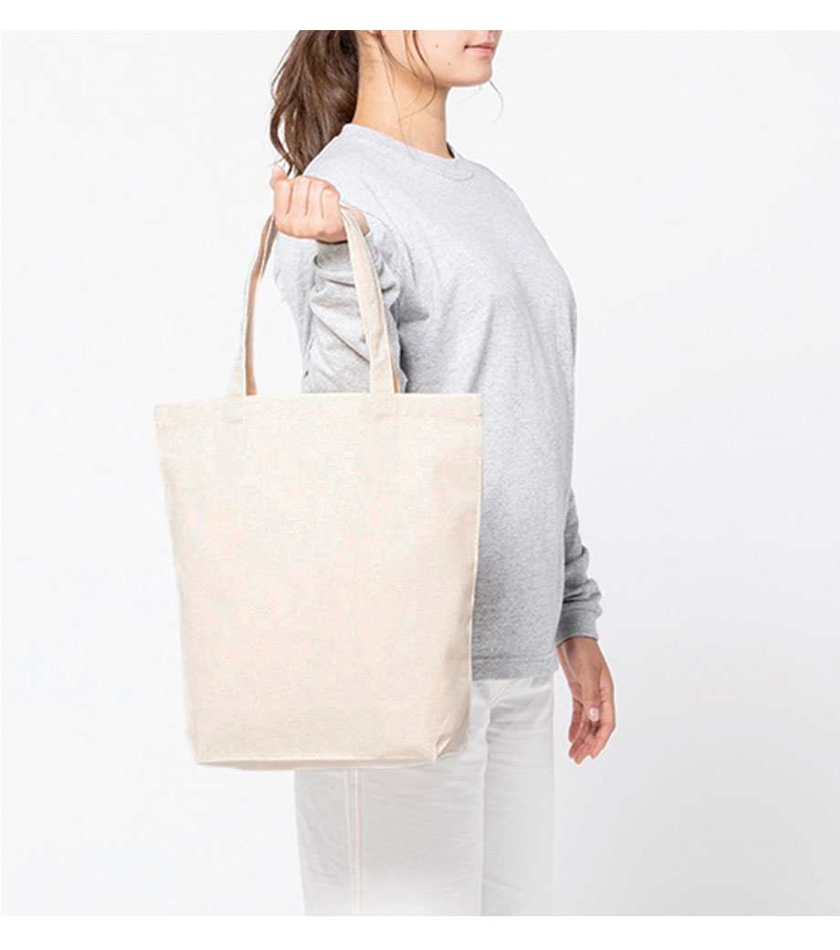 ほどよい大きさで軽い、シンプルなマチなしコットンバッグ。短めのハンドルで資料やパンフレットなど持ち運びにも便利な縦長A4サイズです。ひとつ持っていれば、通勤・通学のサブバッグとしてもマルチに使えて重宝します。