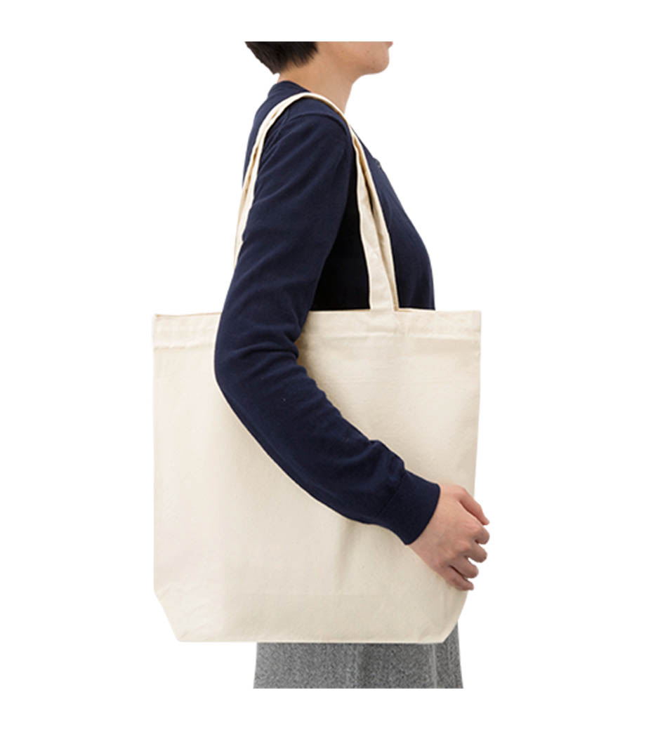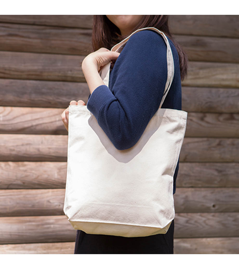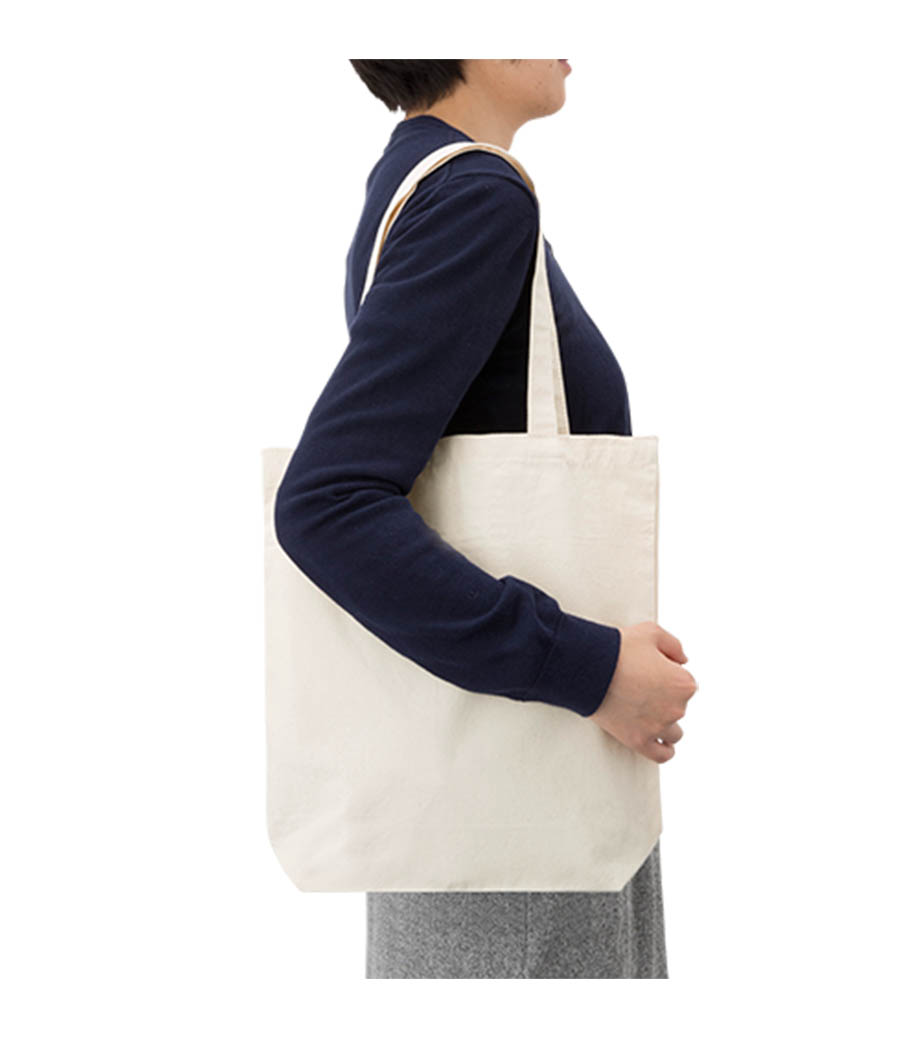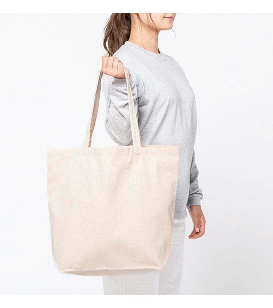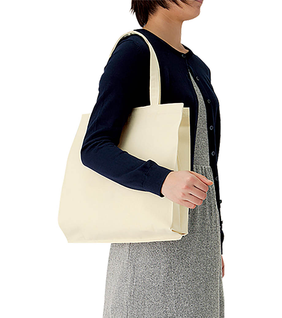 とにかく使いやすいと人気の、ライトキャンバスバッグ横マチ付。約10cmのマチ付タイプで、ごくシンプルなデザインも魅力。荷物が多くても頼れる収納力、厚手素材の丈夫な作りは、ふだん使いにぴったりです。
