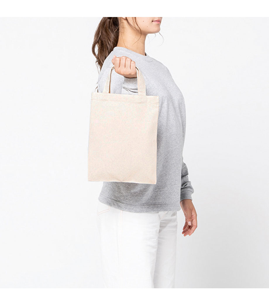 学校・保育園の定番手提げサイズです。印刷面が広く学校や習い事ロゴを印刷してノベルティや宣伝活動におススメです。短めのハンドルでフラットなマチなし。B4サイズがぴったり収まります。8ozは厚すぎないから、お子様にも持ちやすい生地感です。